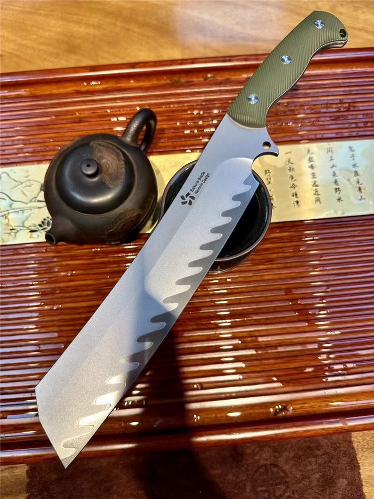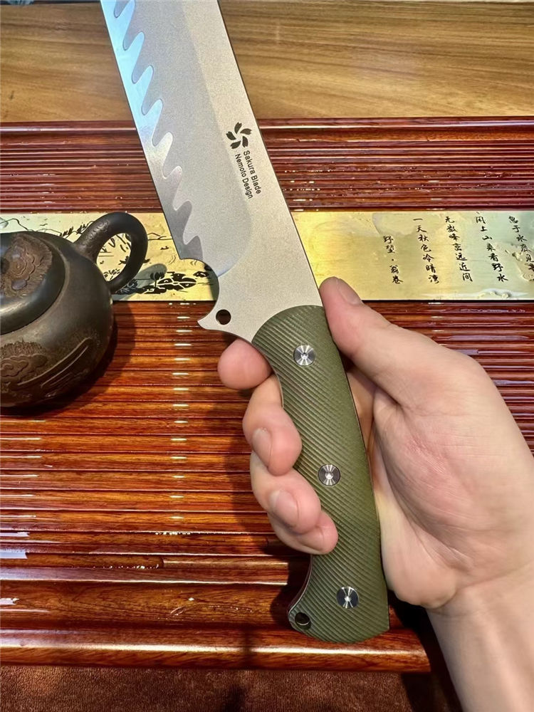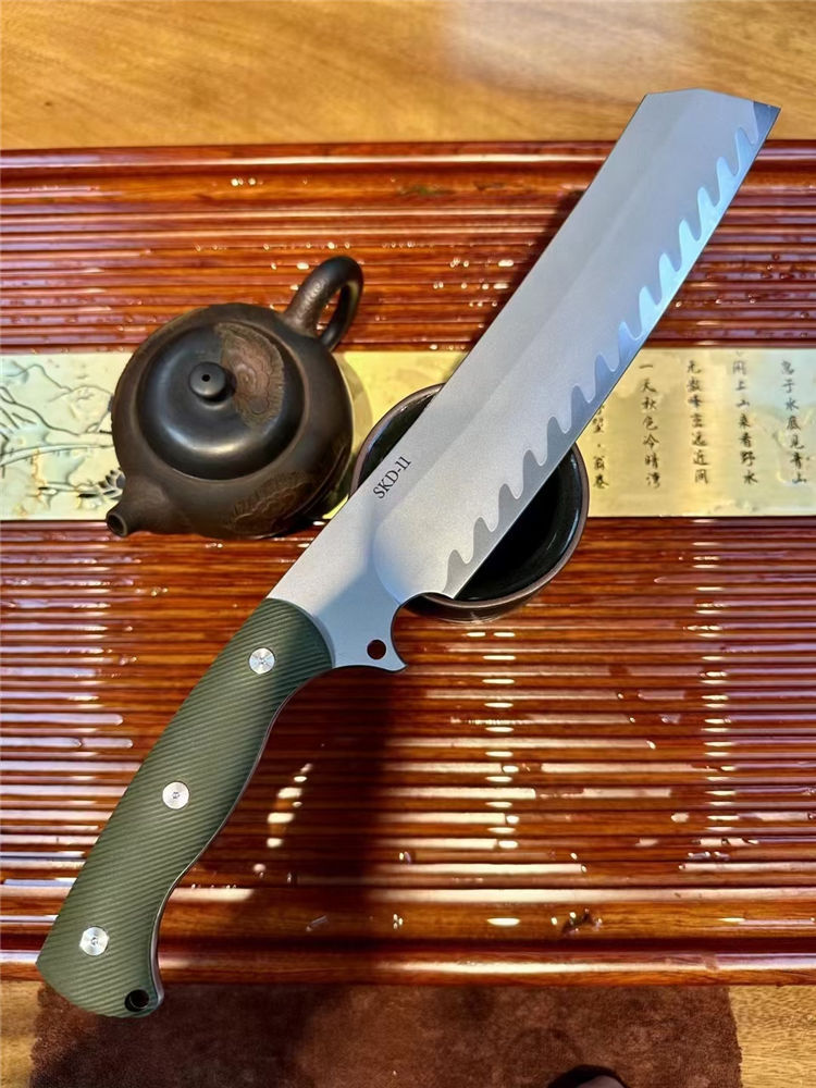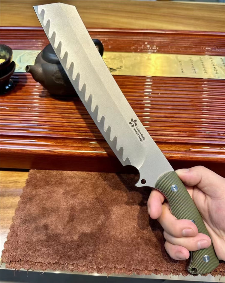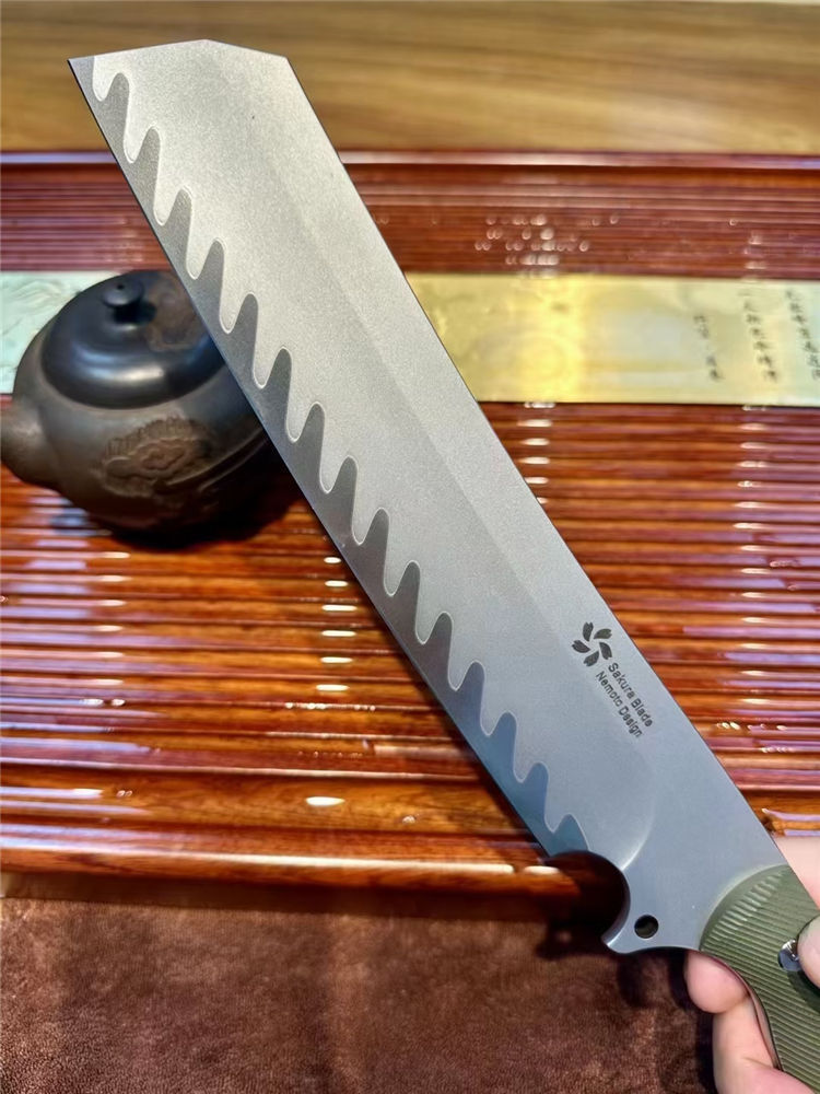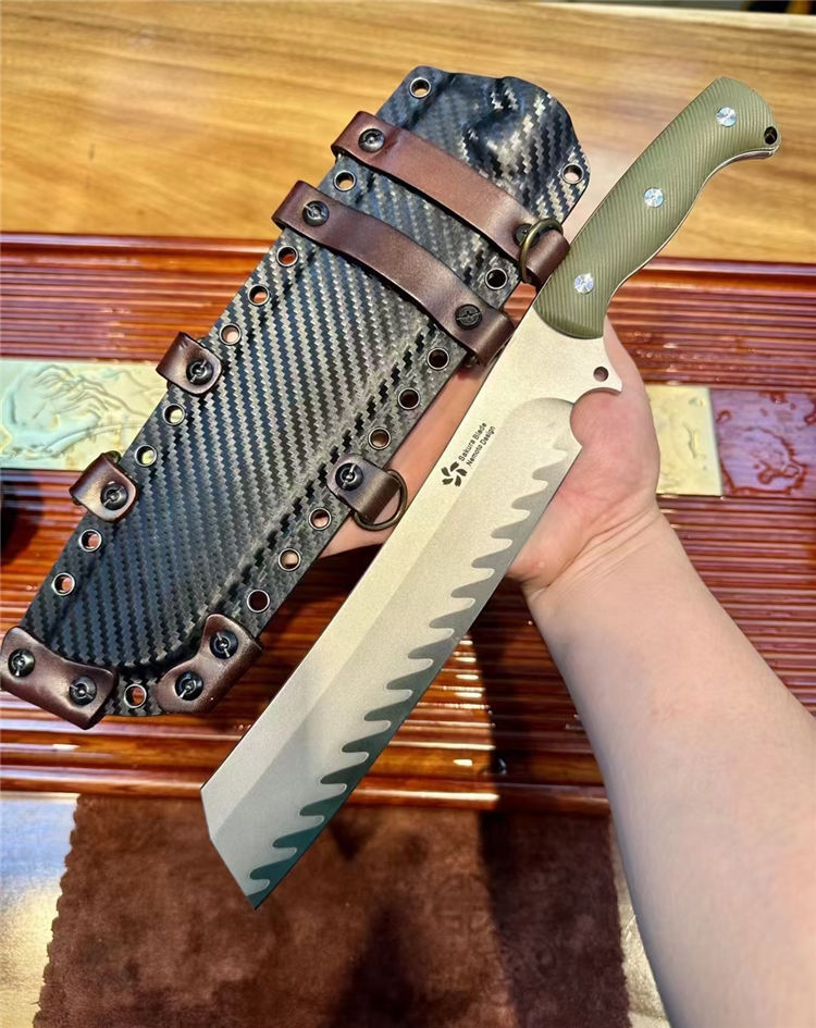根本朋暴怒之日开山砍刀 总长:370mm 刃长:250mm 刃厚:70mm 刃宽:45mm 硬度:61HRC 钢材:日本SKD-11三枚合 手柄:G10CNC雕刻防滑纹 开刃:数控大V磨+手工水冷研磨 刀鞘:碳纤纹K鞘+意大利植鞣牛皮