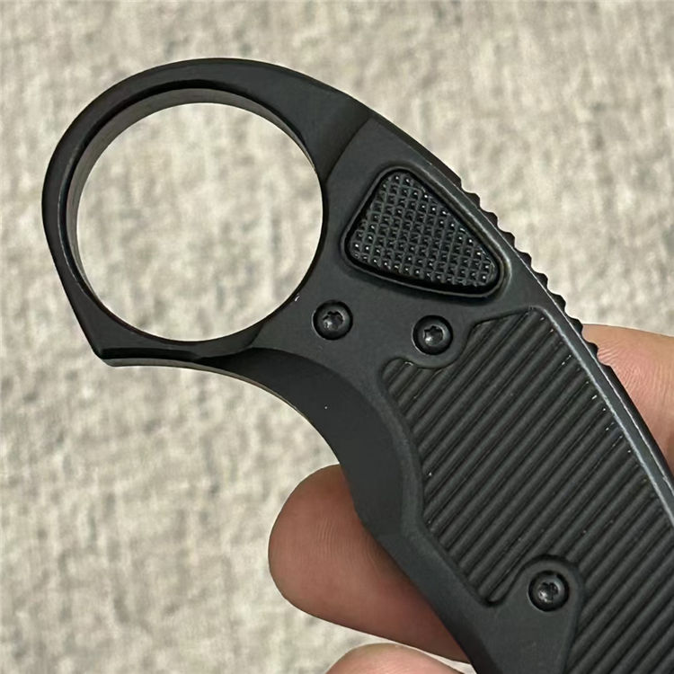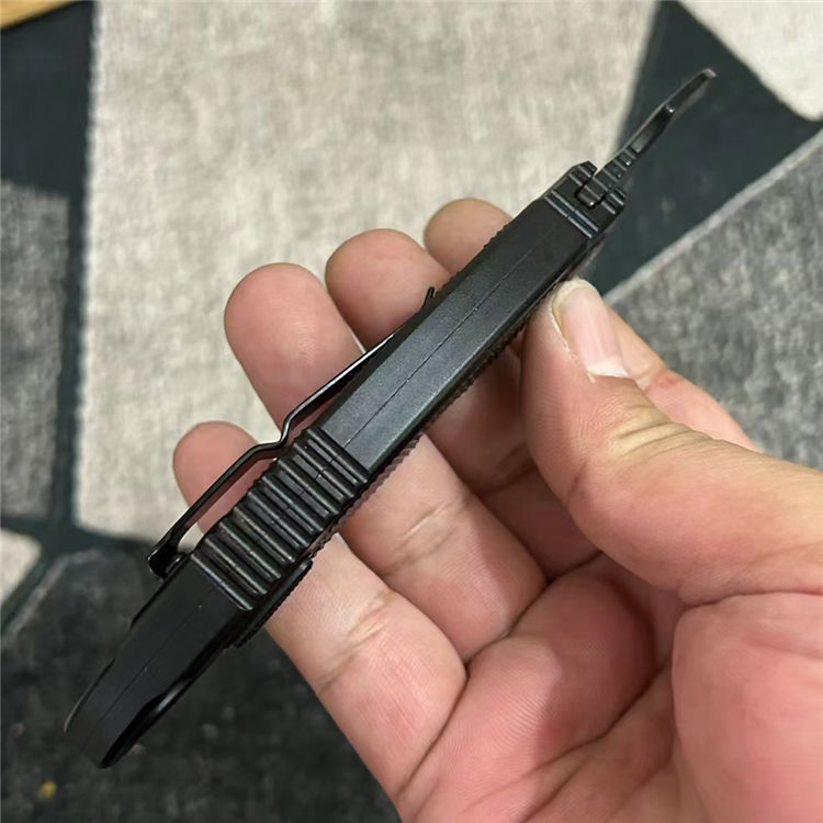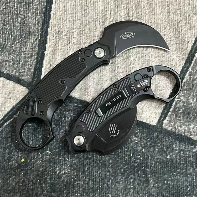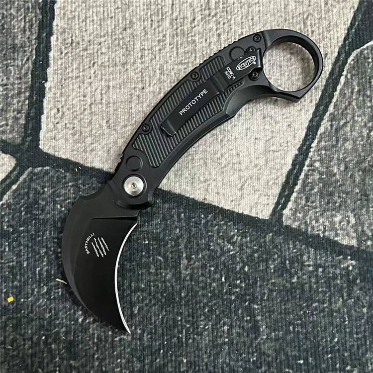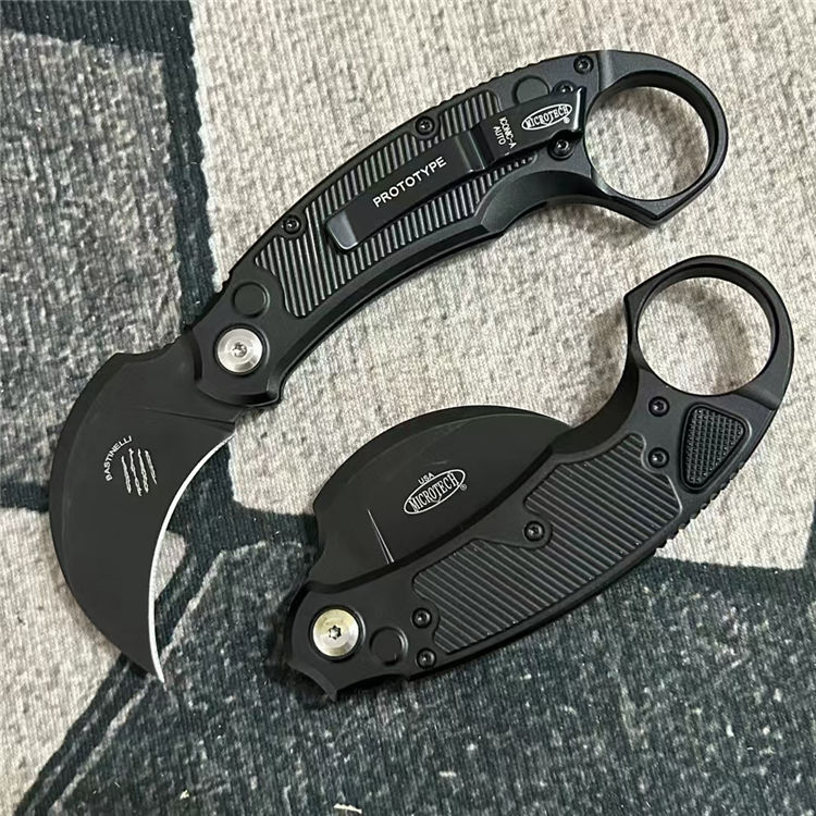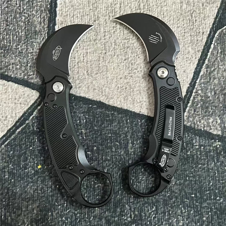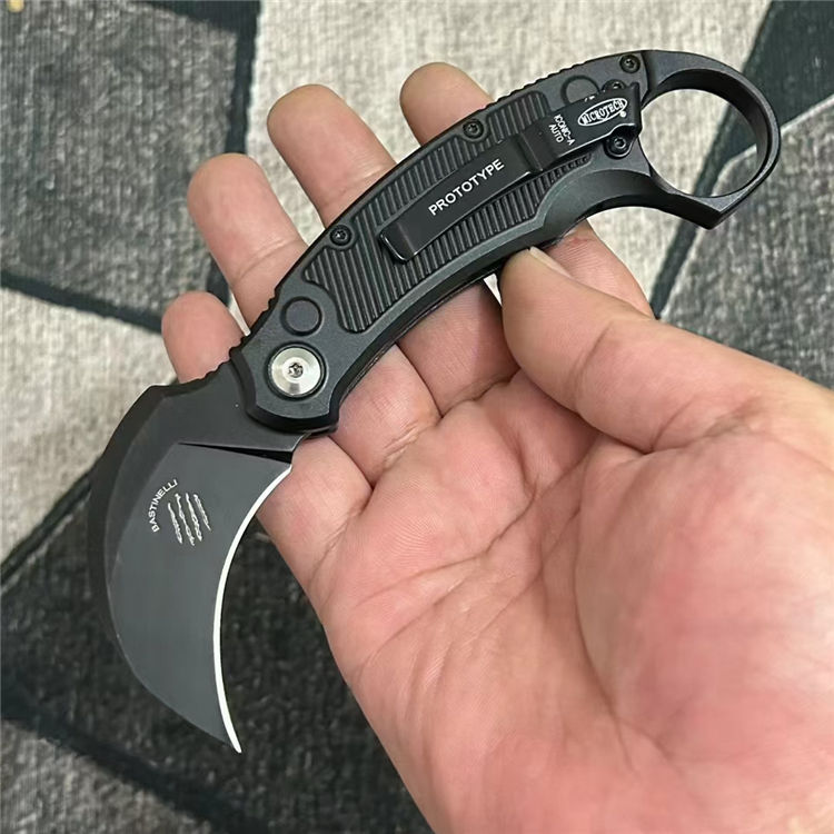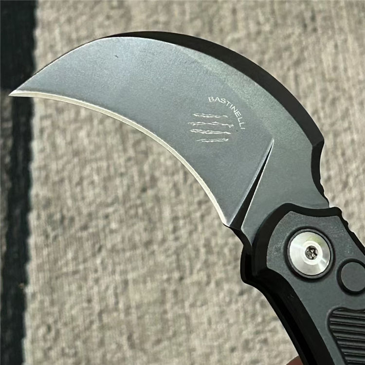 巴斯蒂内利横跳爪刀 全长:16.7cm 柄长:12cm 刃长:5cm 厚度:3mm 钢材:D2 柄材:铝合金 硬度:60±1HRC 整刀用CNC,电脑锣,线切割制作而成,手工,精密度非常高,很值得收藏的一把刀