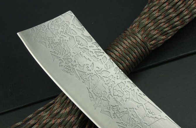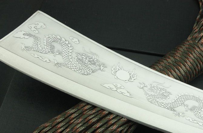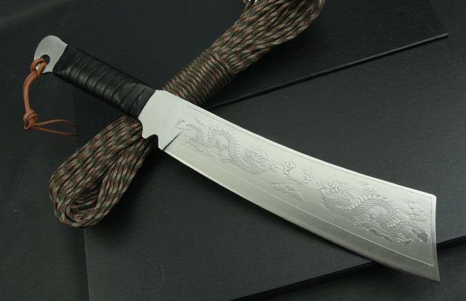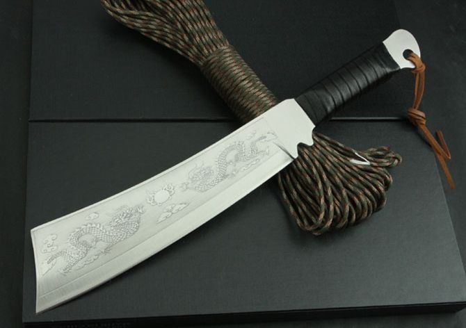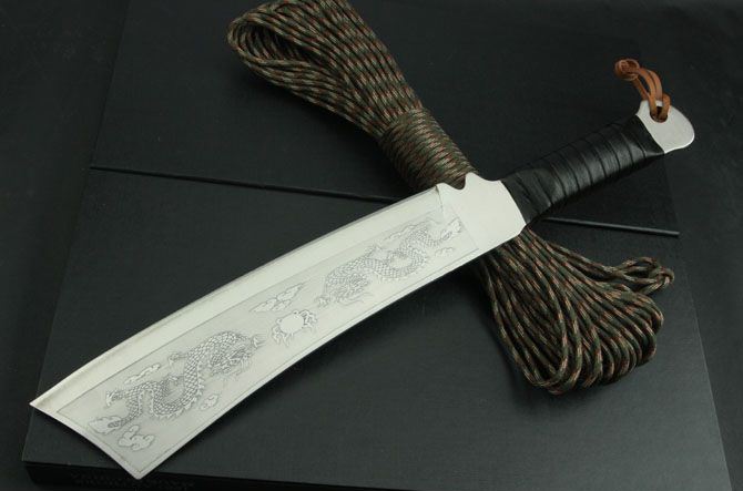 超短兰博4号手(腐蚀和双龙版) 全 长:420mm 刃 长:245mm 柄 长:135mm 刃 宽:62mm 刃 厚:5.5mm 刃 材:3Cr13Mov 重 量:720g(含包装) 硬 度:55HRC 表 面:腐蚀 柄 材:黑皮绳 锁 型:定锁 其 他:配彩盒和人革皮套