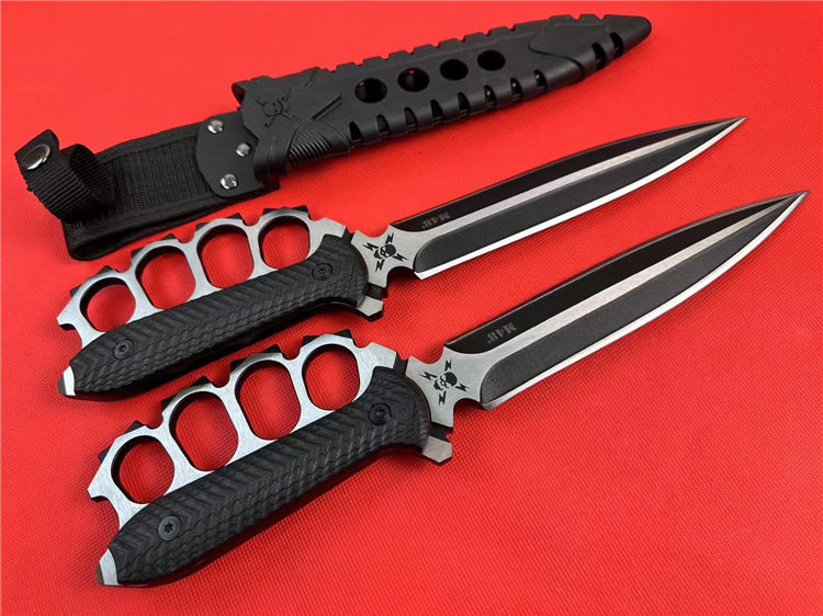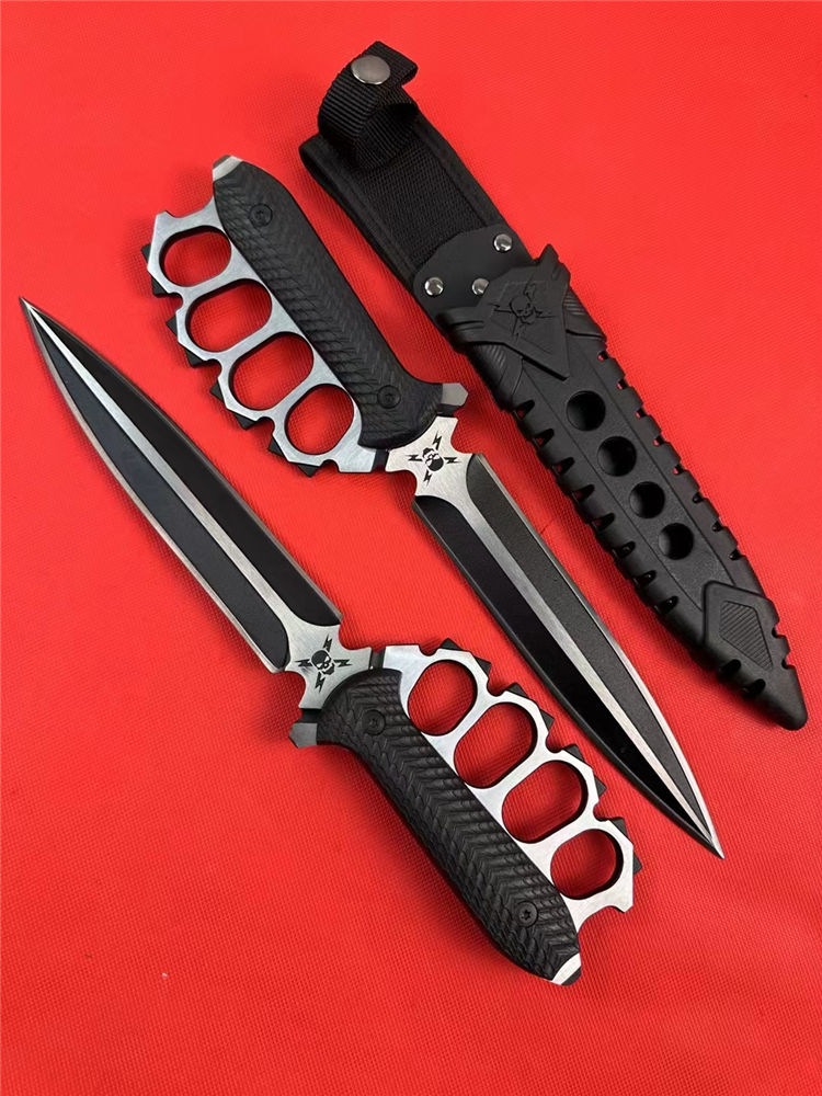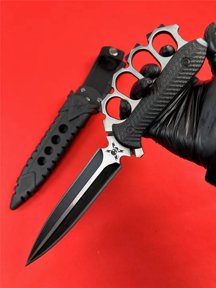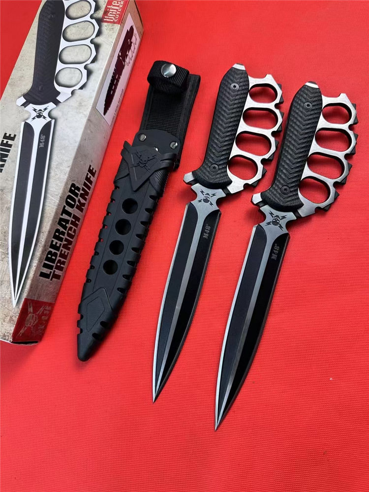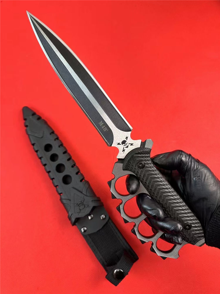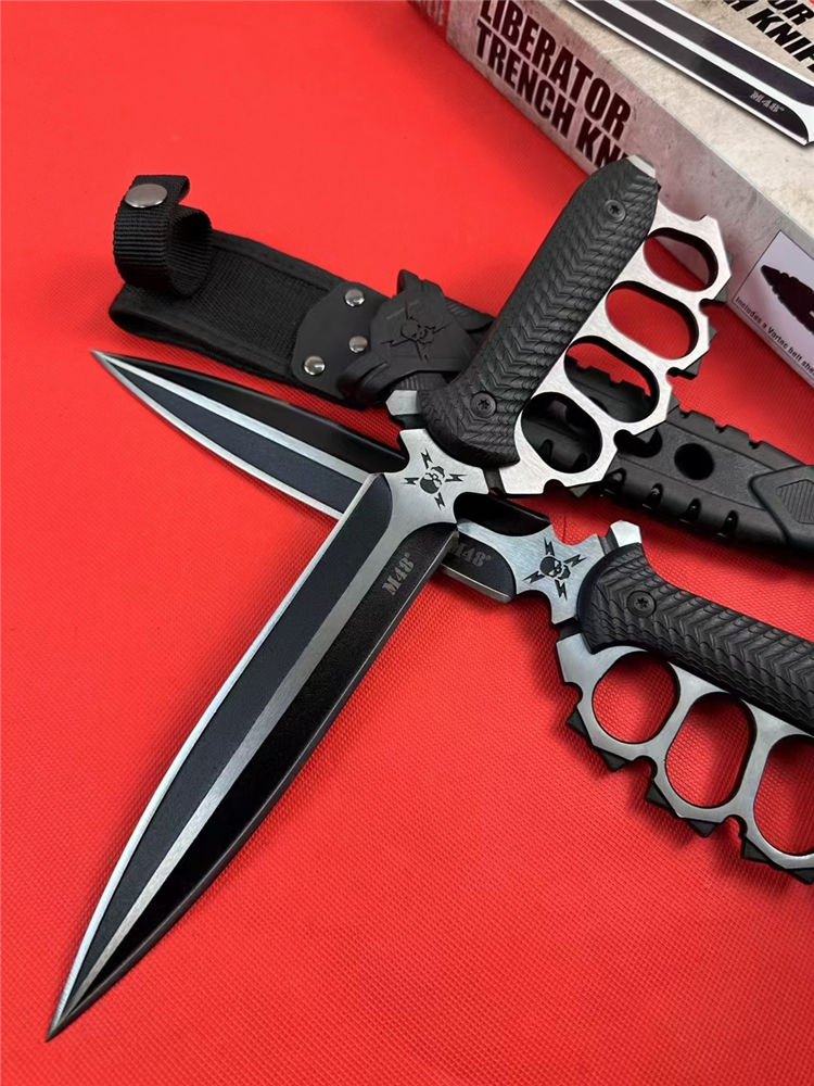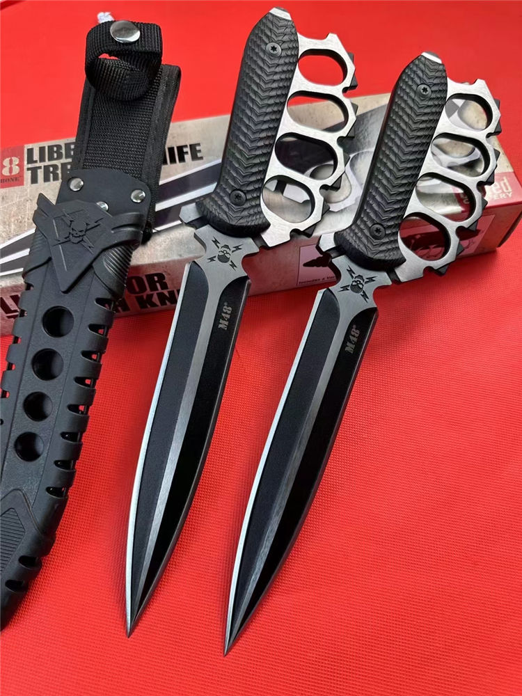M48战术指虎直刀 全长:35cm 刃长:21cm 刃宽:3.6cm 刃厚:0.8cm 柄长:14cm 刃材:铸造高铬钢(喷砂黑)