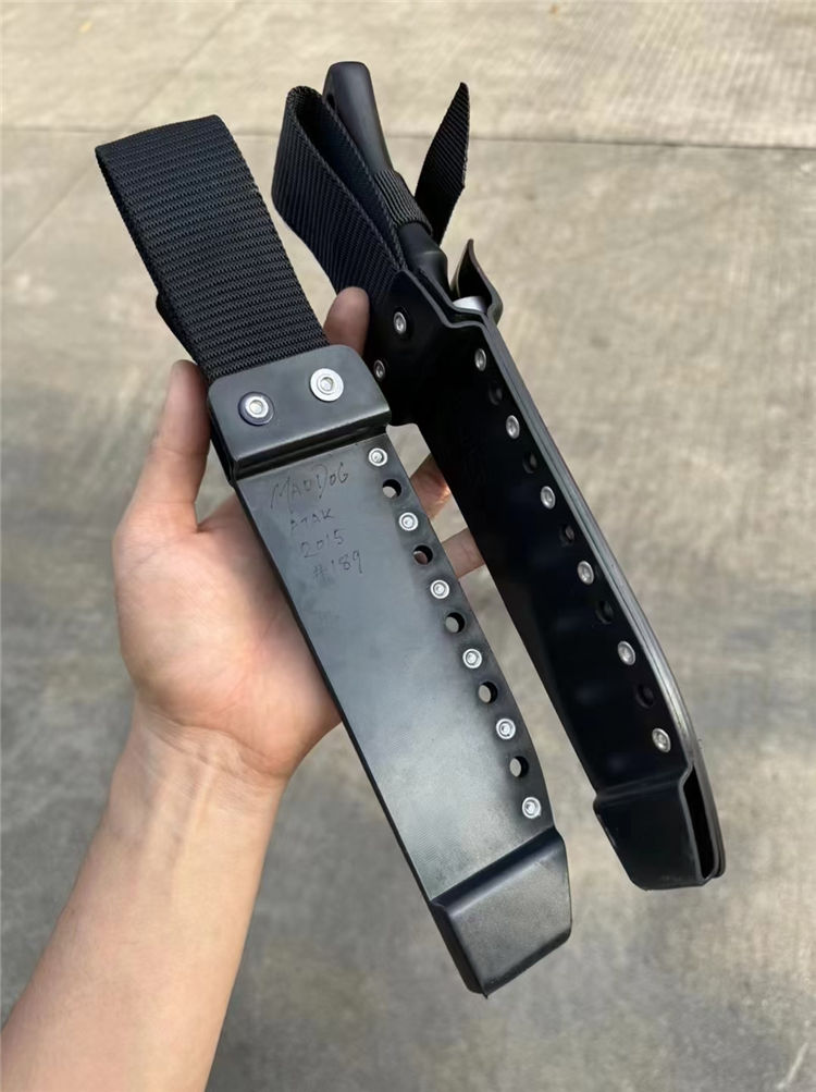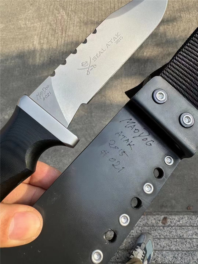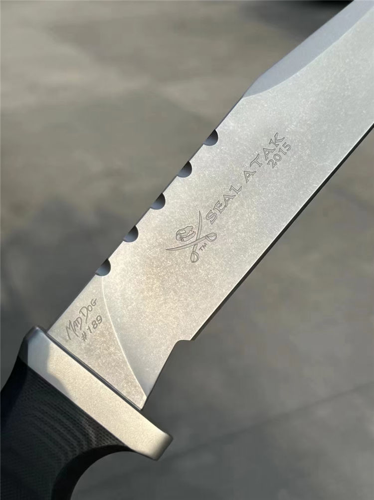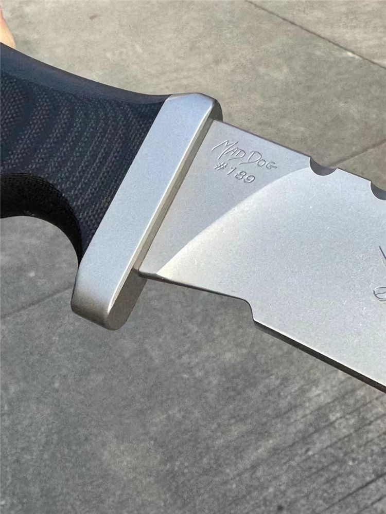 疯狗2015年定制版直刀 全长:30.5cm 刃长:18cm 刃宽:3.7cm 刃厚:0.6cm 重量:364克 刃材:A8合金钢 表面:镀钛银色石洗处理 柄材:FR4黑色玻璃纤维/环氧基树脂合成材质➕钛护手 刀鞘:战术刀鞘