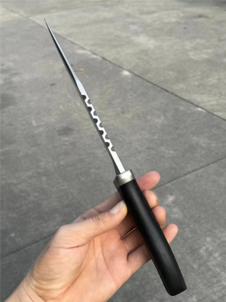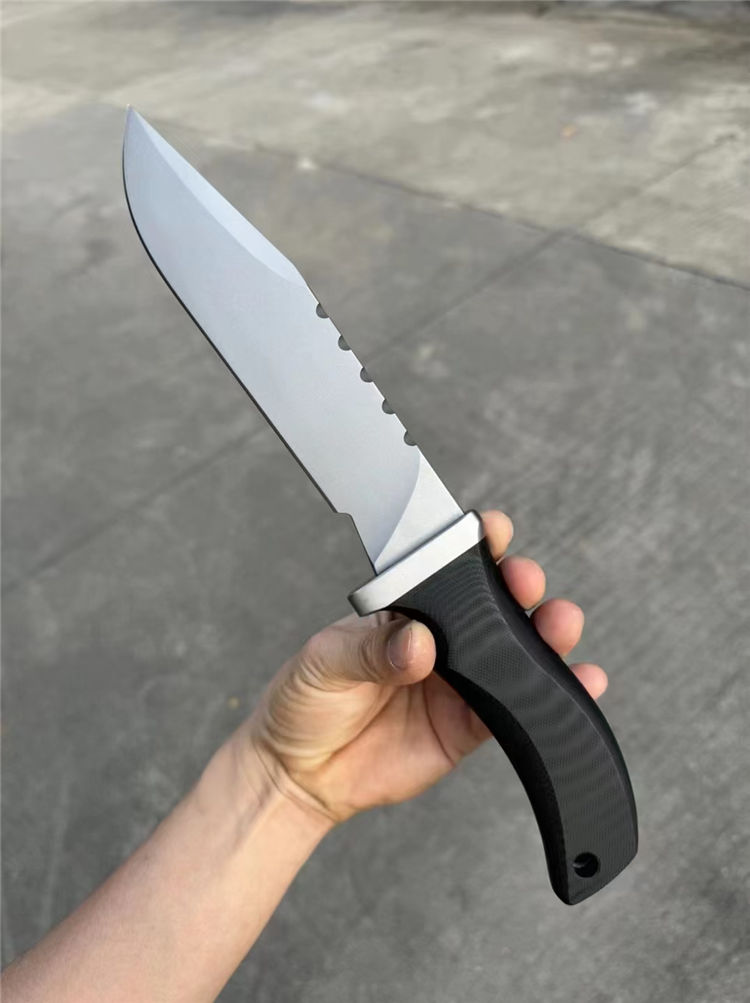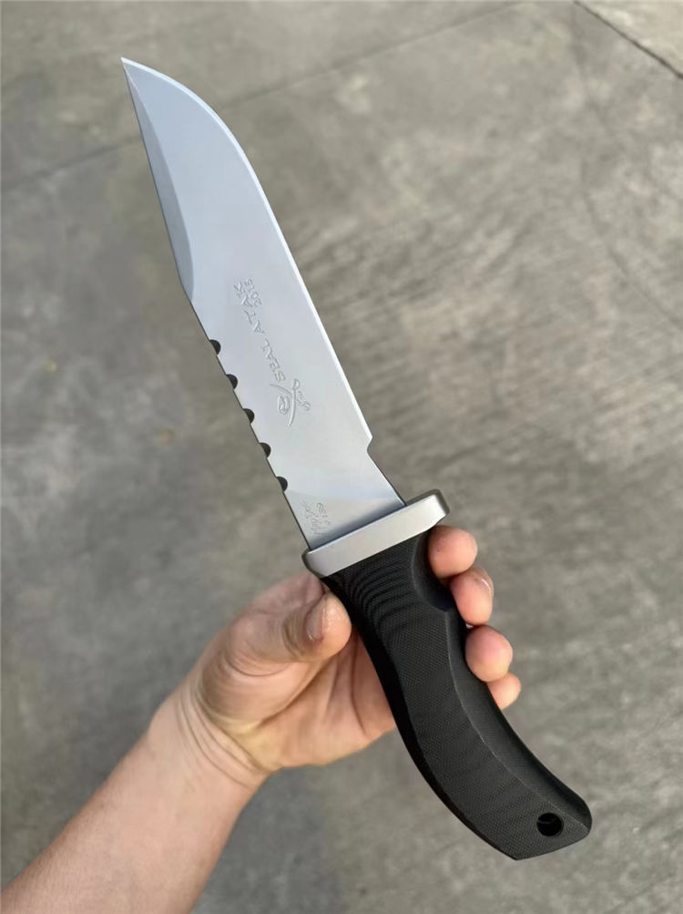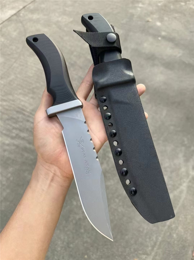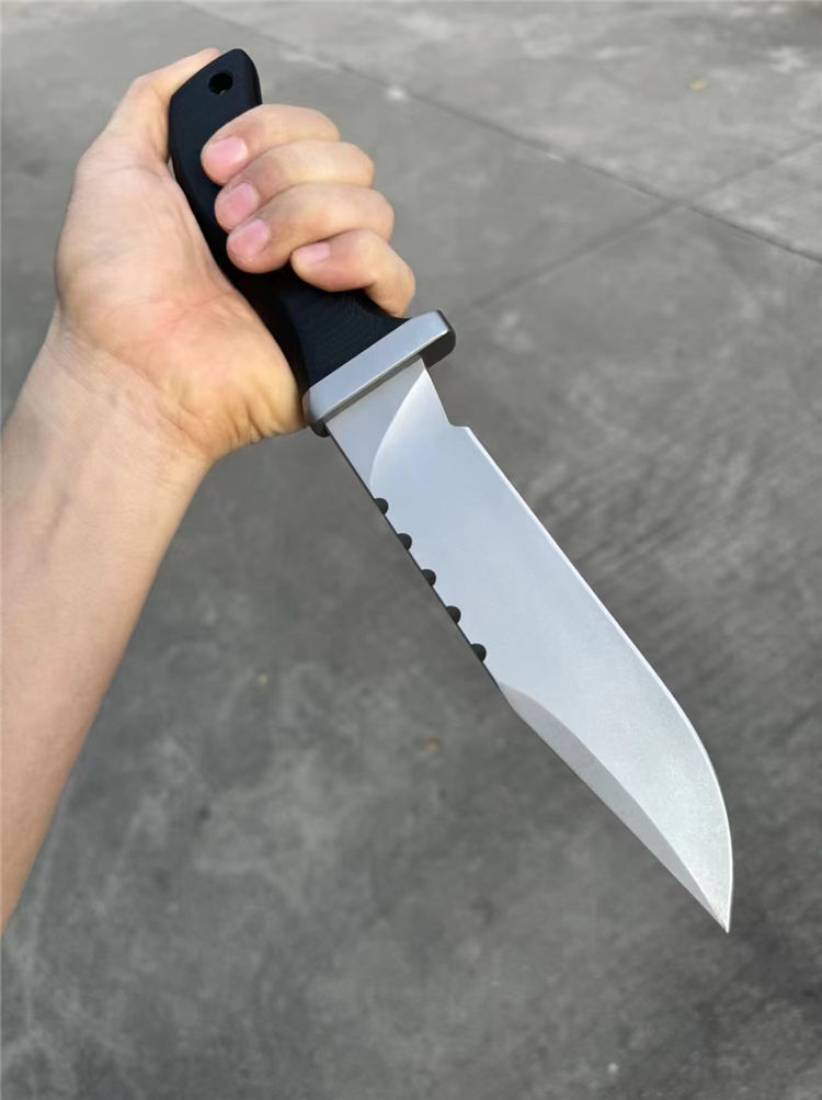 疯狗2015年定制版直刀 全长:30.5cm 刃长:18cm 刃宽:3.7cm 刃厚:0.6cm 重量:364克 刃材:A8合金钢 表面:镀钛银色石洗处理 柄材:FR4黑色玻璃纤维/环氧基树脂合成材质➕钛护手 刀鞘:战术刀鞘