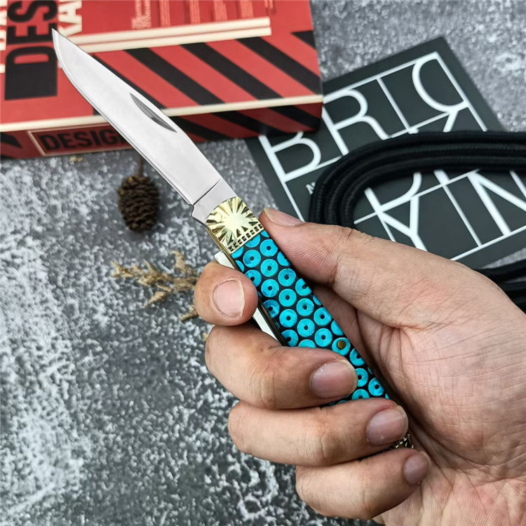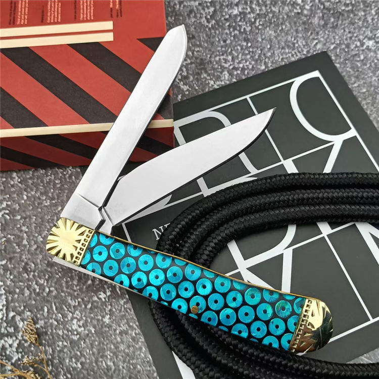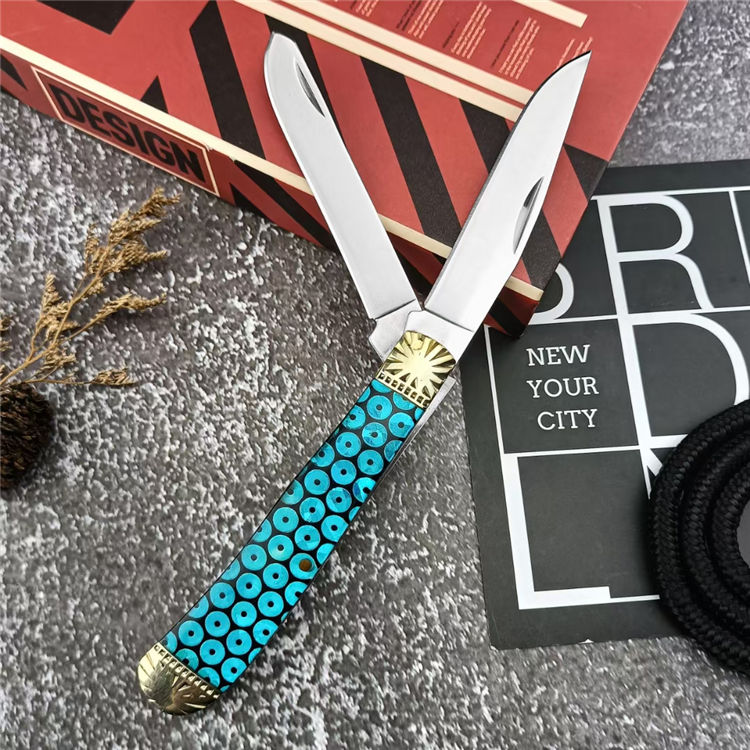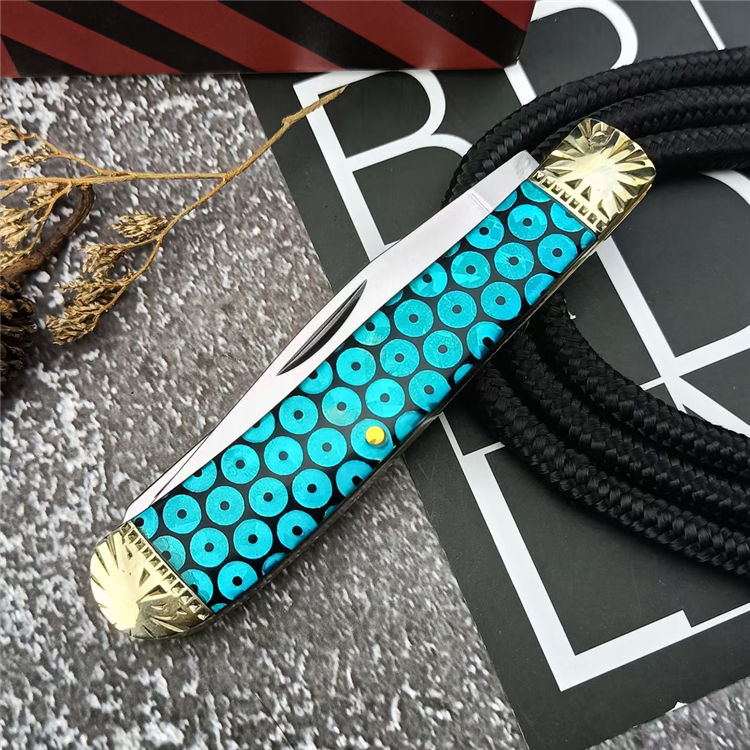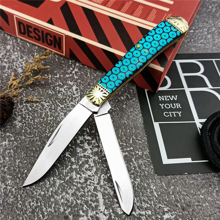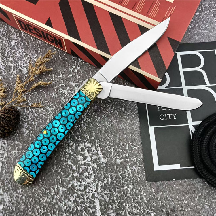金钱双刀折刀 总长:15.5cm 刃长:6.1cm 刃宽:2.7cm 刃厚:5.1mm 柄材:440C 刃材:黄铜+树脂 柄长:9.7cm 柄宽:2.8cm 柄厚:13.5mm 重量:125G