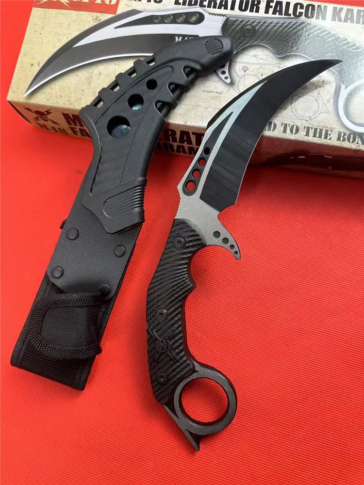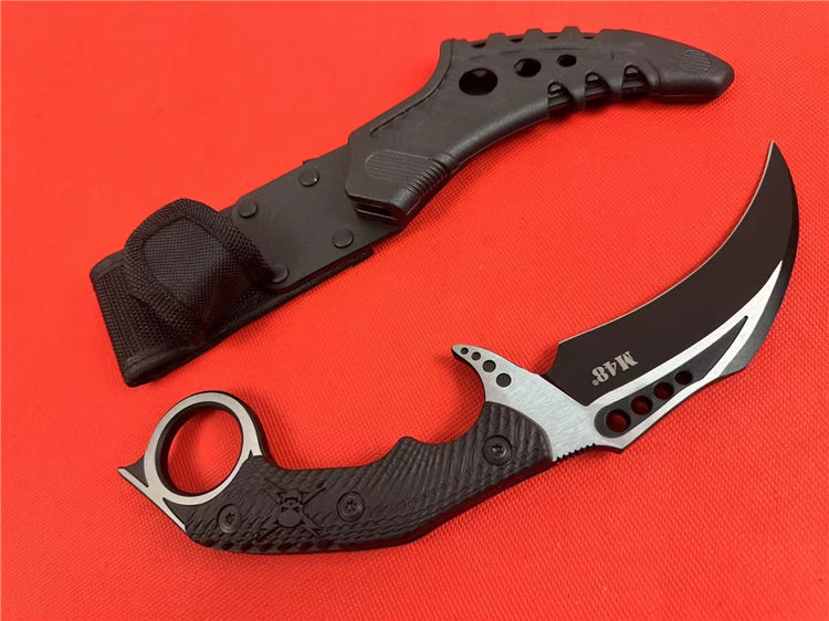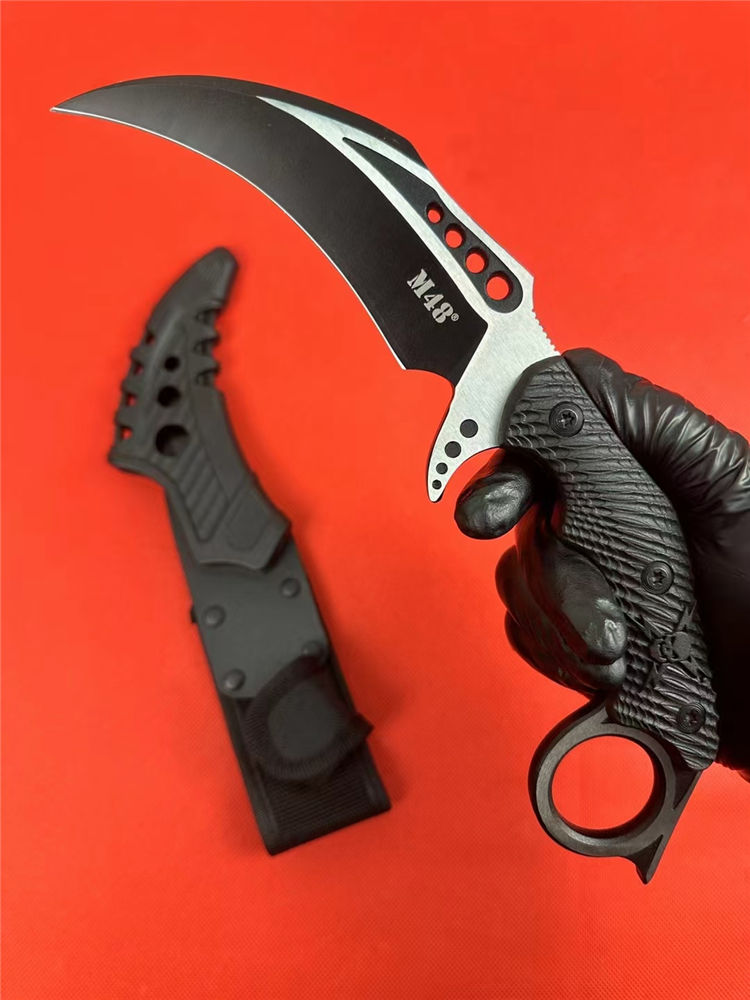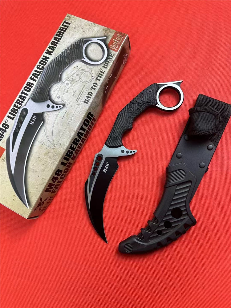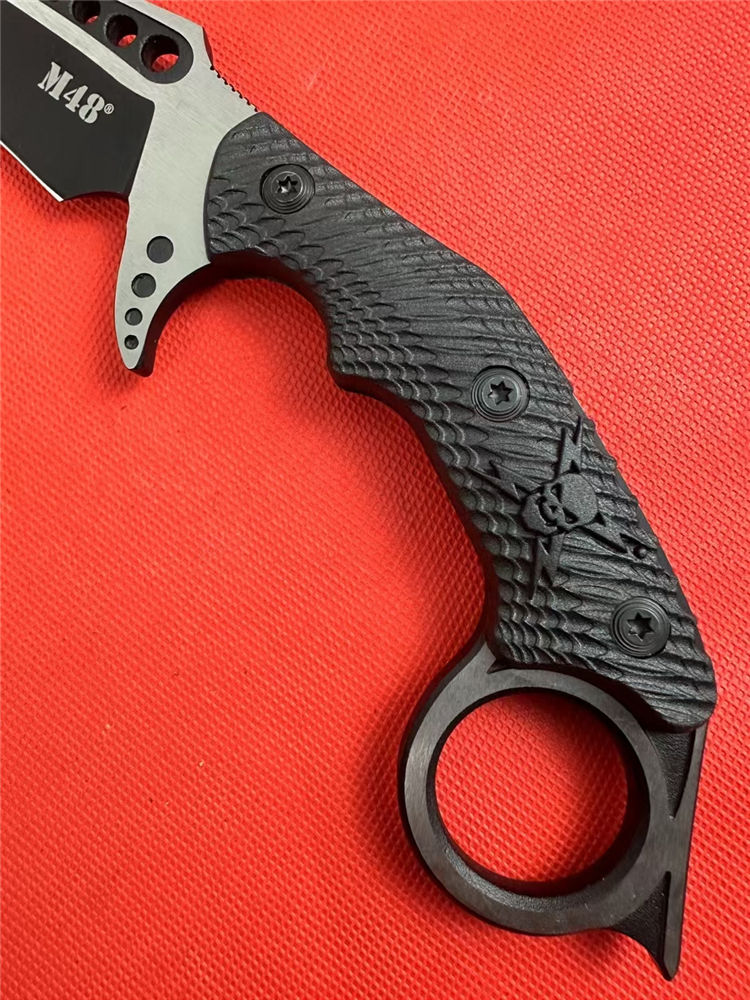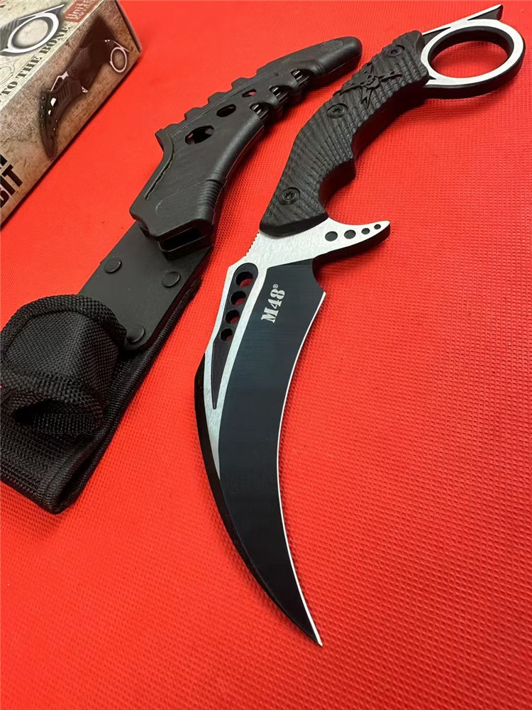 K鞘版M48战术爪刀 总长:26.5cm 刃长:10.5cm 刃宽:4cm 刃厚:7mm 柄材:G10 刃材:D2 柄长:15cm 柄宽:29.4mm 柄厚:18.6mm 重量:333g