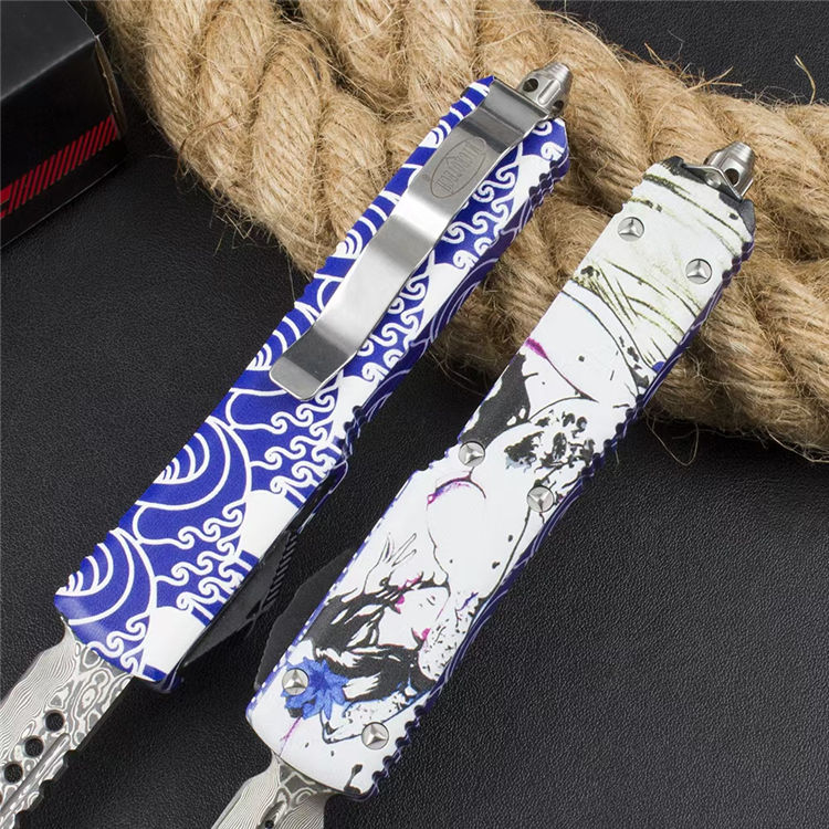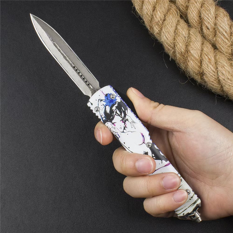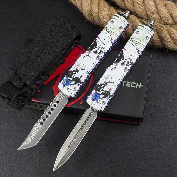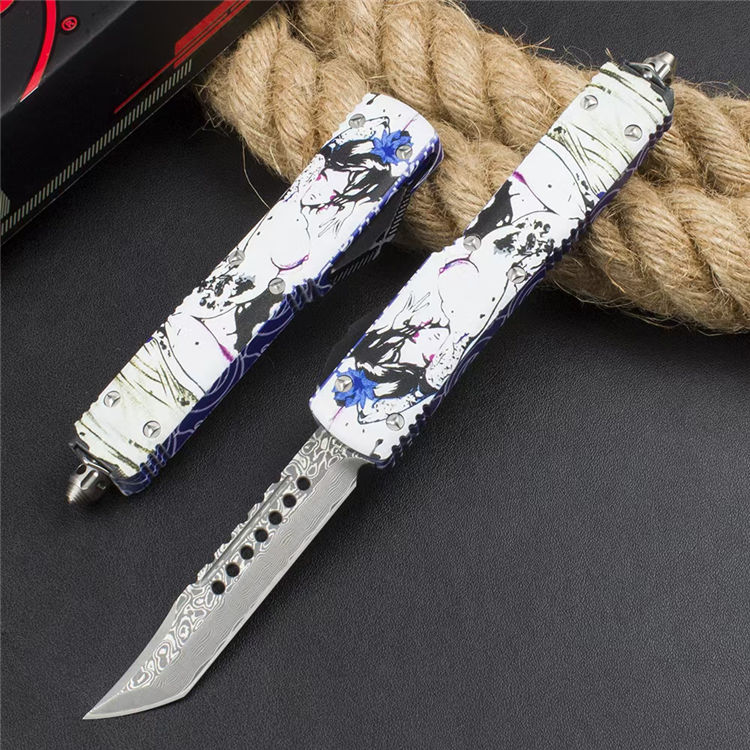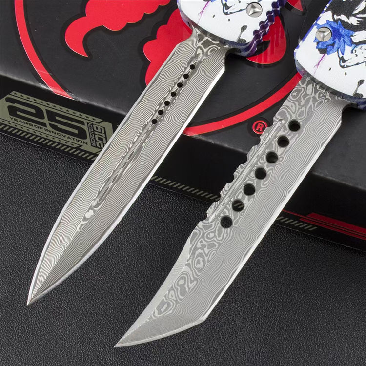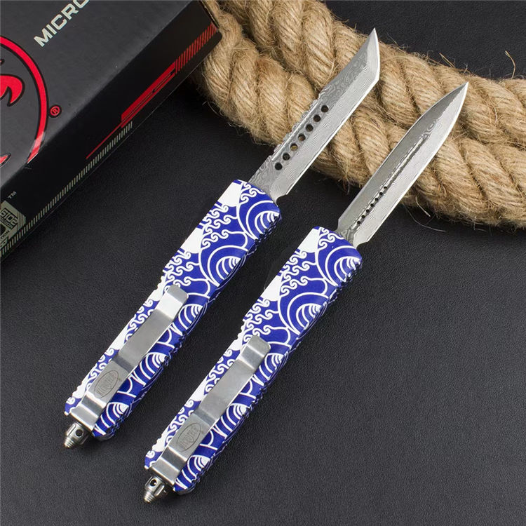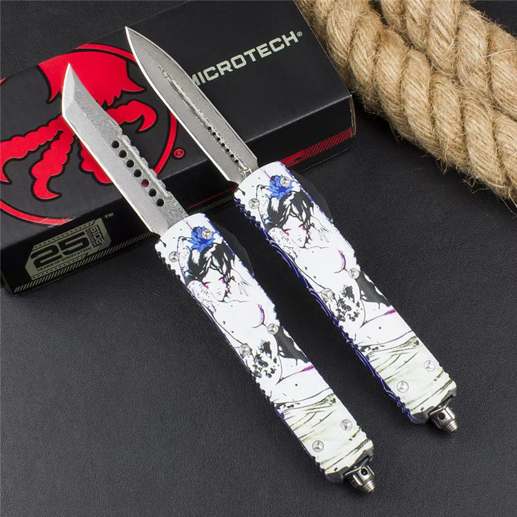 微技术大马士革艺妓直出跳刀 全长:20.5cm 刃长:8.2cm 刃厚:3mm 刃宽:1.6cm 柄长:13cm 刃材:大马士革 硬度:59-60 净重:100g 毛重:158g(含包装) 表面:拉丝 柄材:T6061航空铝 刀套:nylon 备注:带玻璃锥、腰夹,专用维护工具