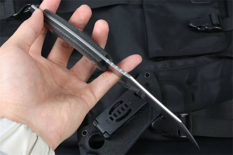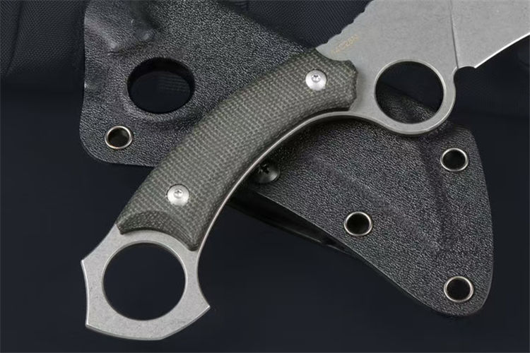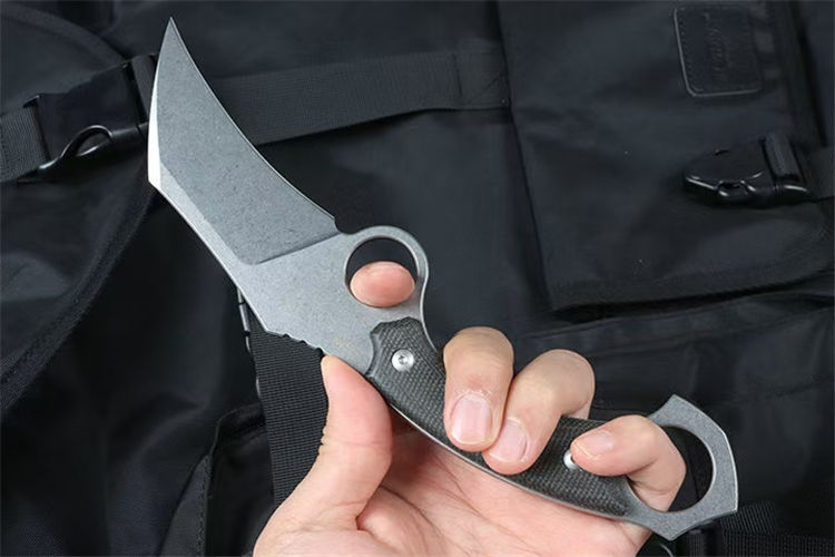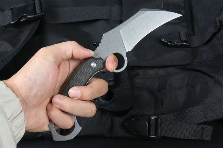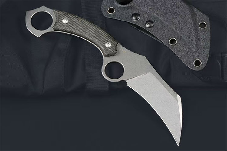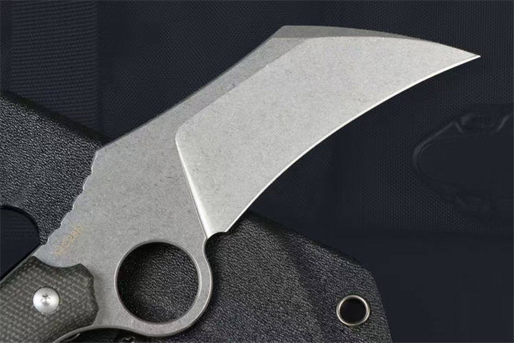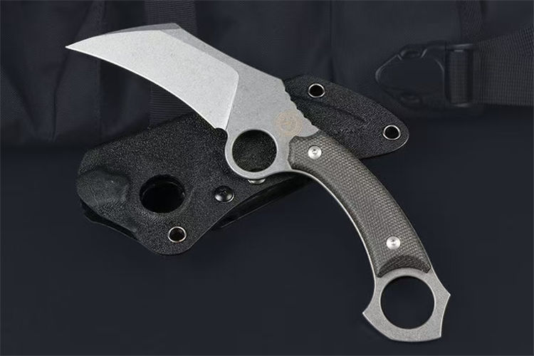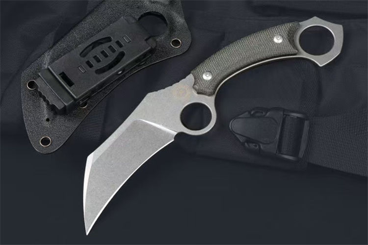 战术爪刀 全长:22.8cm 刃长:12.0cm 柄长:10.8m 刃宽:3.1cm 刃厚:3.2mm 刃材:14C28N 刀重:144g 重量:330(含包装) 硬度:58HRC 表面:石洗纹 柄材:亚麻 手柄:整刀电脑锣工艺 锁型:定锁 其他:k鞘
