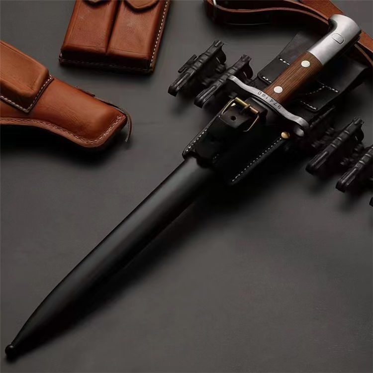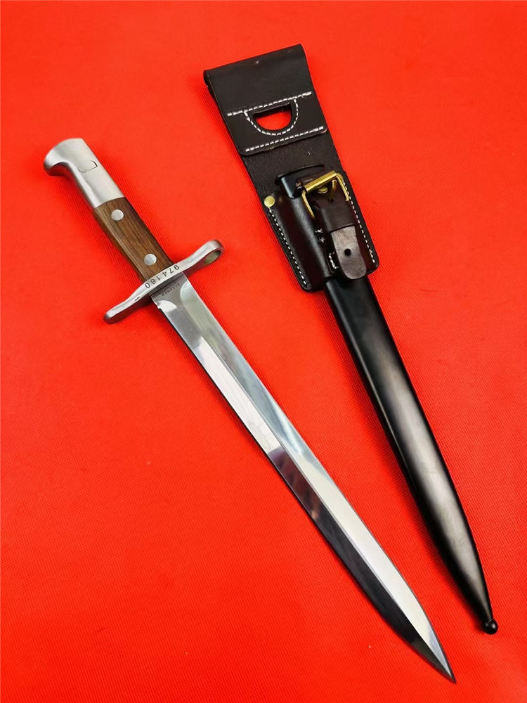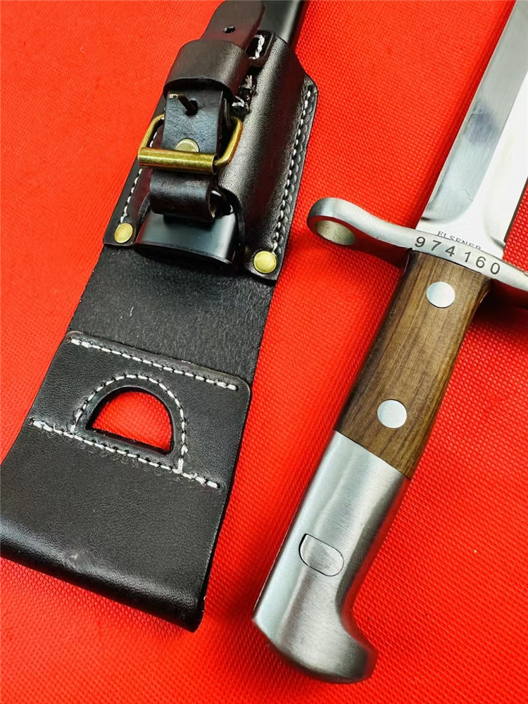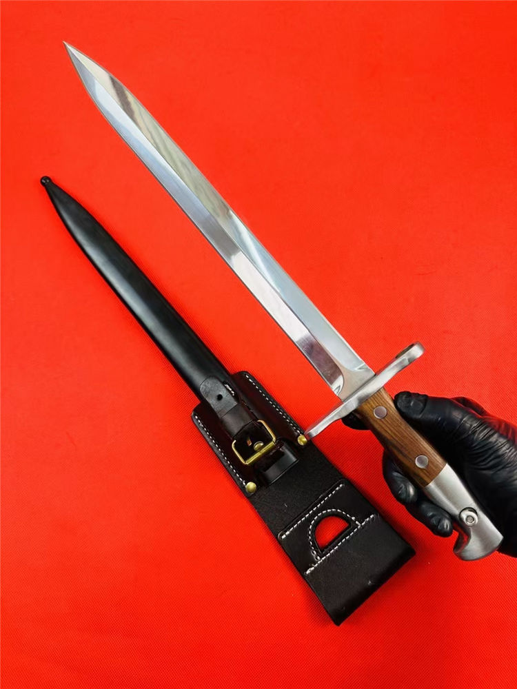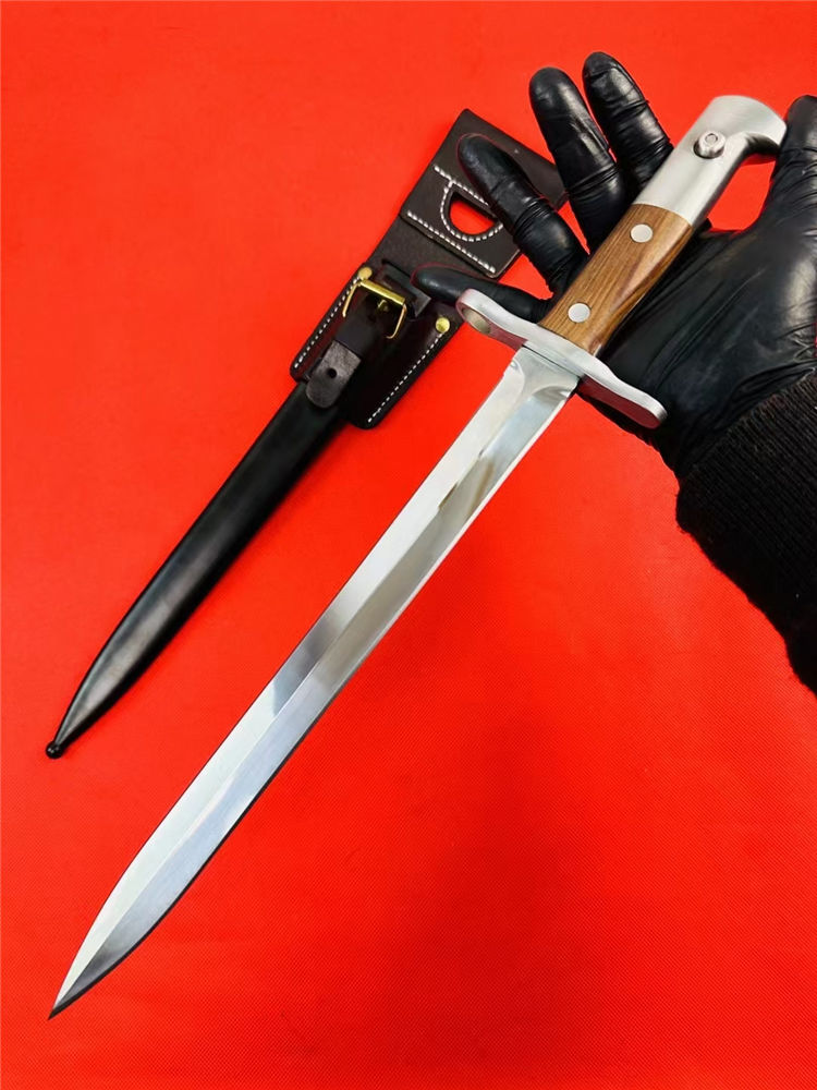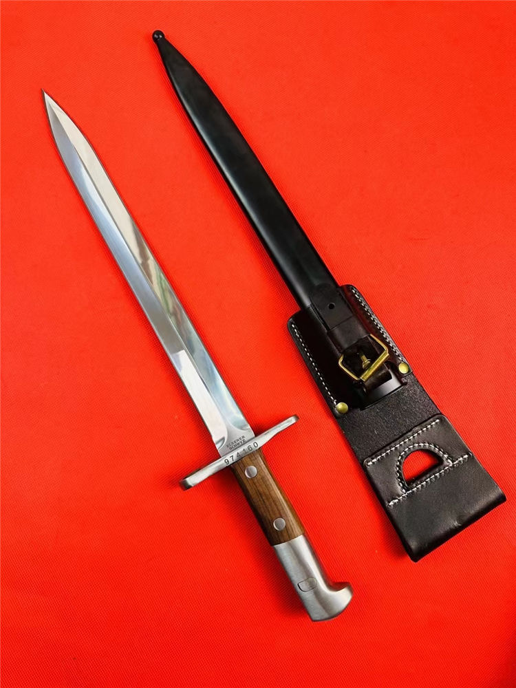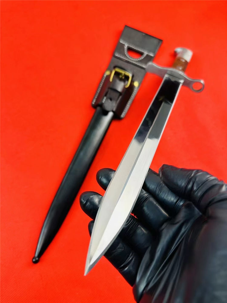 瑞士K31刺刀 全长:43CM 刃长:30CM 厚度:0.6CM 钢材:军用合金钢 手柄:胡桃木 硬度:60HRC 刀重:488克 含鞘重:715克 刀鞘:全钢+牛皮挂件 包装:黑色礼盒