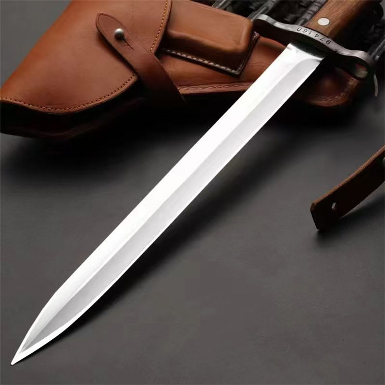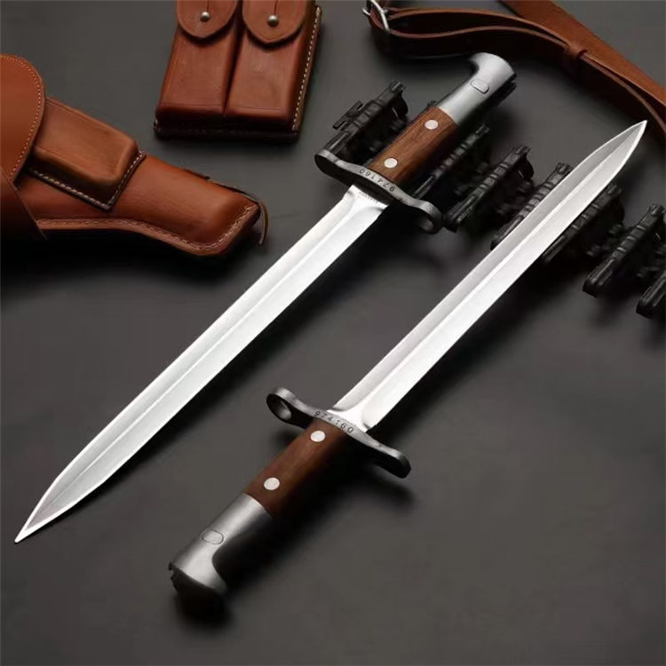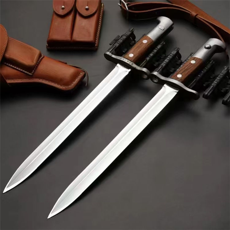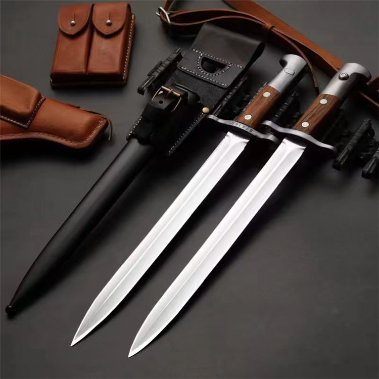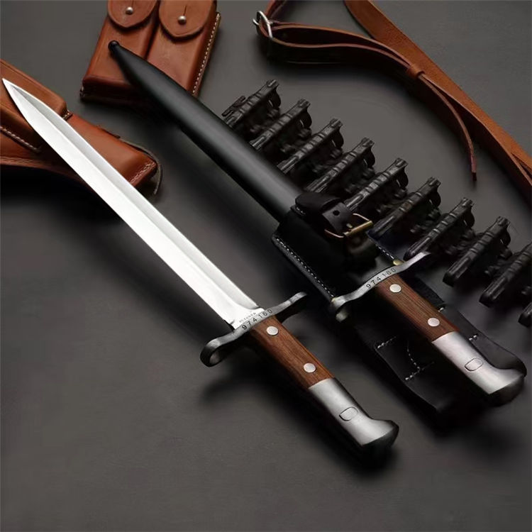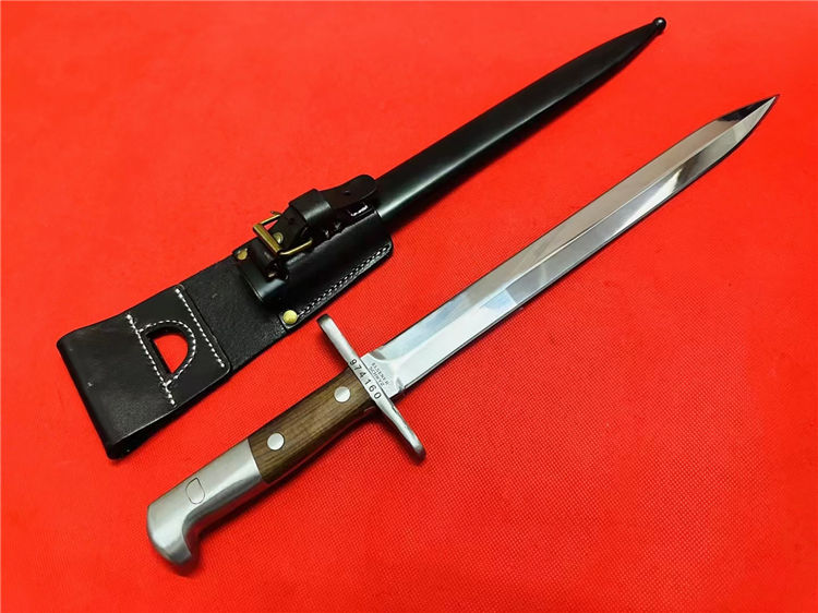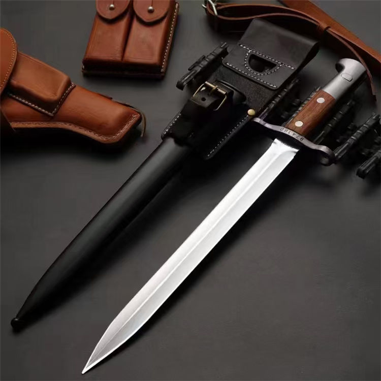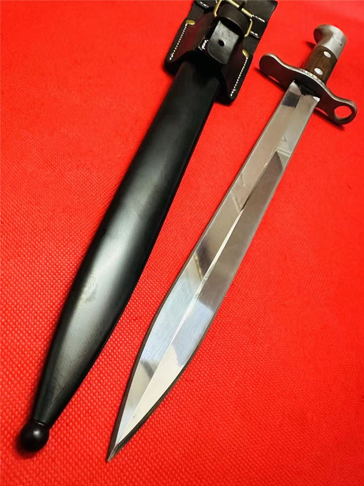 瑞士K31刺刀 全长:43CM 刃长:30CM 厚度:0.6CM 钢材:军用合金钢 手柄:胡桃木 硬度:60HRC 刀重:488克 含鞘重:715克 刀鞘:全钢+牛皮挂件 包装:黑色礼盒