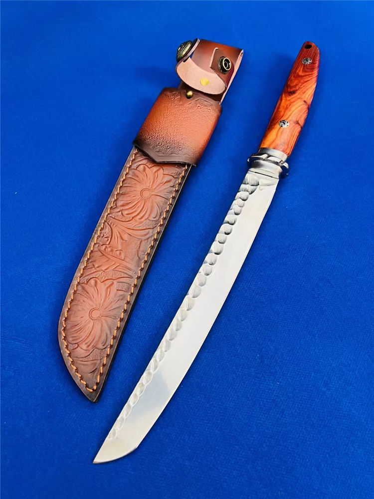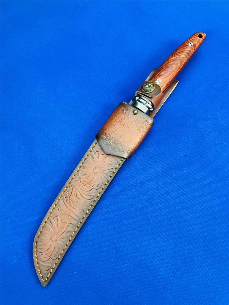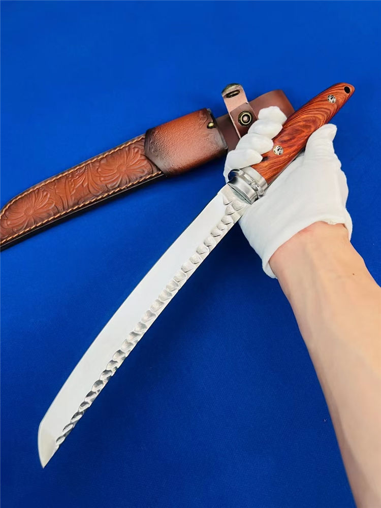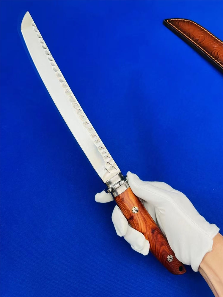 冰魄武士短刀 全长:38cm 刃长:23cm 柄长:13.5cm 刃宽:2.6cm 刃厚:5.2mm 钢材:锻造vg10 硬度:60HRC 柄材:黄檀木 刀鞘:植鞣革皮手工雕花套 纸盒包装