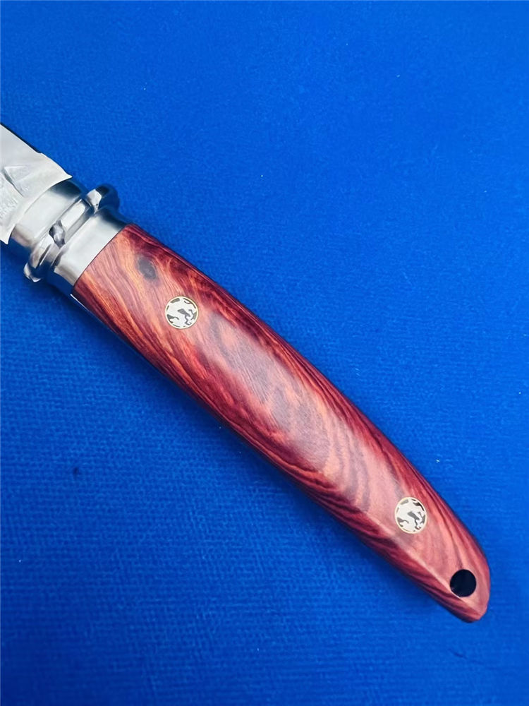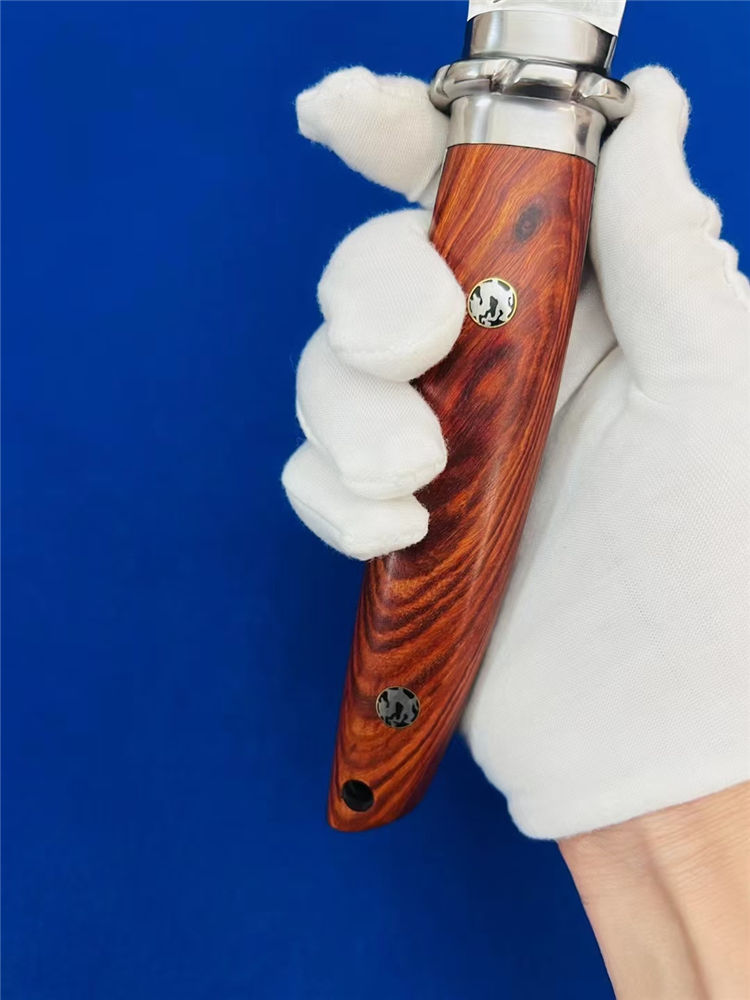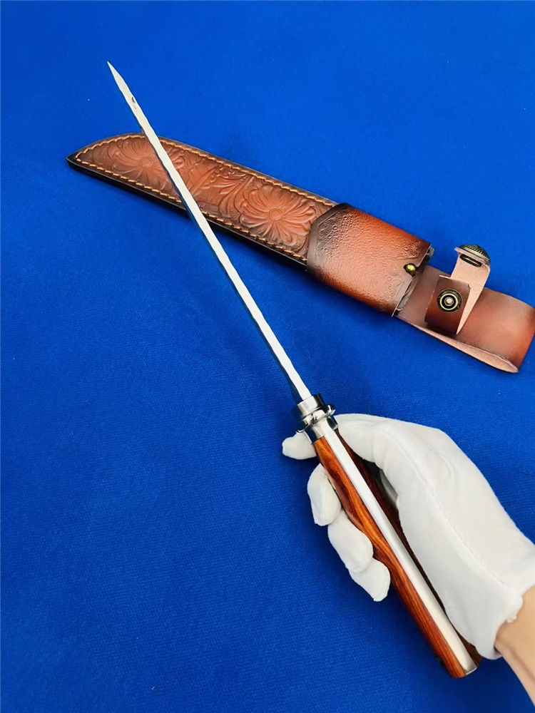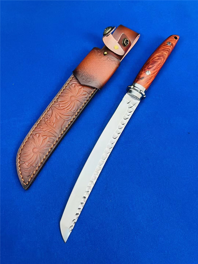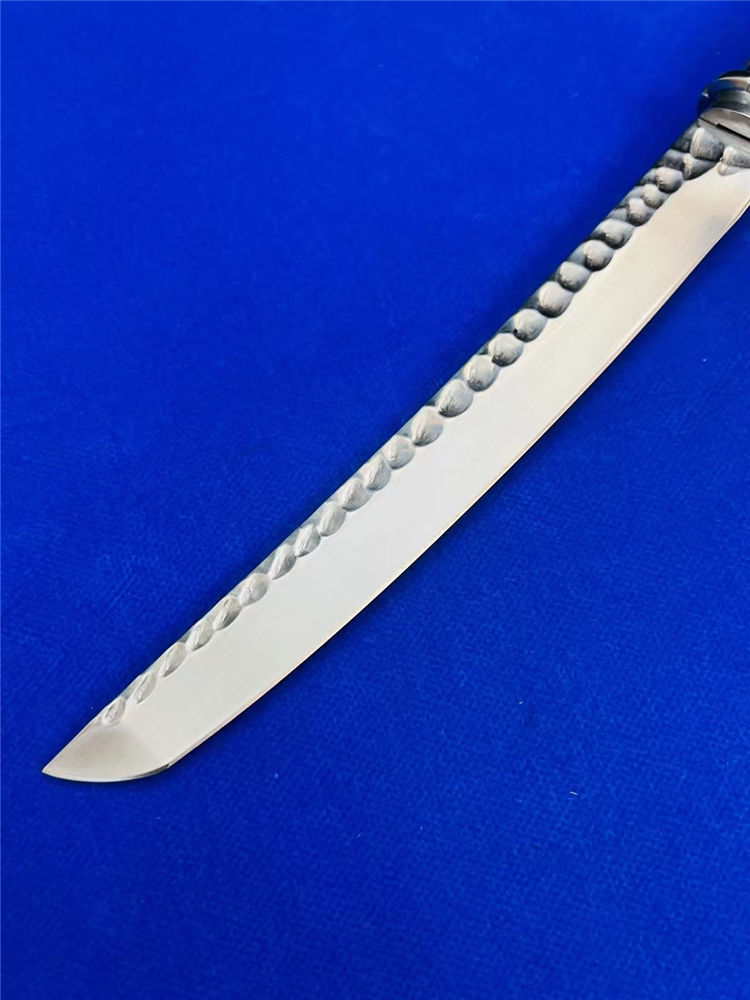 冰魄武士短刀 全长:38cm 刃长:23cm 柄长:13.5cm 刃宽:2.6cm 刃厚:5.2mm 钢材:锻造vg10 硬度:60HRC 柄材:黄檀木 刀鞘:植鞣革皮手工雕花套 纸盒包装