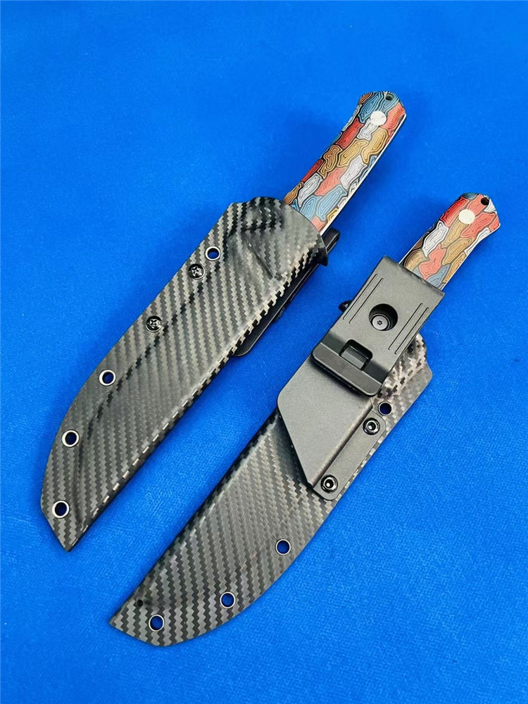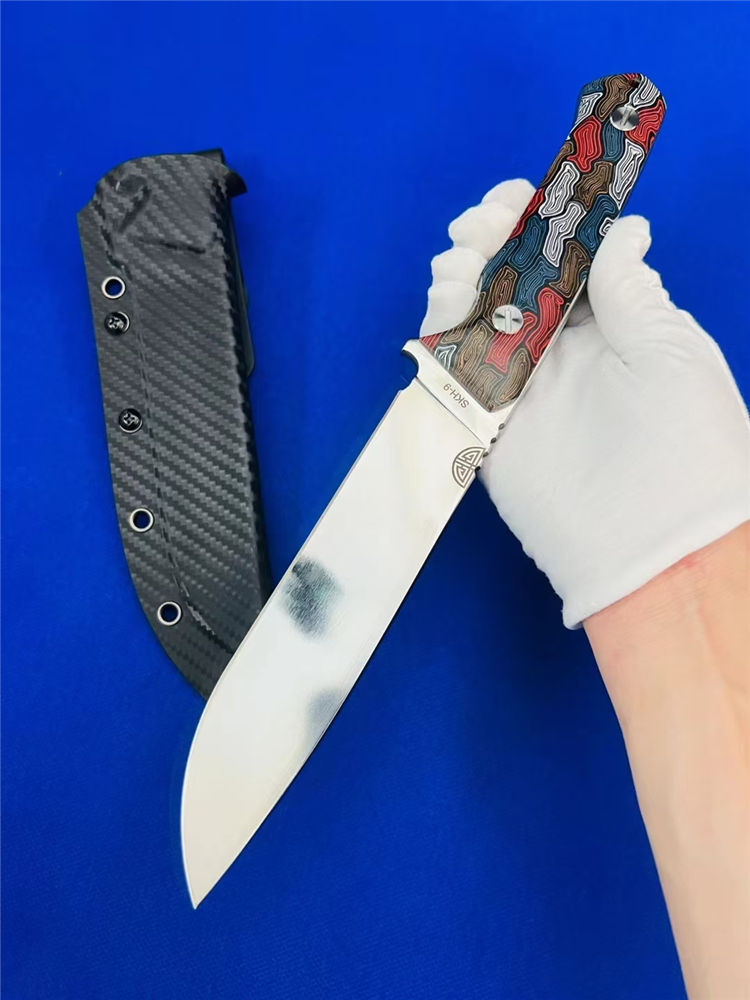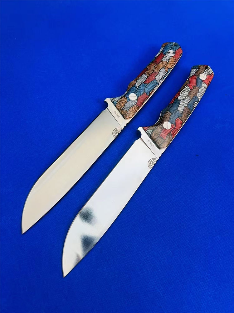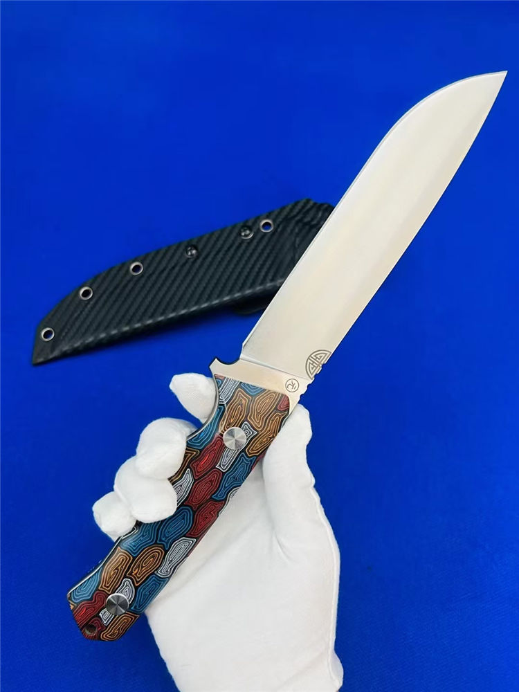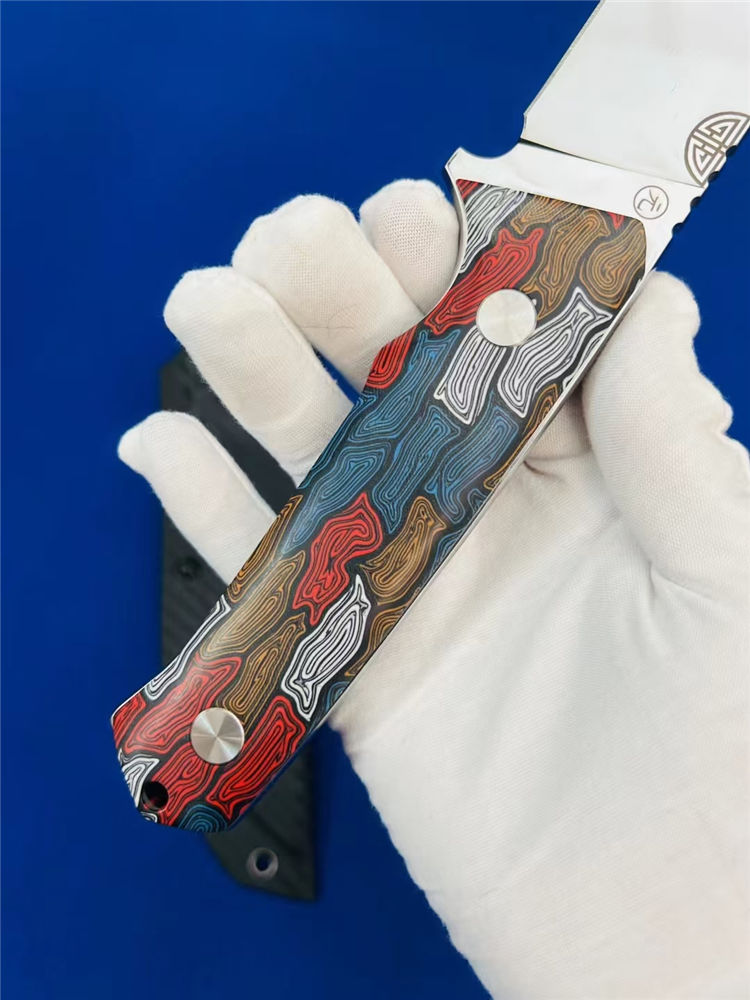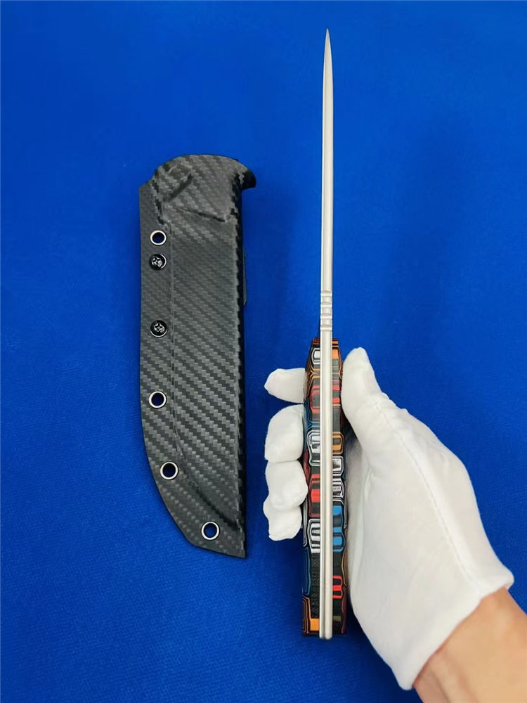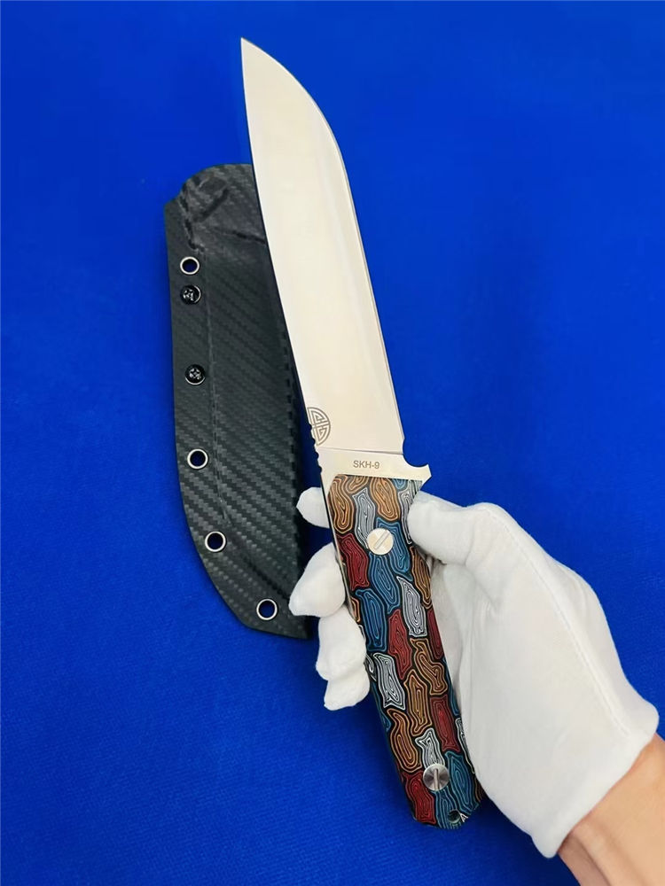 元刃手工直刀 全长:30cm 刃长:15.5cm 刃厚:5.7mm 刃宽:35mm 钢材:进口日本SKH-9高速钢 硬度:62HRC 表面:砂光款 镜面款 柄材:蜂窝彩色G10 刀套:纤维纹K鞘 重量:435克