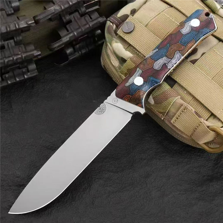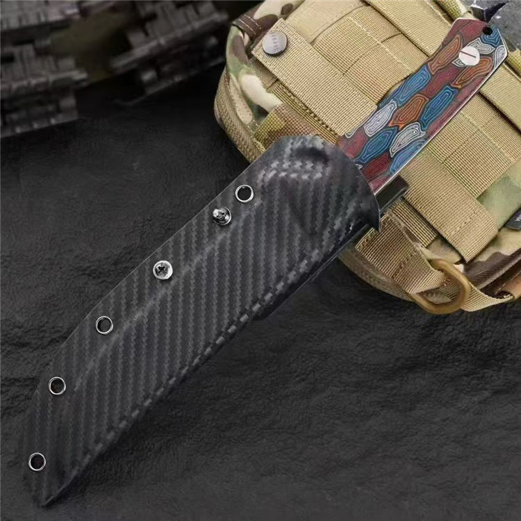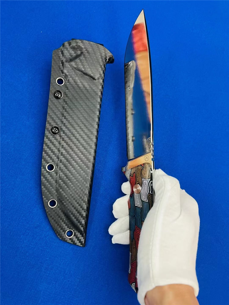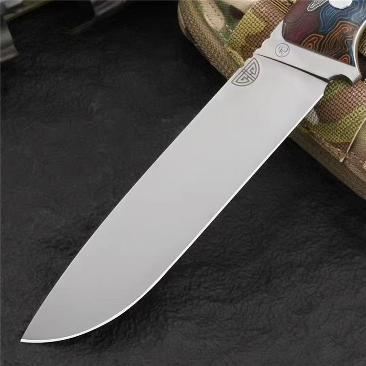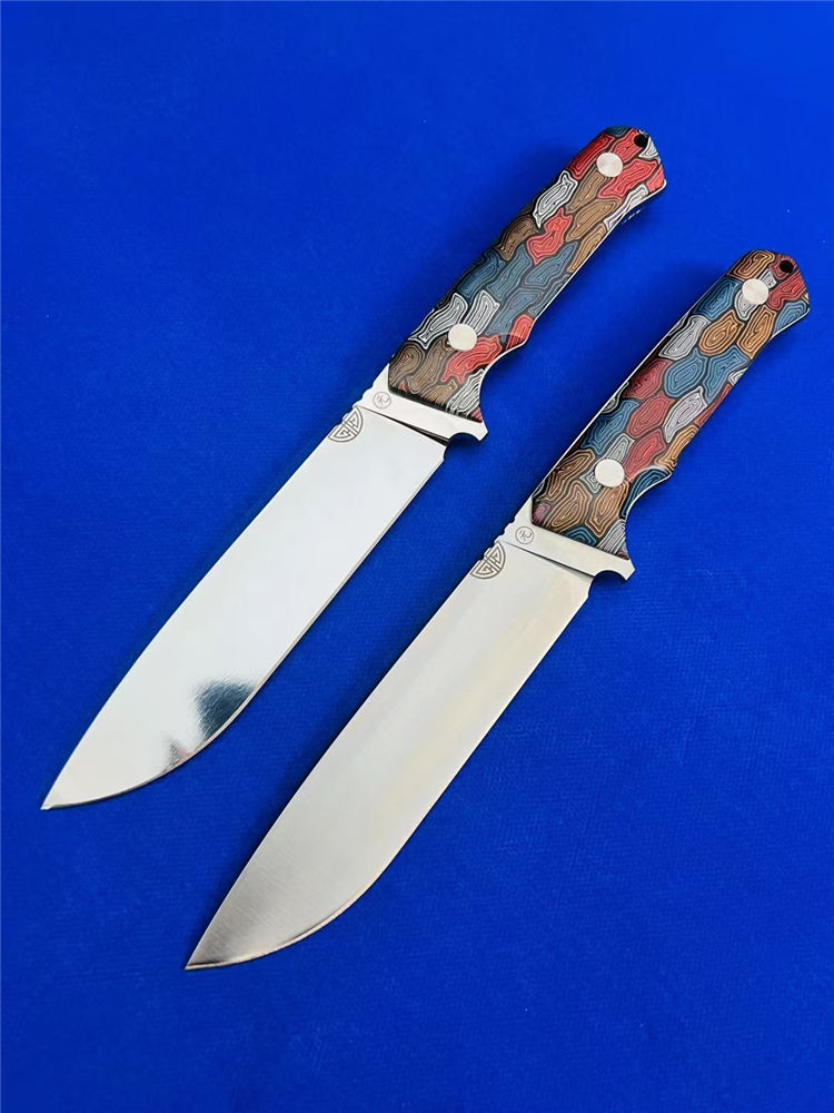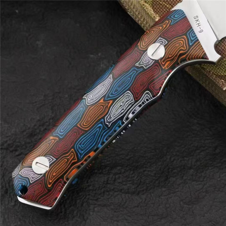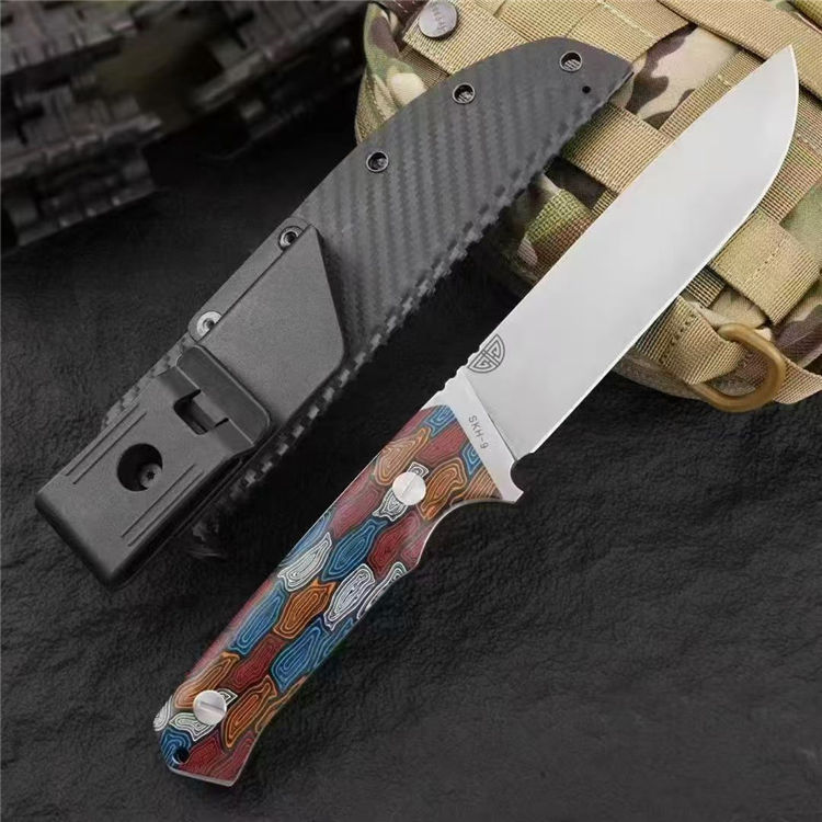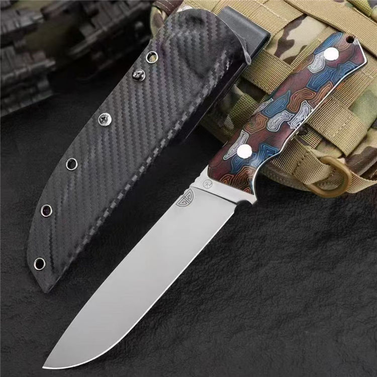 元刃手工直刀 全长:30cm 刃长:15.5cm 刃厚:5.7mm 刃宽:35mm 钢材:进口日本SKH-9高速钢 硬度:62HRC 表面:砂光款 镜面款 柄材:蜂窝彩色G10 刀套:纤维纹K鞘 重量:435克