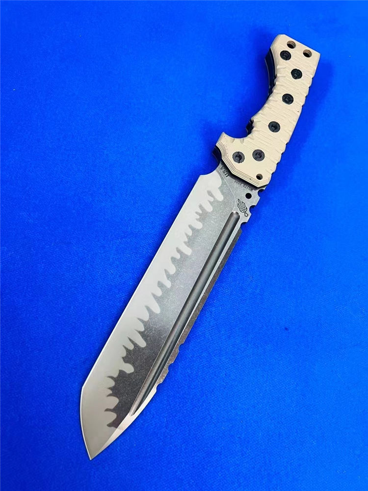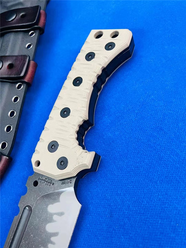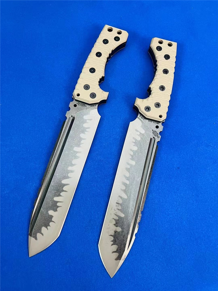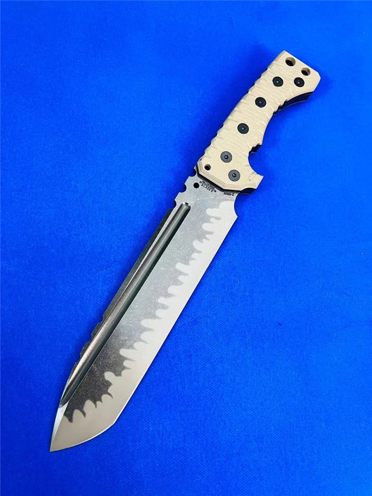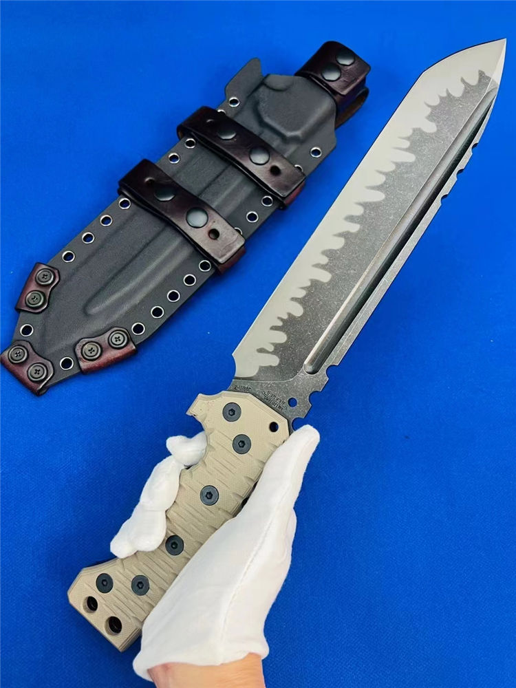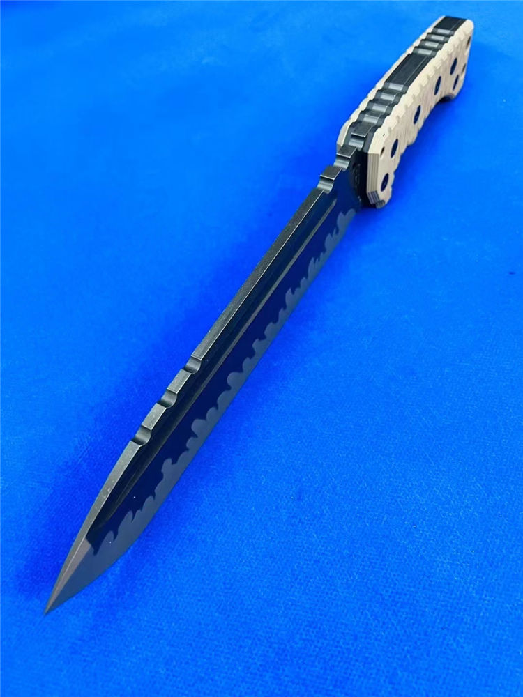 米勒M31重型战术直刀 总长:375mm 刃长:232mm 刃厚:7.1-7.2mm 刃宽:53mm 钢材:A8 硬度:60-61HRC 柄材:G10沙漠+黑G10色 净重:810克 全重:1110克(刀+K鞘) 刀鞘:手工进口K版鞘+意大利进口植鞣皮手工制作 包装:黑色手工盒子
