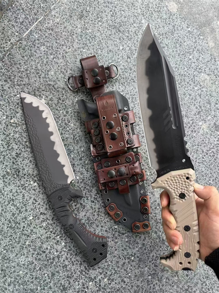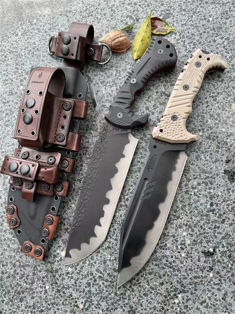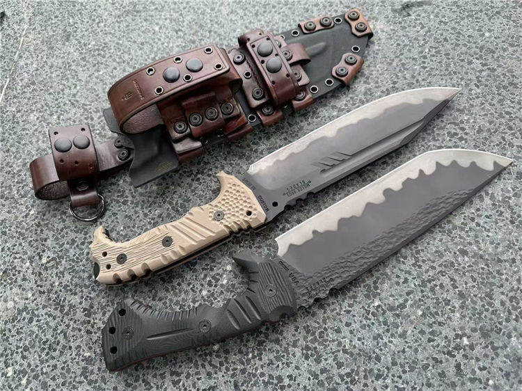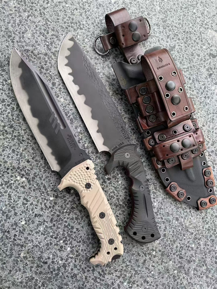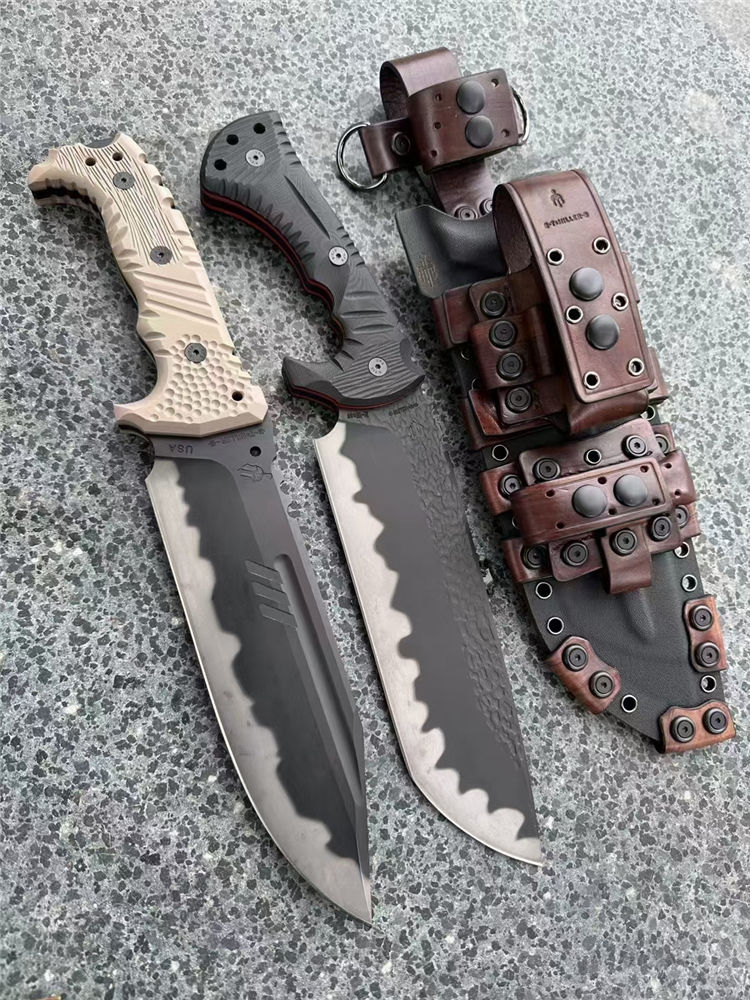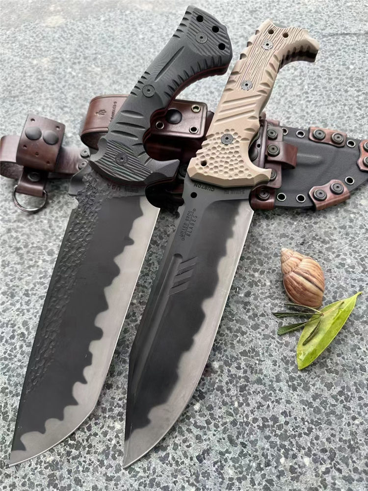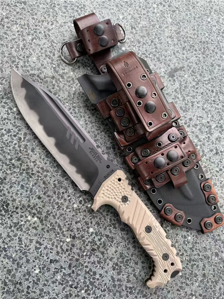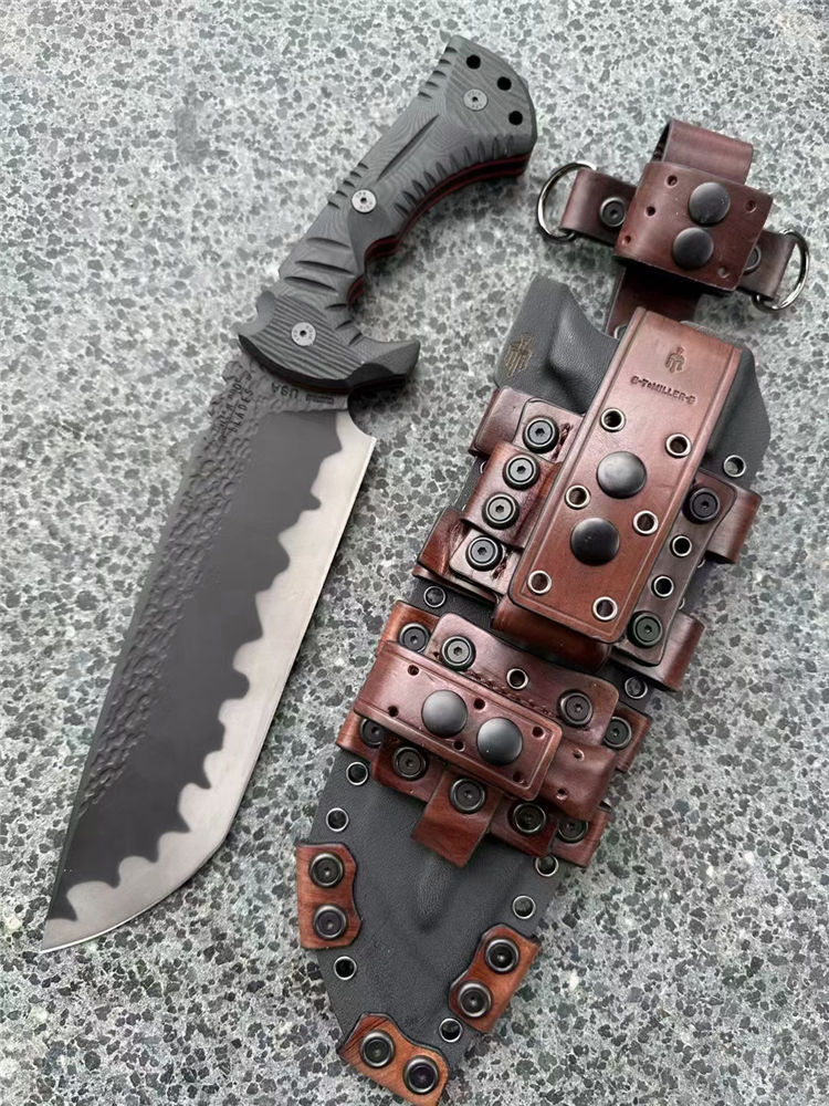 米勒M9直升机直刀 总长:39cm 刃长:22cm 刃厚:7MM 钢材:CTS-XHP粉末高 工艺:一体龙骨、专业真空深冷油淬热处理、钢印品牌logo 硬度:60-62HRC 表面:保留锻造钢锤纹,特色做旧迷彩工艺 单刀重:940G,含鞘1428G 手柄:黑色与红色G10复合特殊材料、表面进行手工制作防滑纹理,保持良好的舒适度与手感 包装:手工黑色盒子