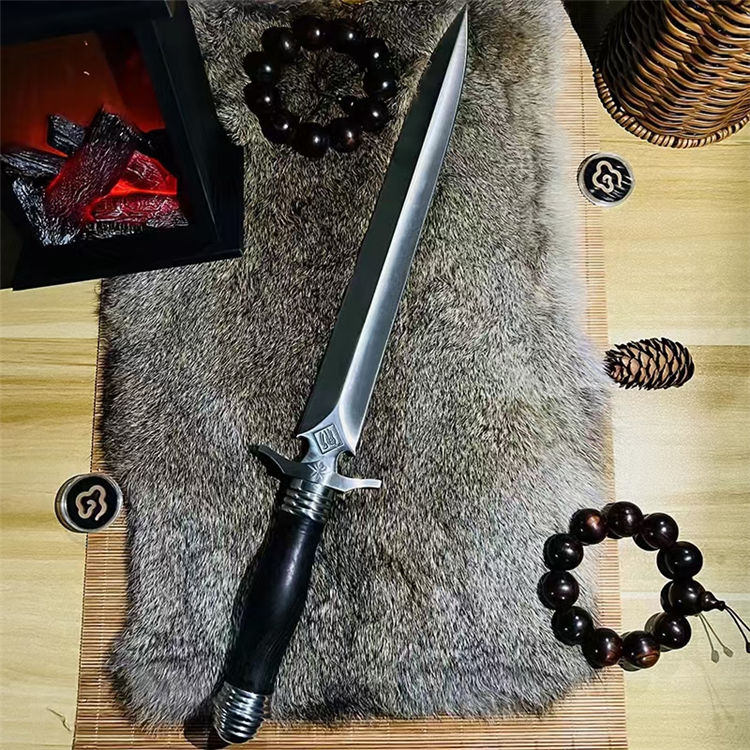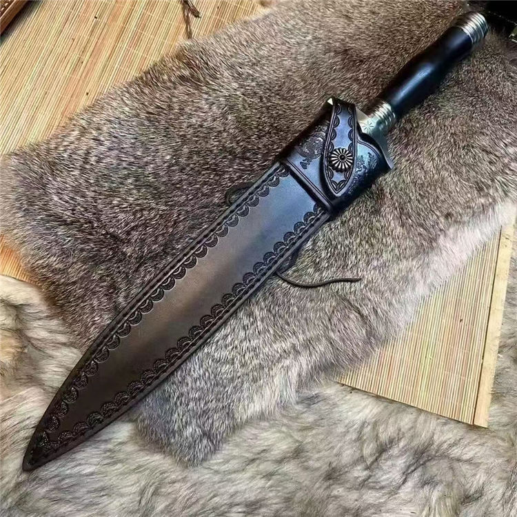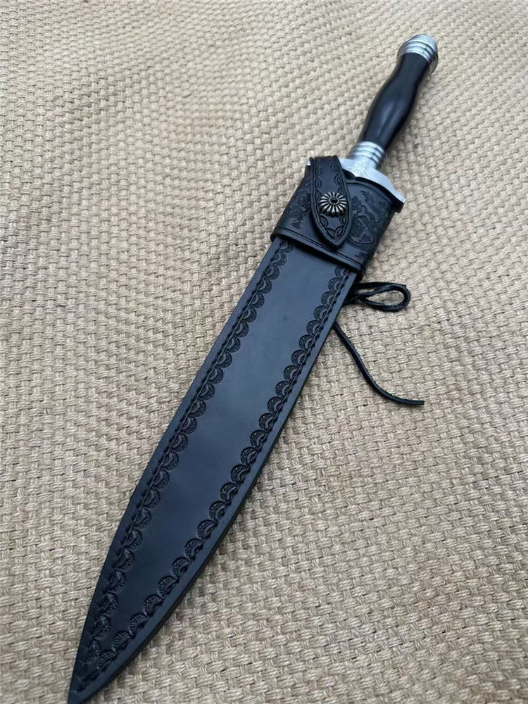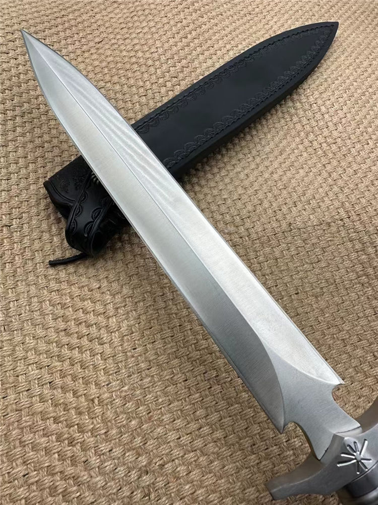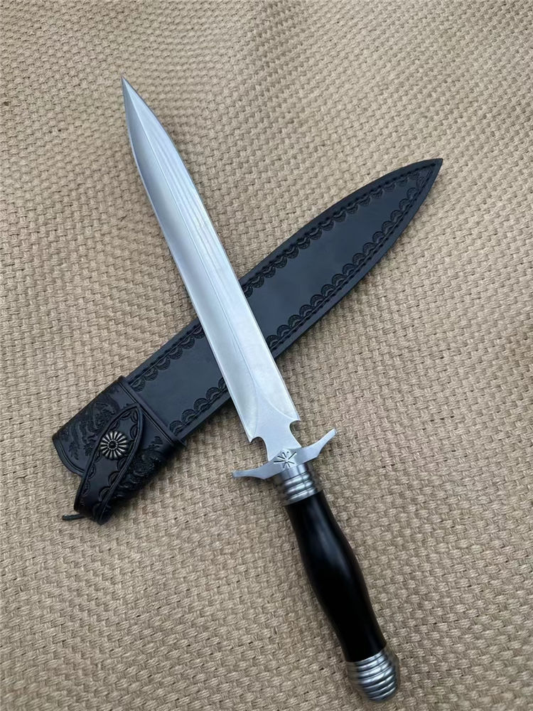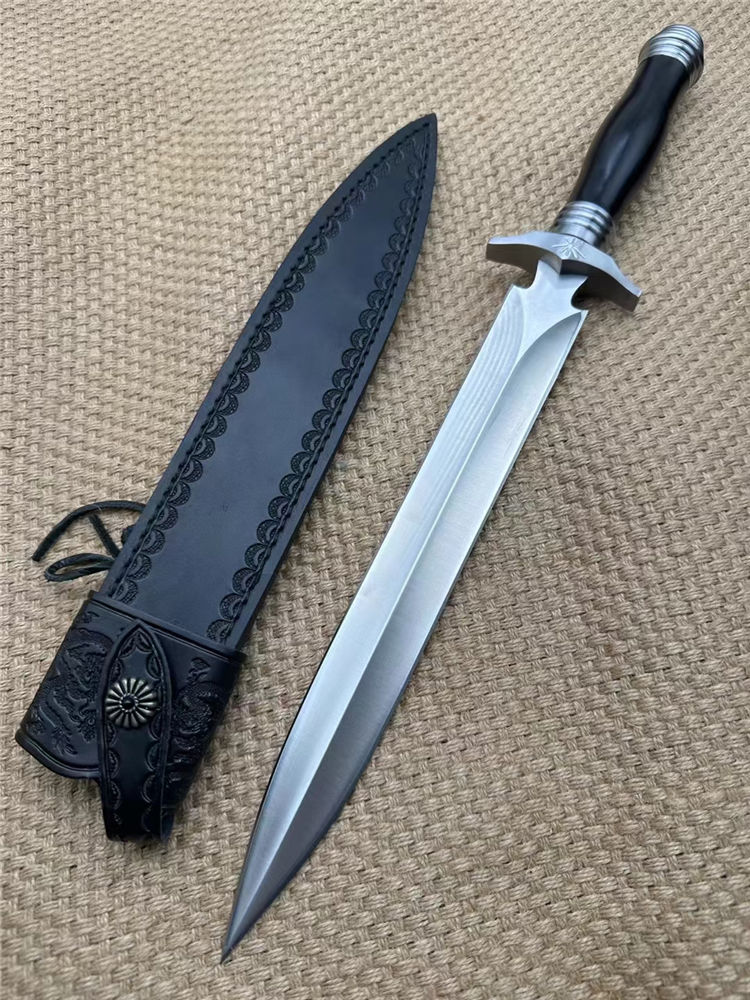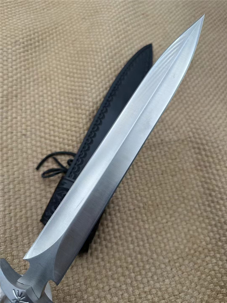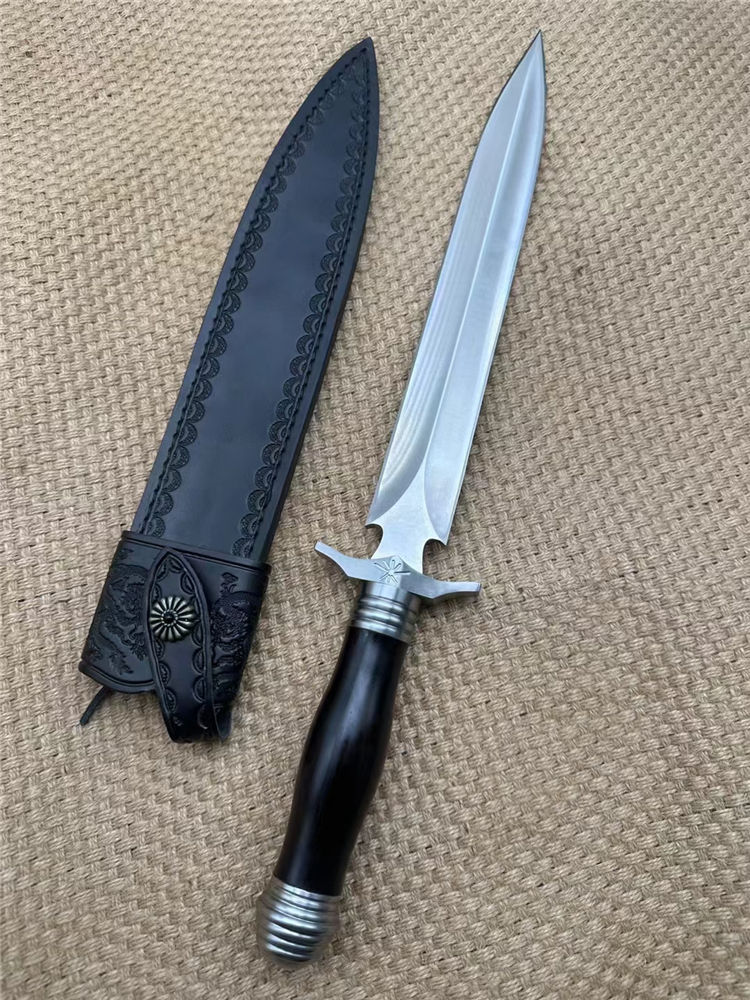 刀奴大号螺旋双锋直刀 全长:45cm 刃长:29.5cm 刃厚:7.0mm 刃宽:3.5cm 钢材:ATS34 手柄:黑檀木 硬度:61HRC+深冷处理 刀重:678g 结构:一体龙骨 皮套:牛皮