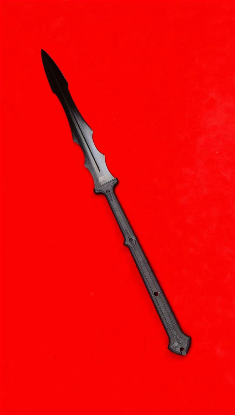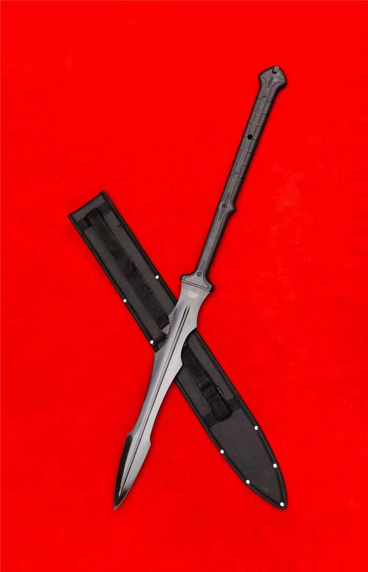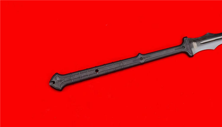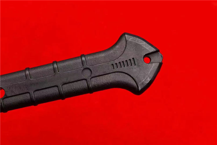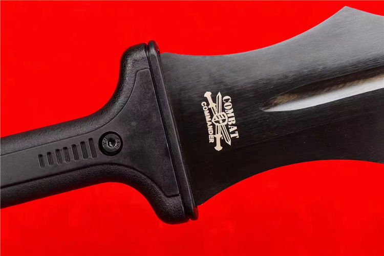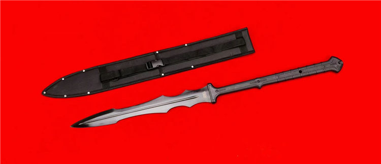 美国联合UC3459指挥官双手开山砍刀 全长:102cm 刃长:51cm 刃宽:6cm 刃厚:4mm 材质:1065碳钢制成 表面:黑色硬质涂层 手柄:加长手柄由尼龙纤维制成,握持质感十足,非常结实 尼龙护套配有可调节的快速释放肩带,让您轻松收纳和携带剑