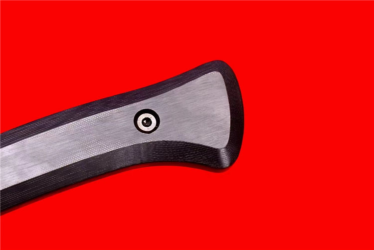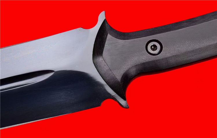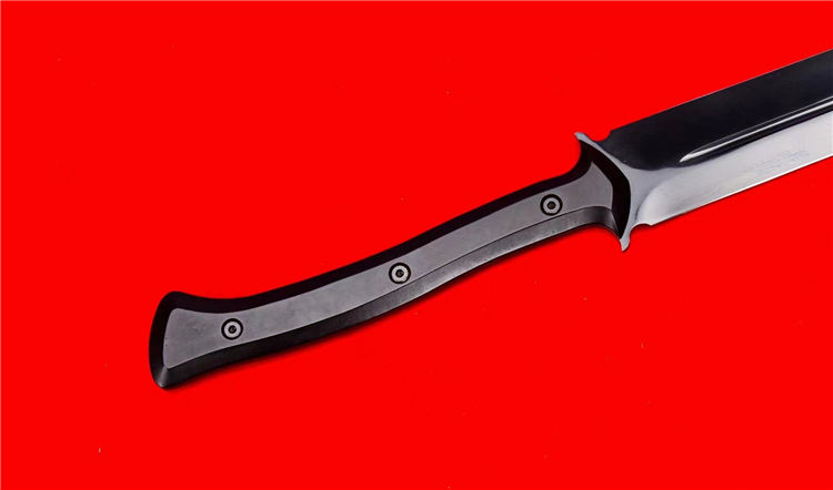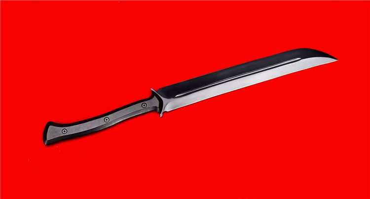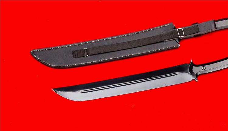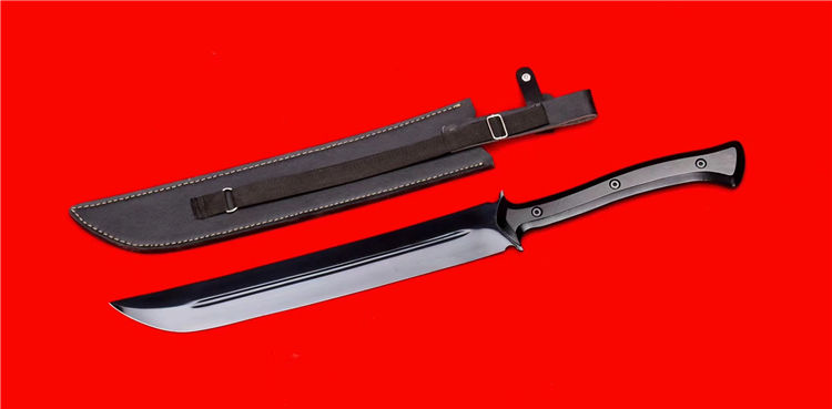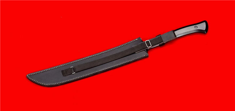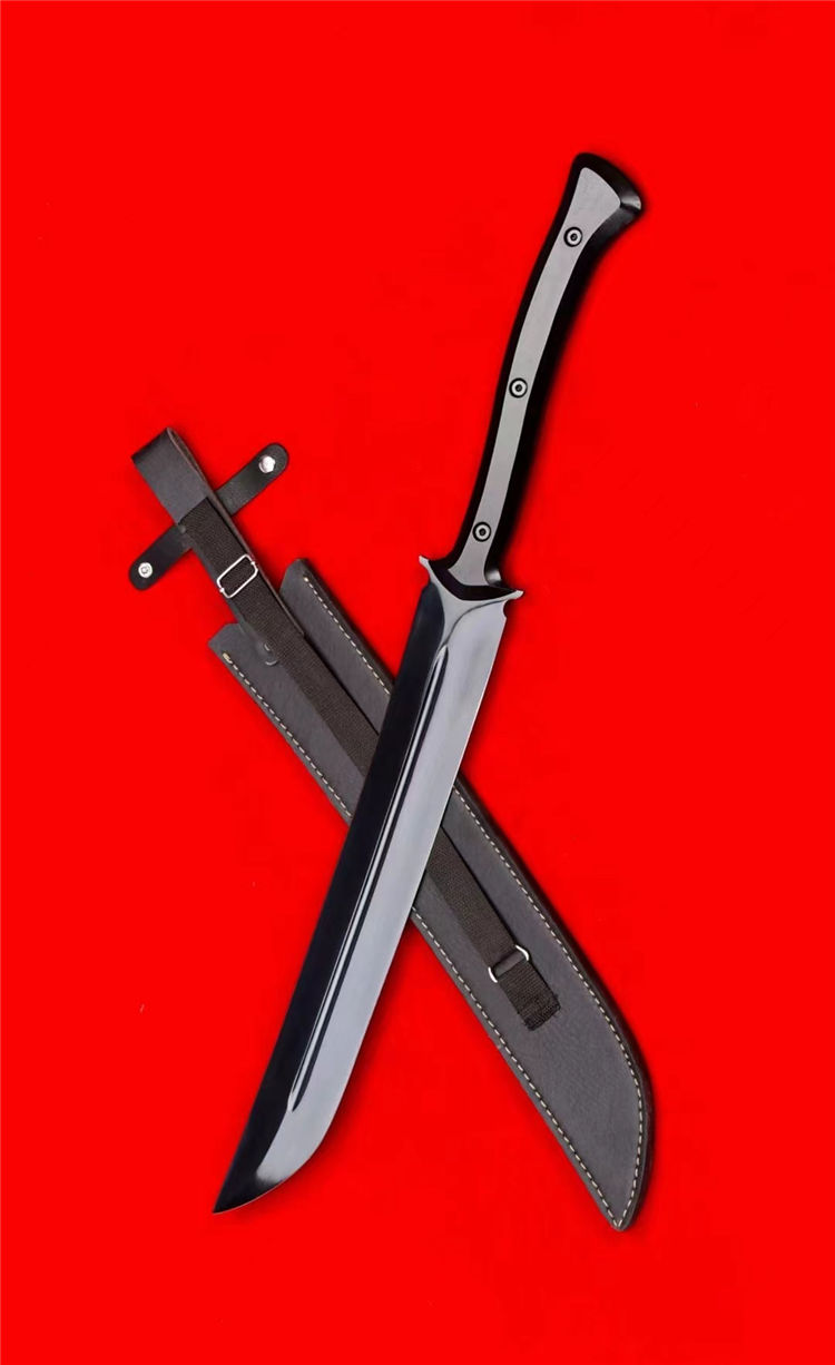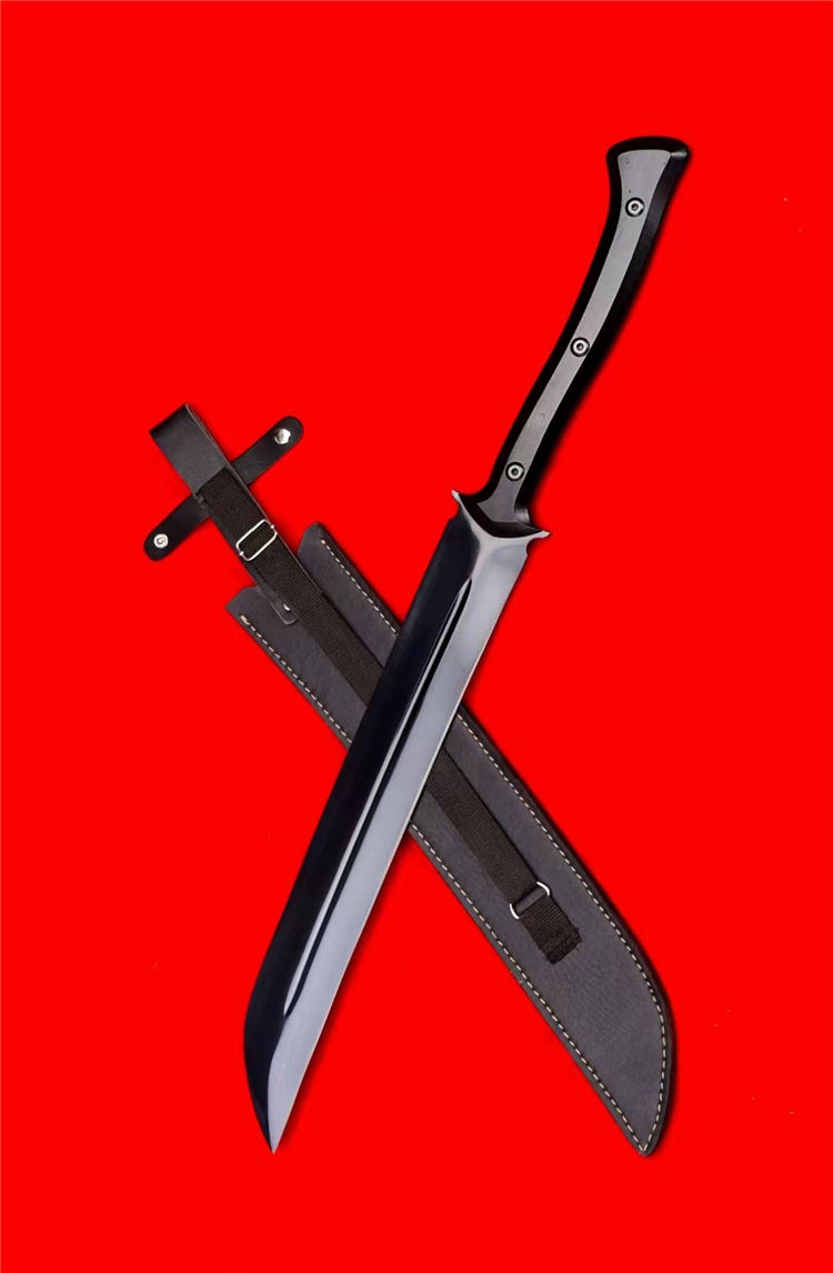 外贸大猩猩K18开山砍刀 全长:73cm 刃长:43cm 刃宽:6cm 刃材:高锰钢,手工研磨开槽 表面:黑色涂层处理 手柄:G10手柄 刀套:PU鞘