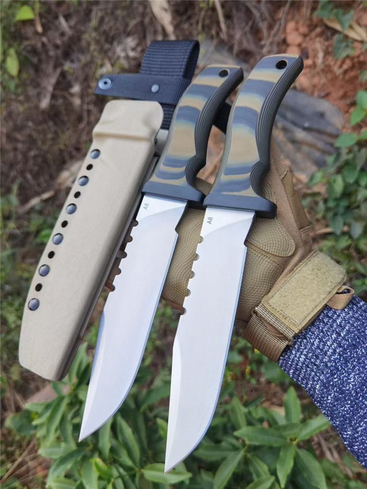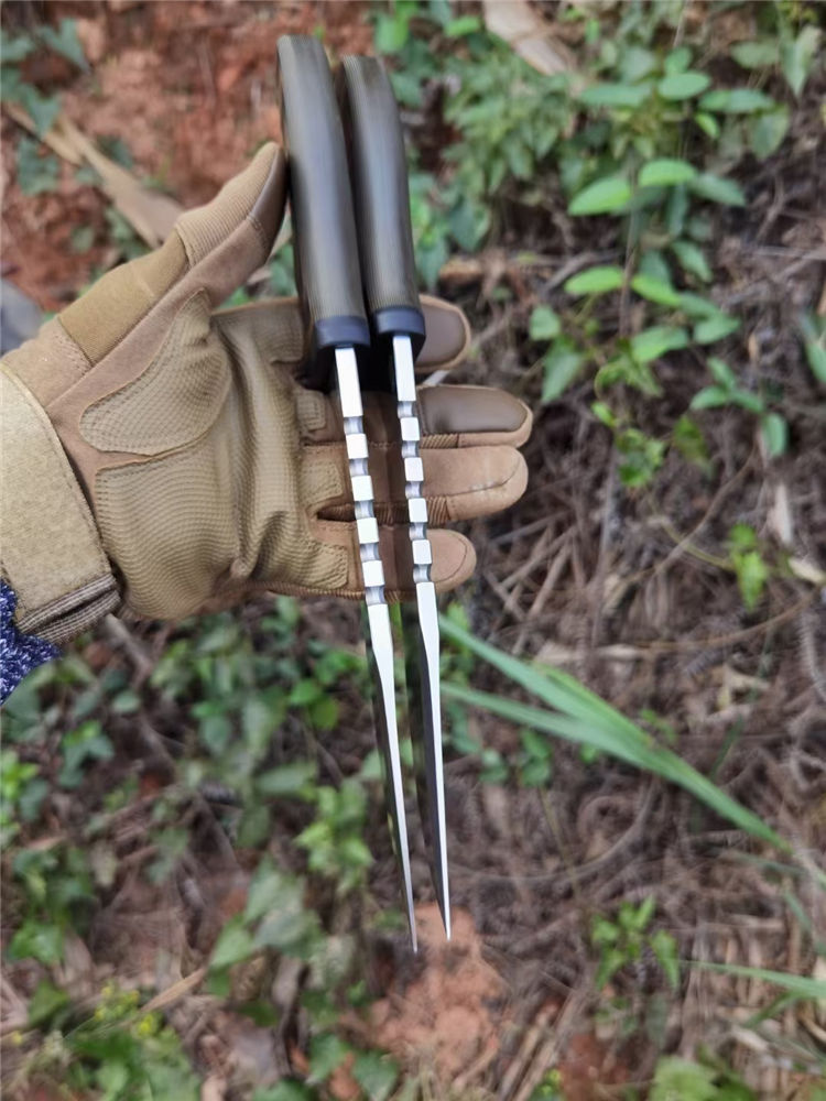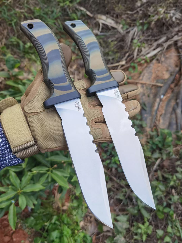 柄材:黑沙漠双色G10"复合材质+环氧基树脂合成材质,全包柄设计,龙骨结构,一体A8钢龙骨入柄内凹槽卯钉锁定