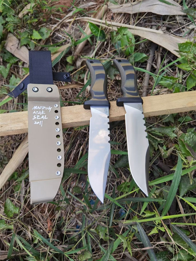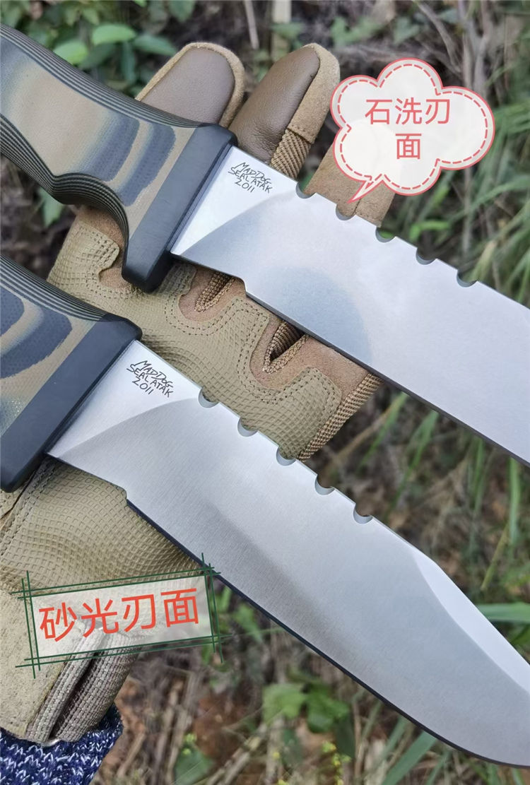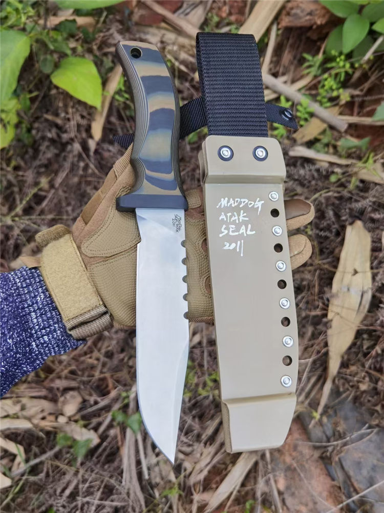 海豹ATAk疯狗直刀 全长:305cm 刃长:180mm 刃宽:39mm 刃厚:6mm 表面:珠光石洗 净重:349克 刃材:A8合金钢 硬度:60HRC 热处理:专业真空热处理 表面:手工砂光&石洗工艺效果 柄材:黑沙漠双色G10"复合材质+环氧基树脂合成材质,全包柄设计,龙骨结构,一体A8钢龙骨入柄内凹槽卯钉锁定 刀鞘:战术三层进口沙漠色K板刀鞘 包装:手工盒子包装,Mad Dog Seal ATAK 疯狗—高级战术突击刀
