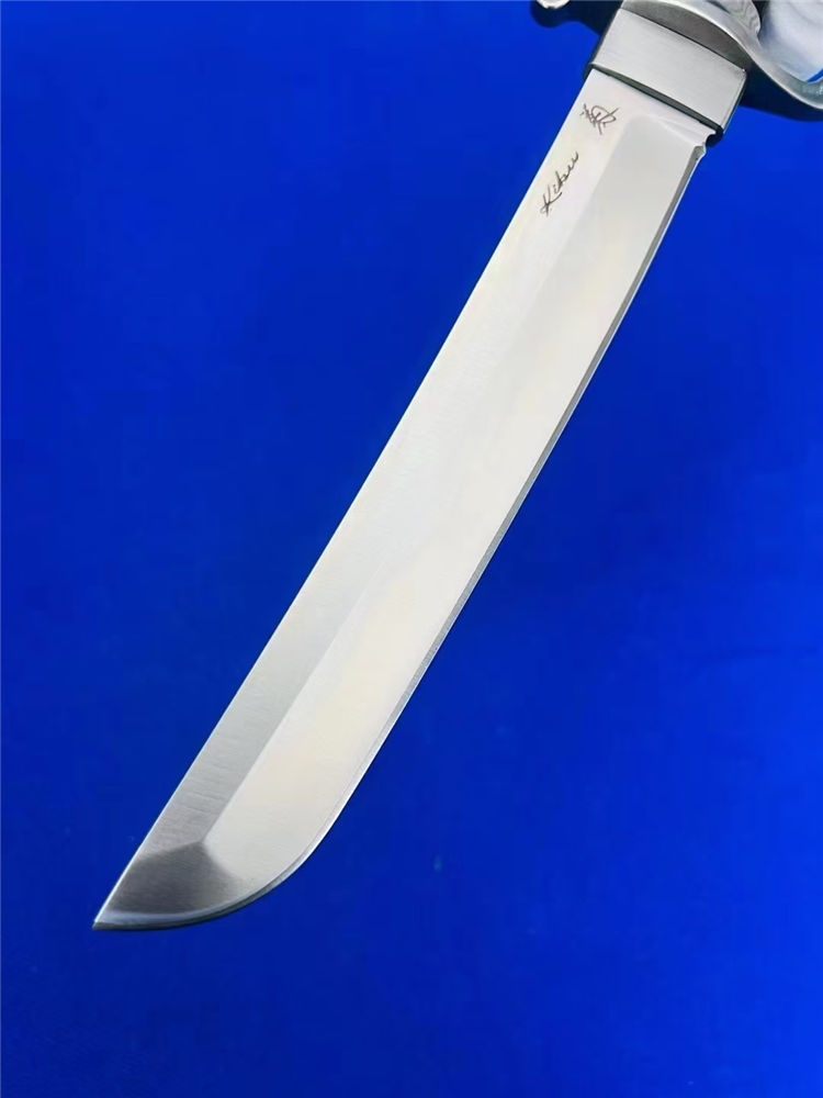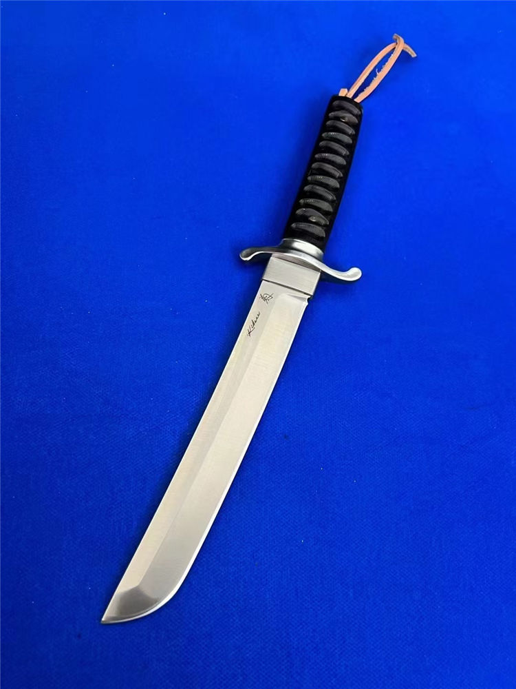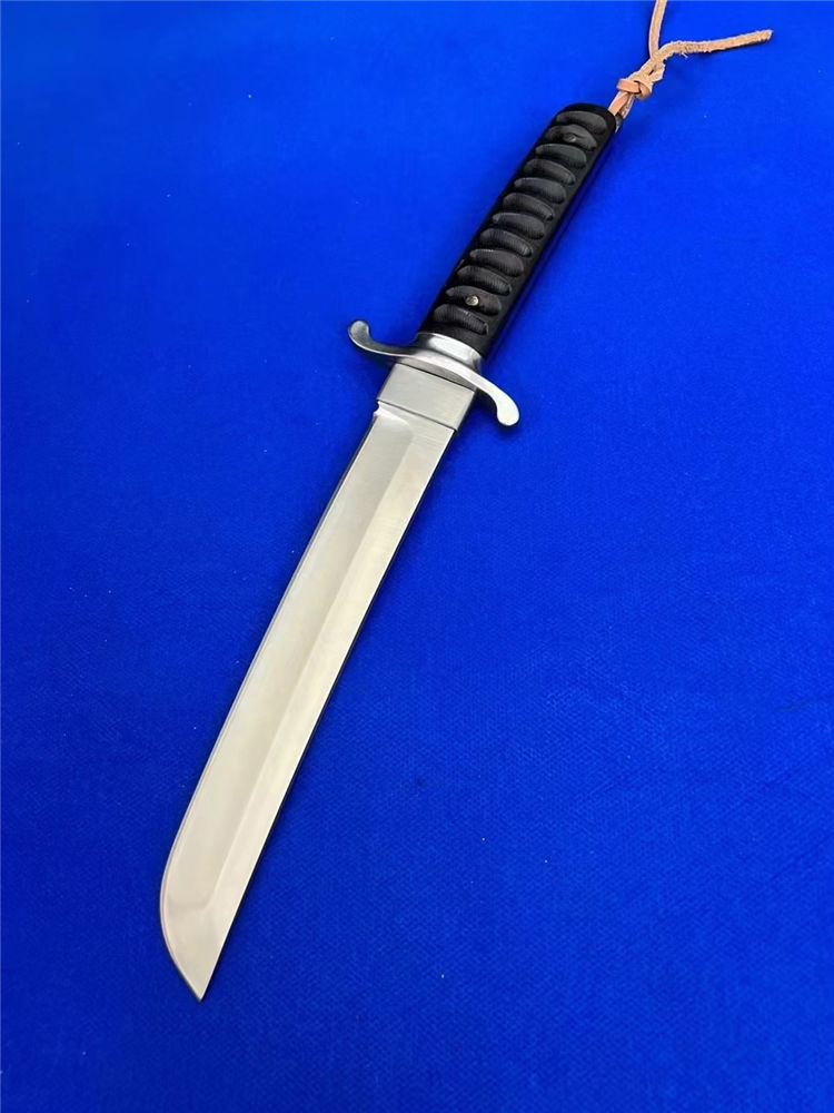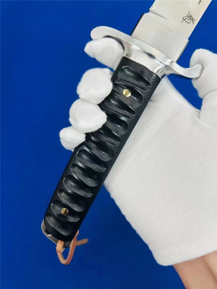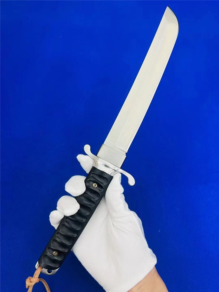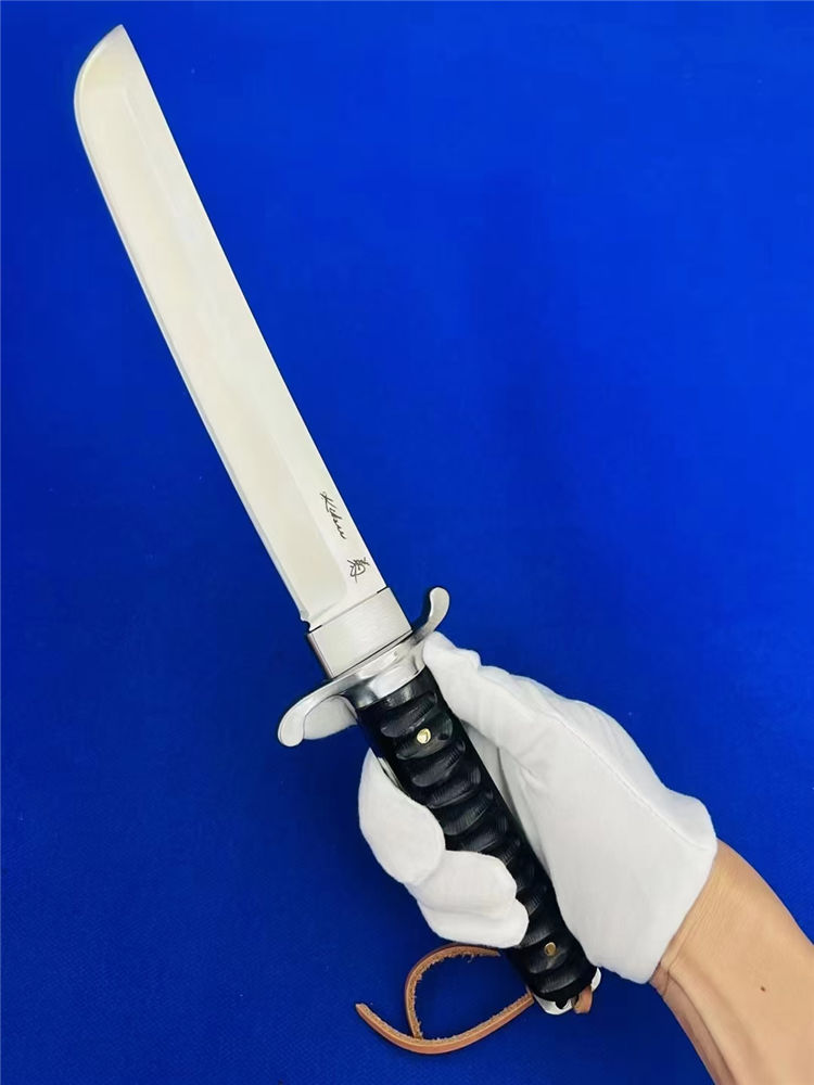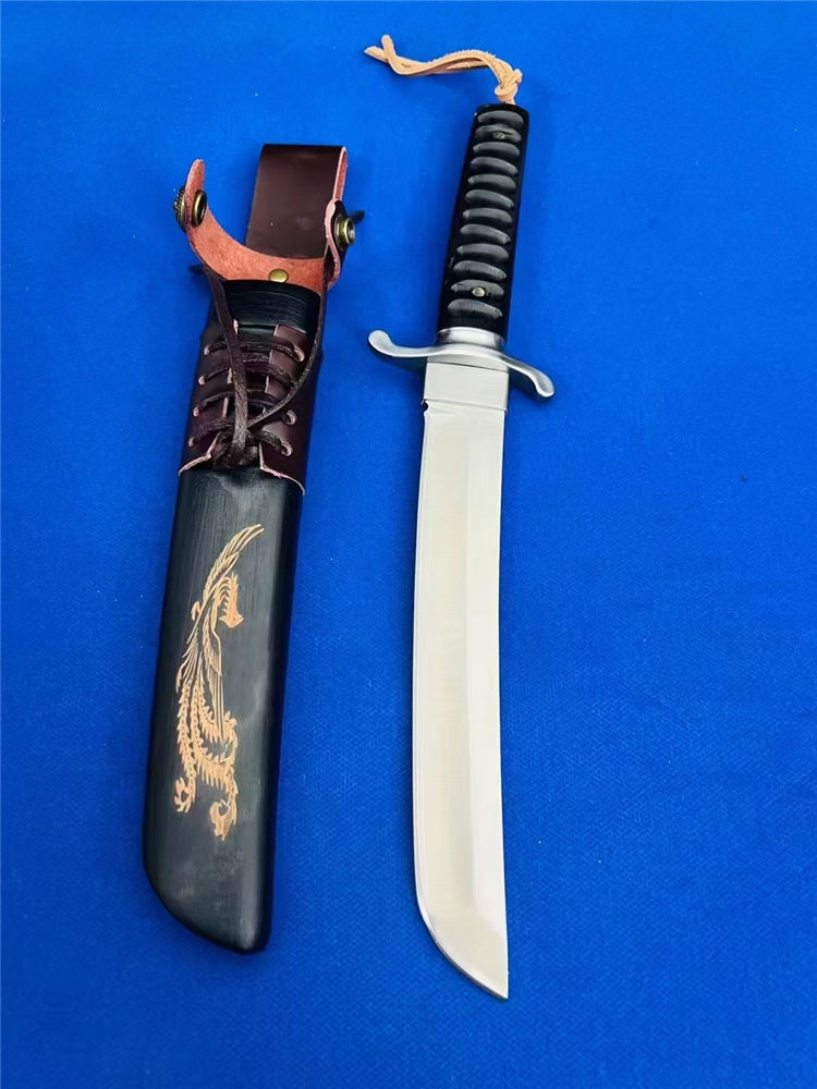 复古木鞘版葵花武士直刀 全长:360mm 刃长:200mm 柄长:145m 刃宽:30mm最宽处 刃厚:5.2mm 刃材:D2钢 刀重:463g/590g 含皮套 毛重:760g(含包装盒) 硬度:59HRC 表面:砂光处理 柄材:黑檀木 结构:一体龙骨贯穿 配套:乌木手工龙凤图腾K鞘 包装:黑礼盒