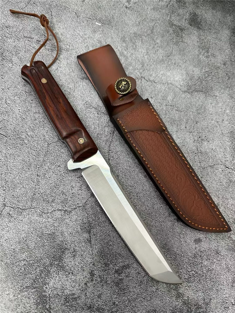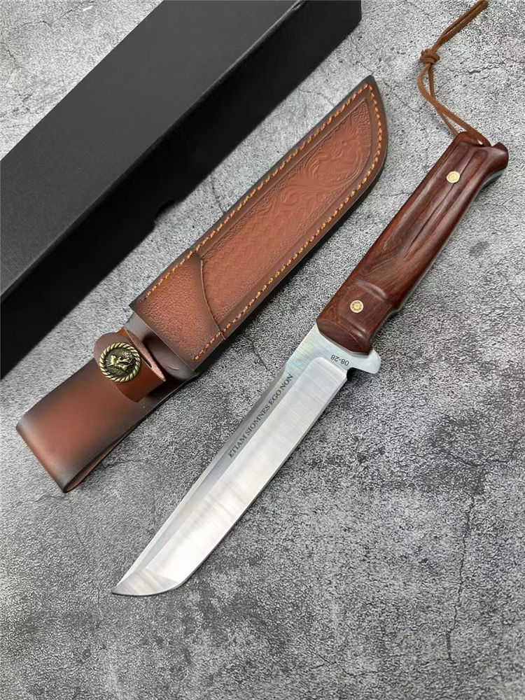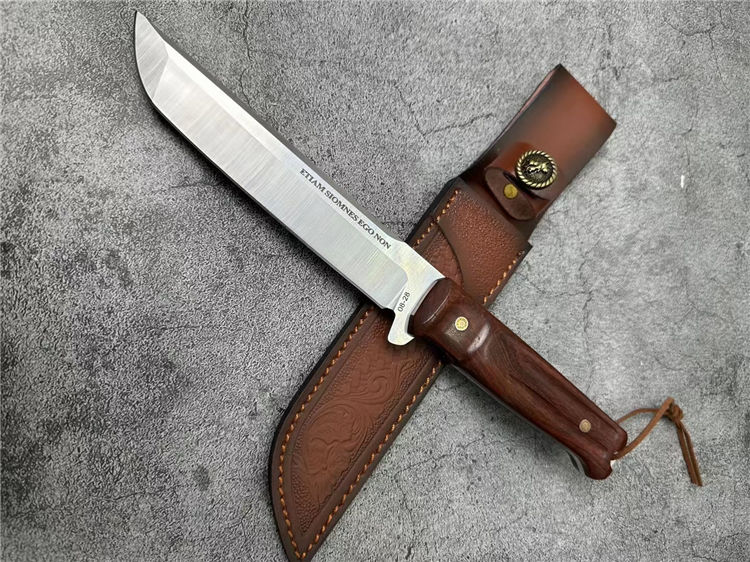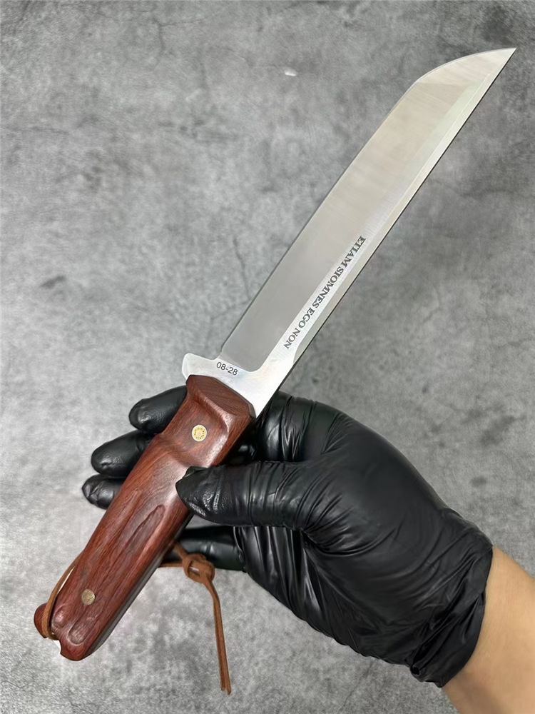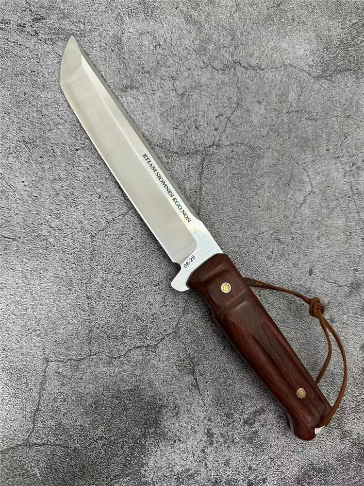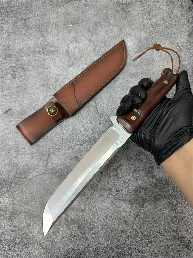 极武端力入侵者直刀 全长:30cm 刃材:8CR13 刃长:16.7cm 刃厚:4.3mm 刃宽:2.7CM 硬度:58HRC 重量:285g 表面:砂光 柄材:红檀木柄 电脑螺纹 刀鞘:雕花皮套