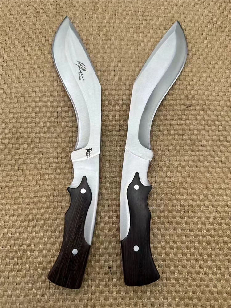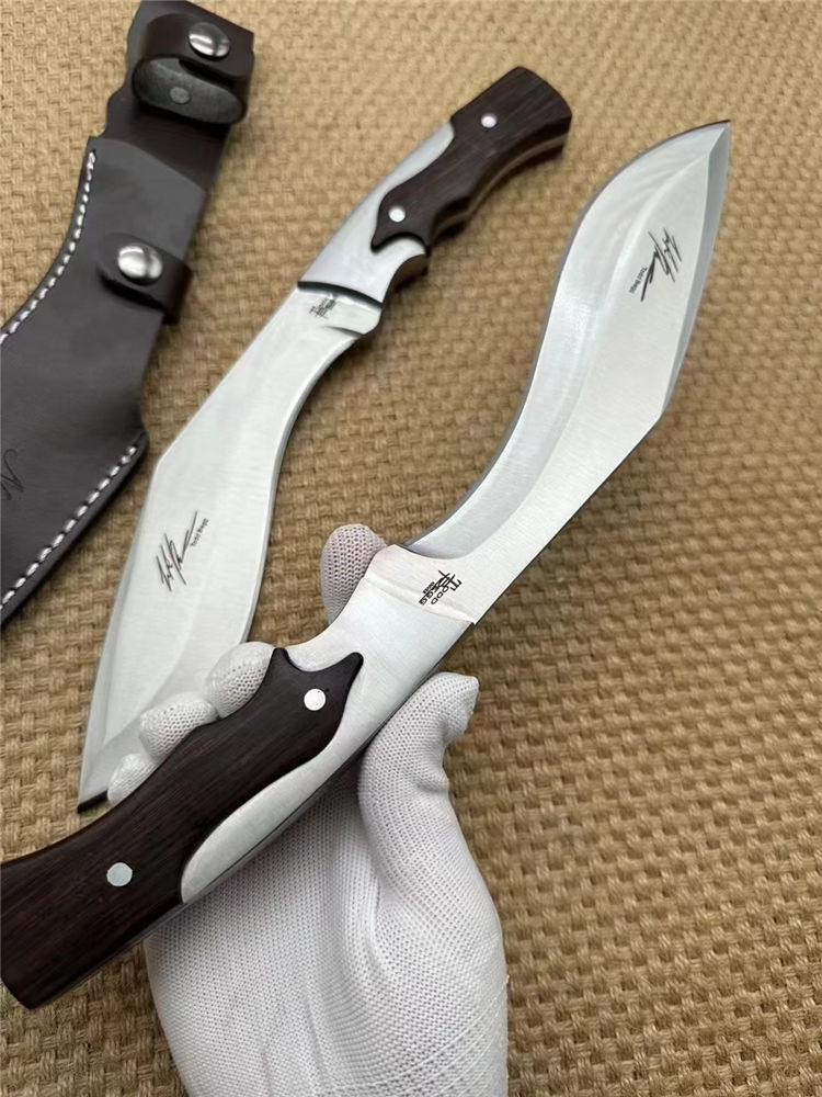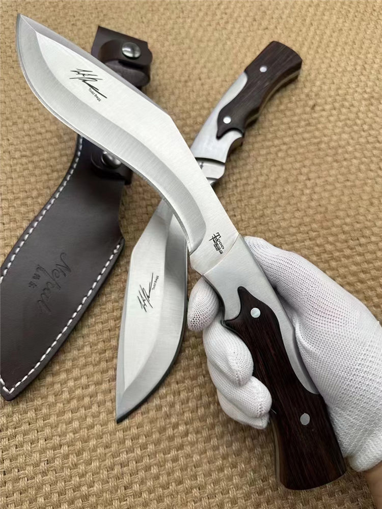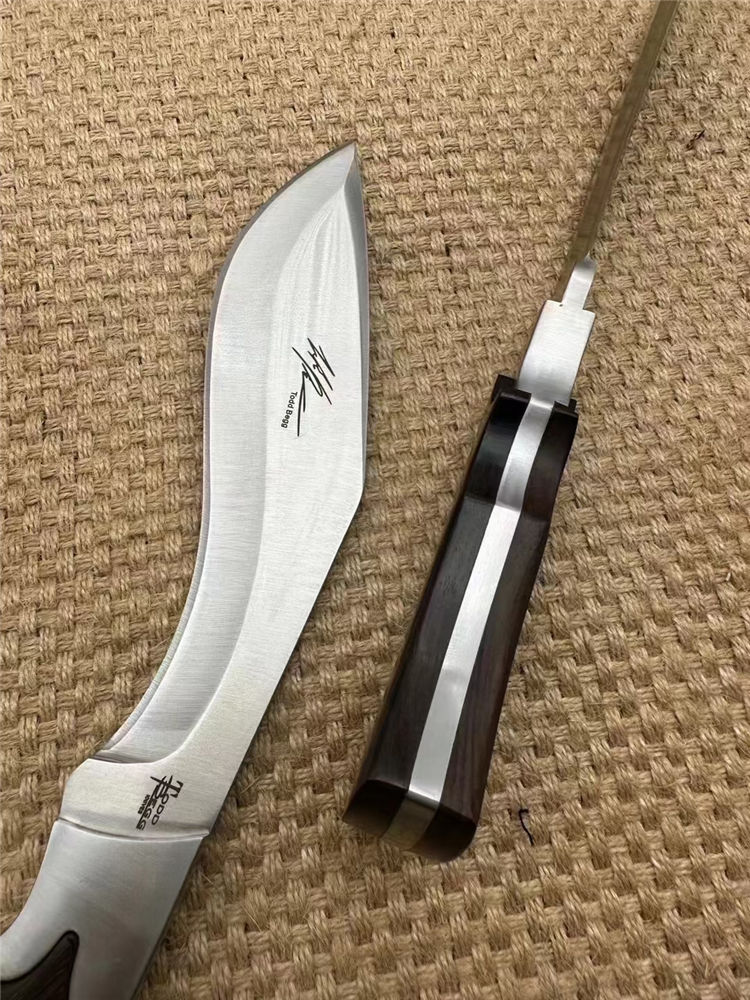 托德贝格皇家狗腿弯刀 全长:32cm 刃长:19.5cm 柄长:12cm 刃厚:0.5cm 刃宽:4.5cm 刃材:8CR18MOV 柄材:一体钢+钢头+酸枝木 硬度:58HRC 净重:639克(含包装) 锁定:直锁 表面:沙光 其他:皮套礼品盒