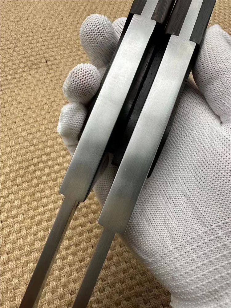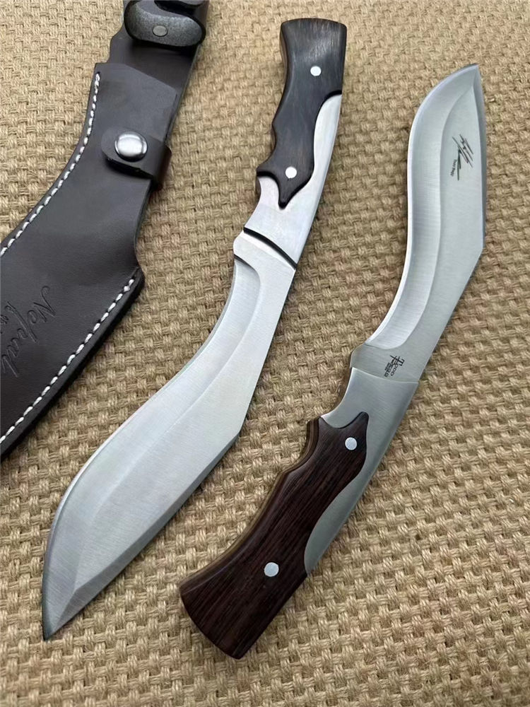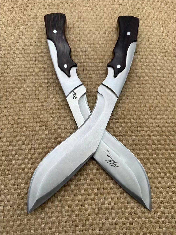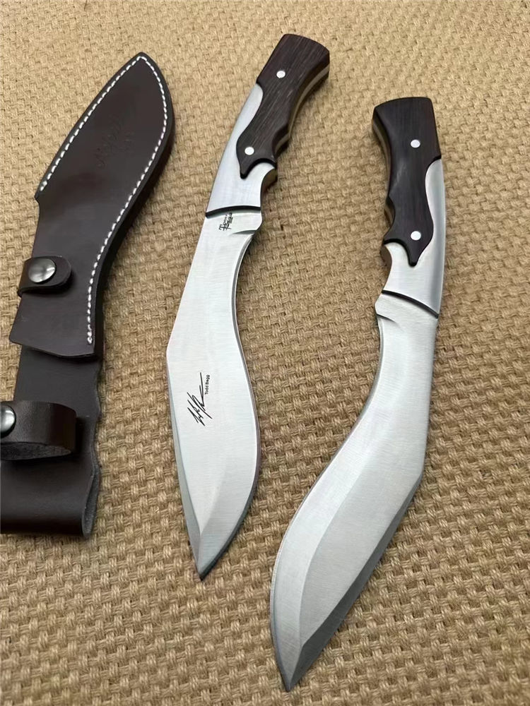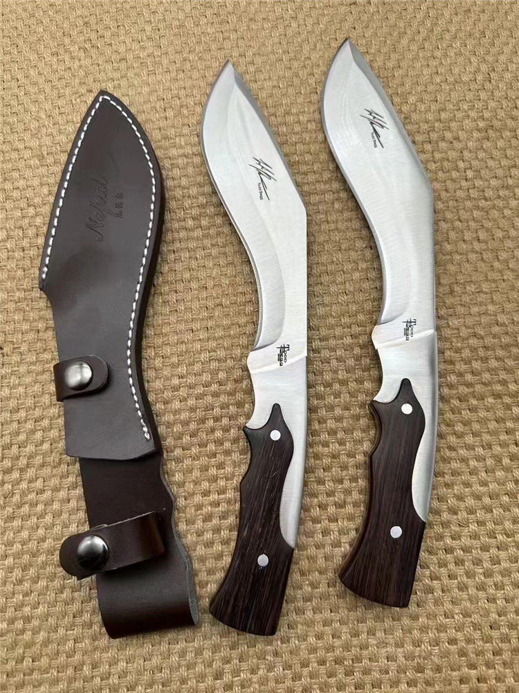 托德贝格皇家狗腿弯刀 全长:32cm 刃长:19.5cm 柄长:12cm 刃厚:0.5cm 刃宽:4.5cm 刃材:8CR18MOV 柄材:一体钢+钢头+酸枝木 硬度:58HRC 净重:639克(含包装) 锁定:直锁 表面:沙光 其他:皮套礼品盒