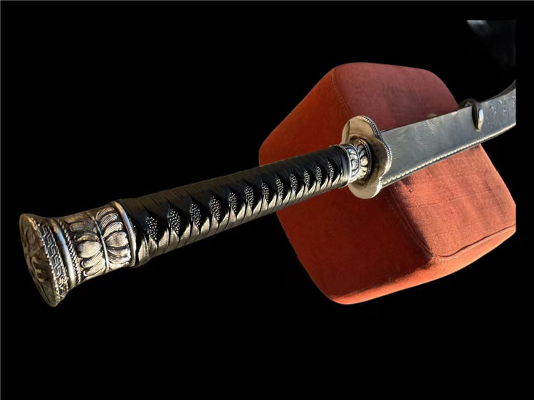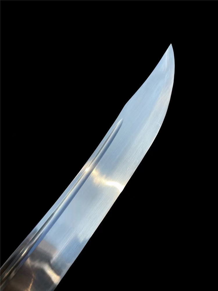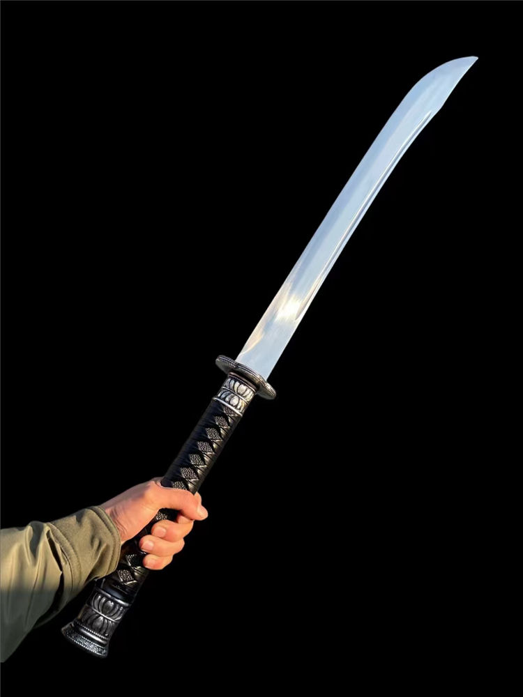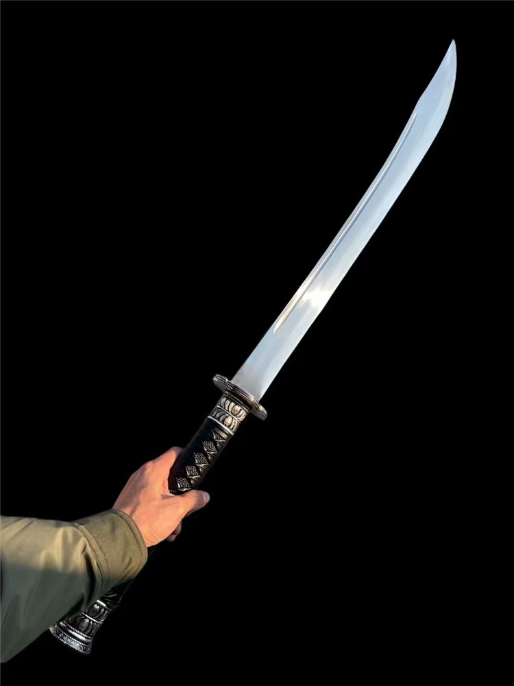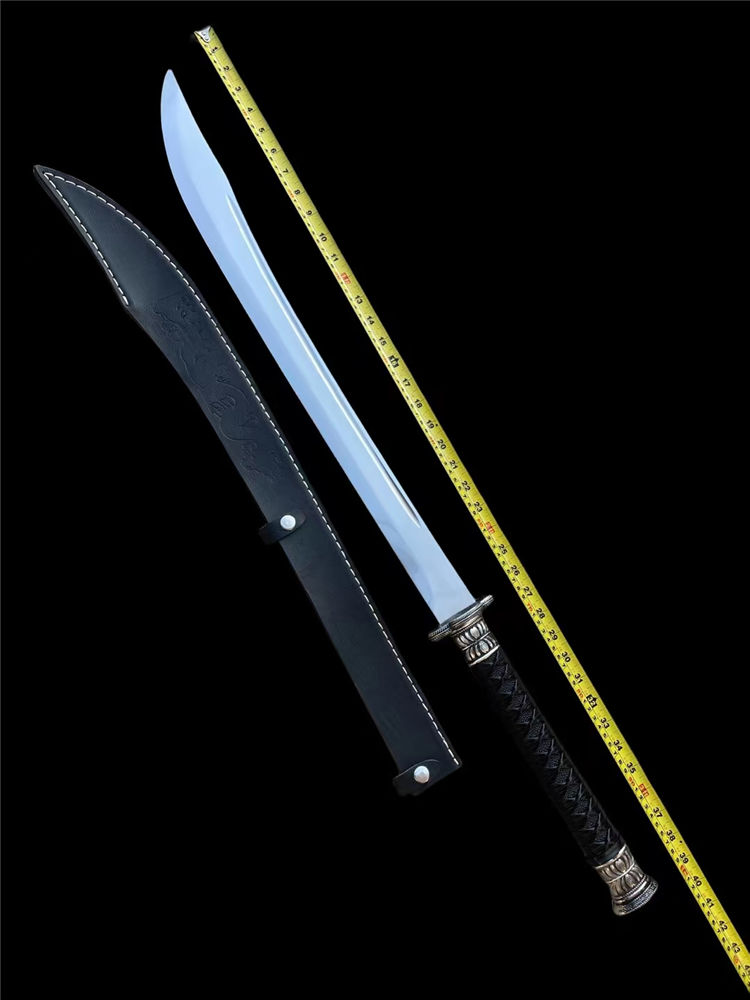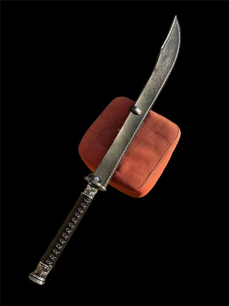 影视宋戒刀 总长:98cm 刃长:65cm 刃宽:5.5cm 刃厚:0.6cm 钢材:65锰钢淬油工艺