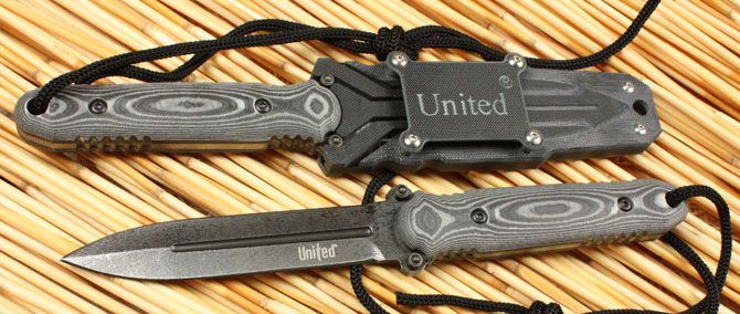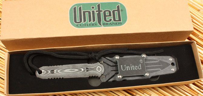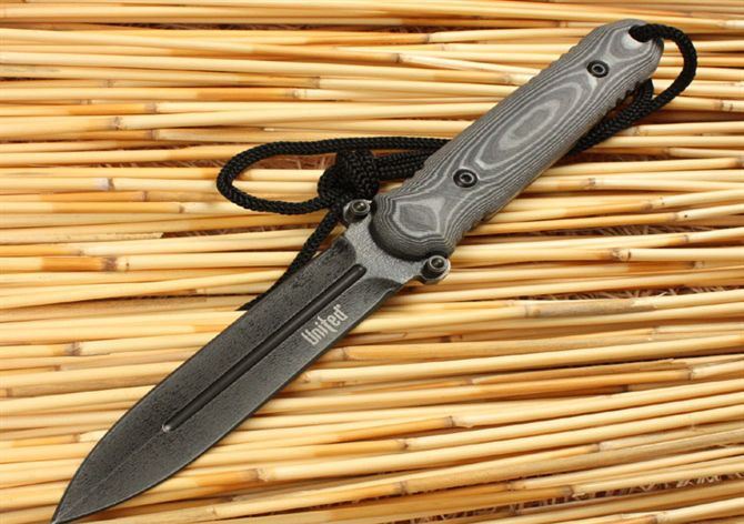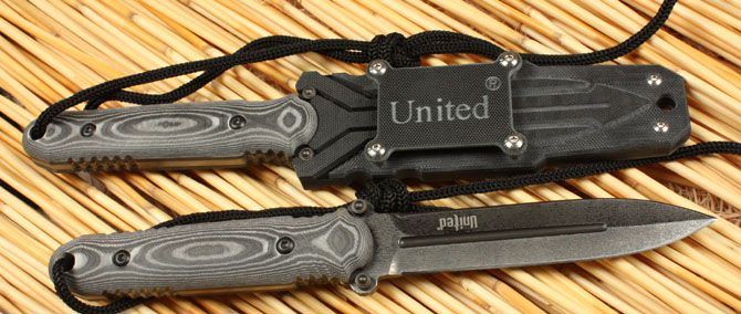 联合刀具皱纹钢-海豹双刃匕 全长:25.8cm 刃长:13cm 刃宽:2.1cm 刃厚:0.45cm 刃材:皱纹钢 表面:钛金处理(防锈硬度高,不易刮花) 硬度:58HRC 柄材:米卡塔 柄长:12.8cm 鞘材:双层G10 刀重:226克 鞘重:110克 总重:336克 品质:高品质 产地:国内代工 带United标志的腰带夹,可横插或竖插在腰带上