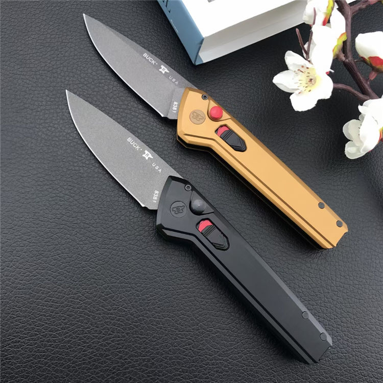 巴克838Deploy侧开跳刀 总长:20.8cm 刃长:8.2cm 刃宽:2.7cm 刃厚:2.7mm 刃材:440C 柄材:T6铝 柄长:12.6cm 柄宽:23.4mm 柄厚:12mm 重量:130G