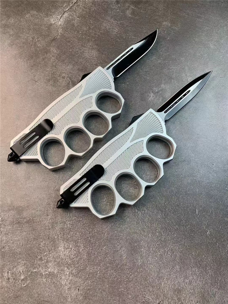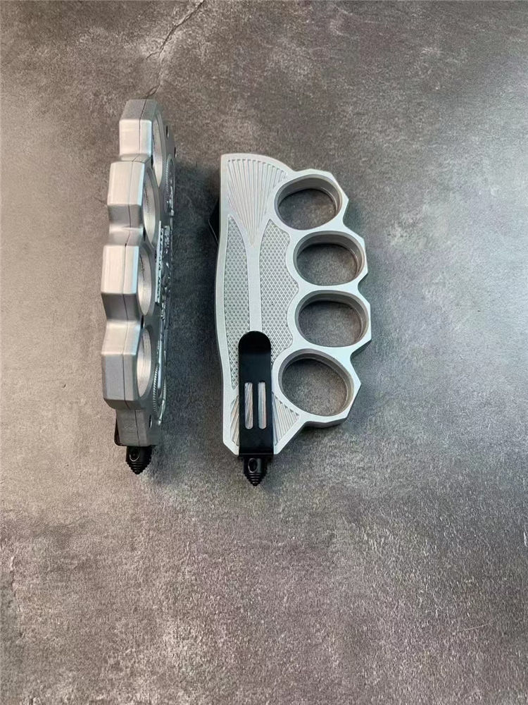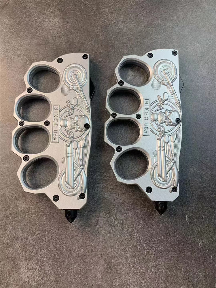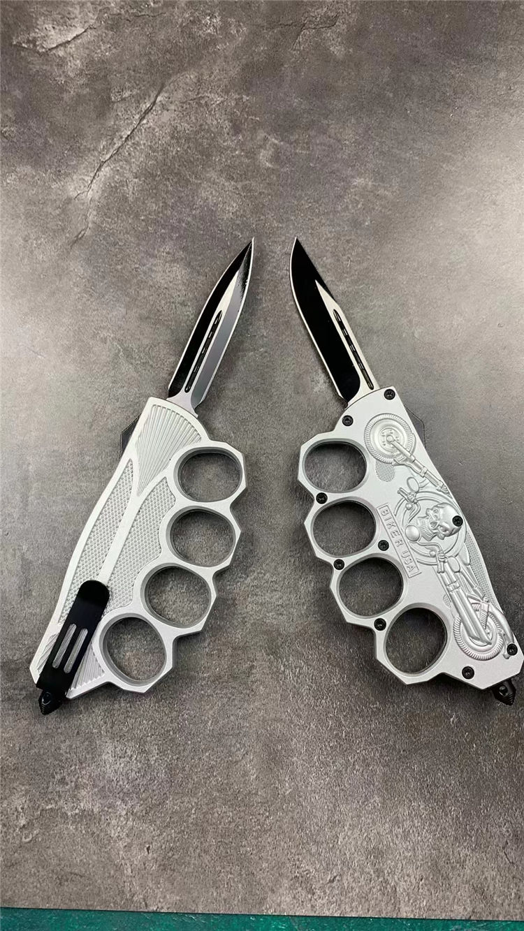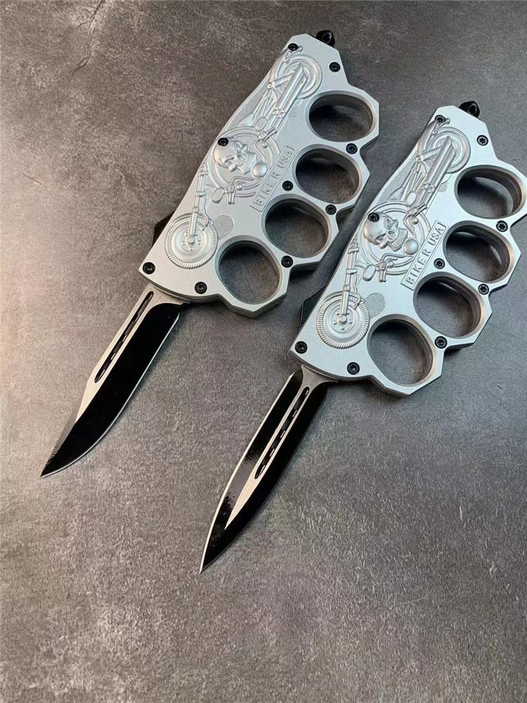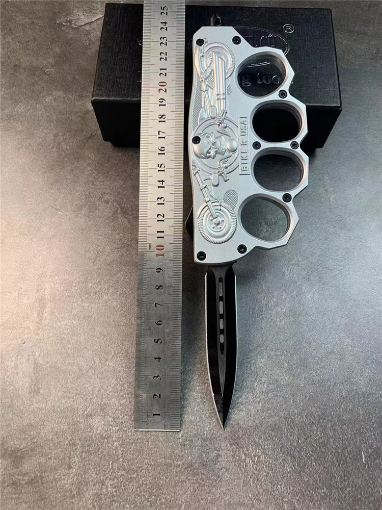 哈雷摩托车拳套直出跳刀 总长:24.5cm 刃长:9cm 刃材:440 硬度:60 柄材:航空铝合金 重量:315克 配置:带尾锤破窗功能,背夹,尼龙刀套,礼盒