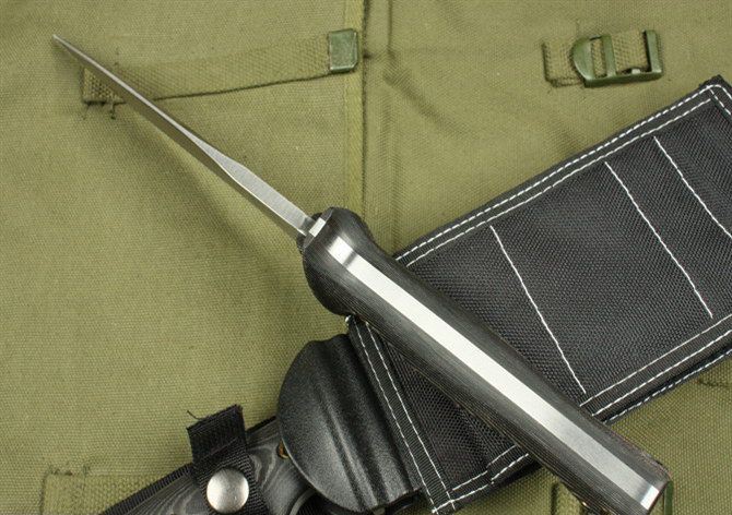全长:30cm 刃长:16cm 柄长:14cm 刃厚:6mm 刃宽:3.5cm 刃材:5Cr13 柄材:米克塔 硬度:56HRC 净重:380克 毛重:640克 表面处理:手工砂光