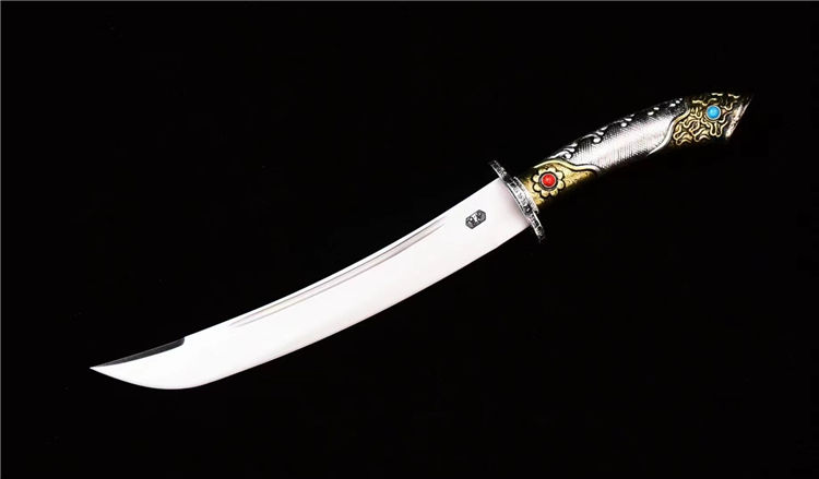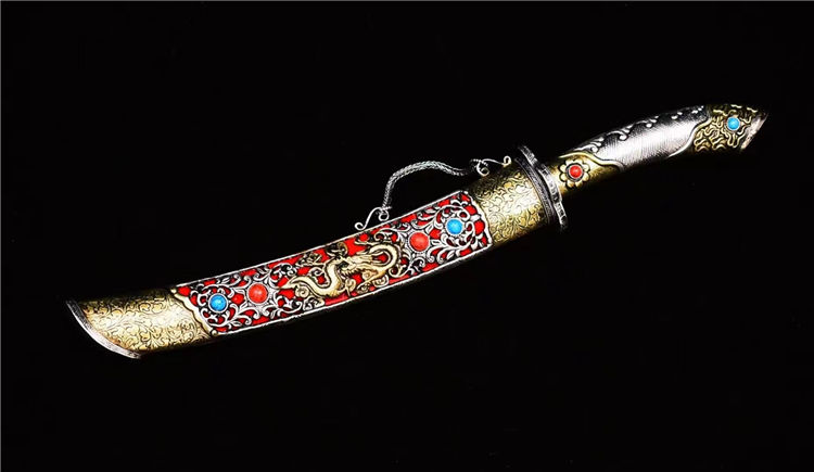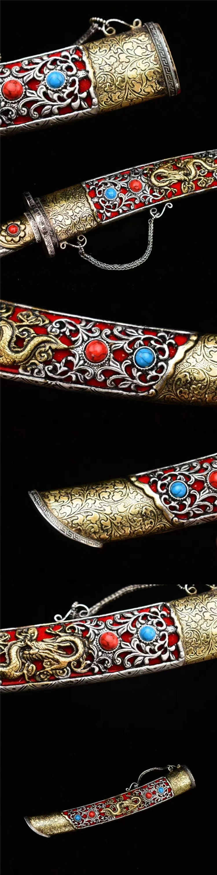 民族藏刀 全长:48cm 刃长:28cm 刃材:高碳钢锻打 开槽研磨,实木柄鞘包裹铜制手工雕刻装具,非常适合收藏把玩,适合收藏把玩送礼