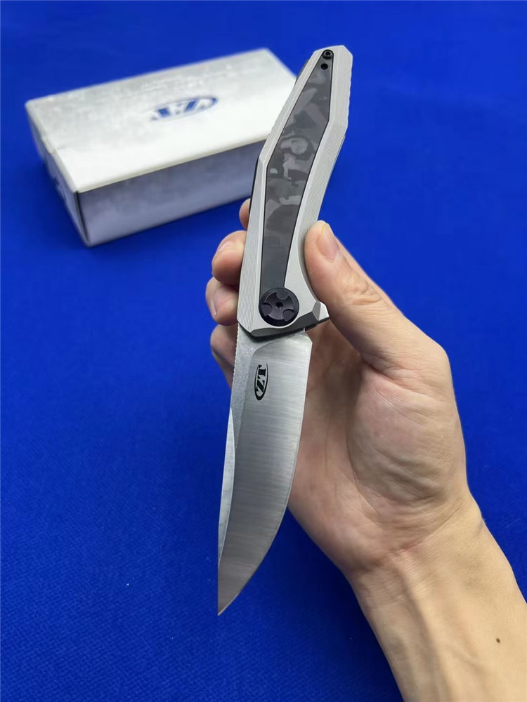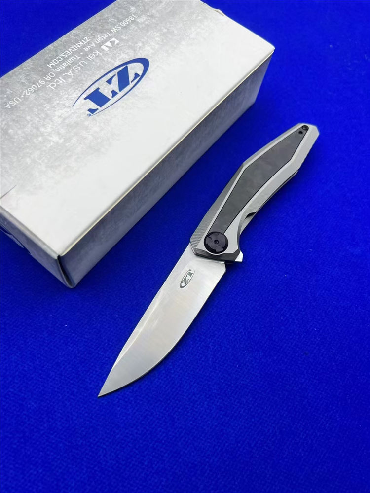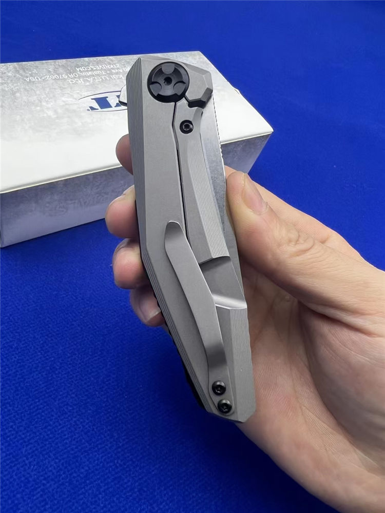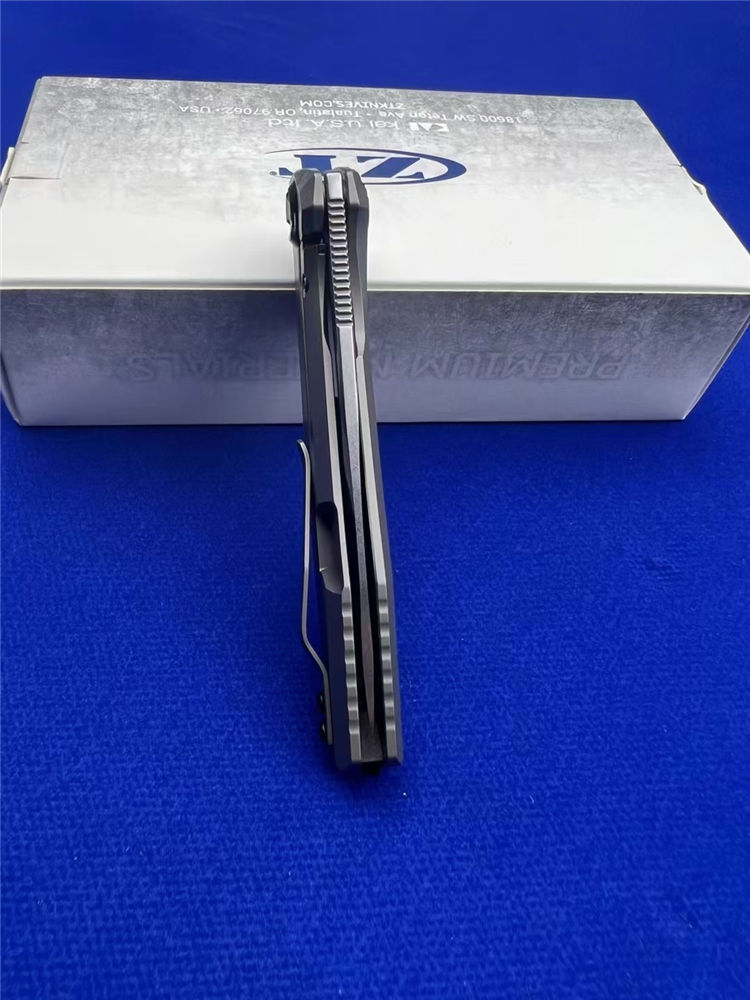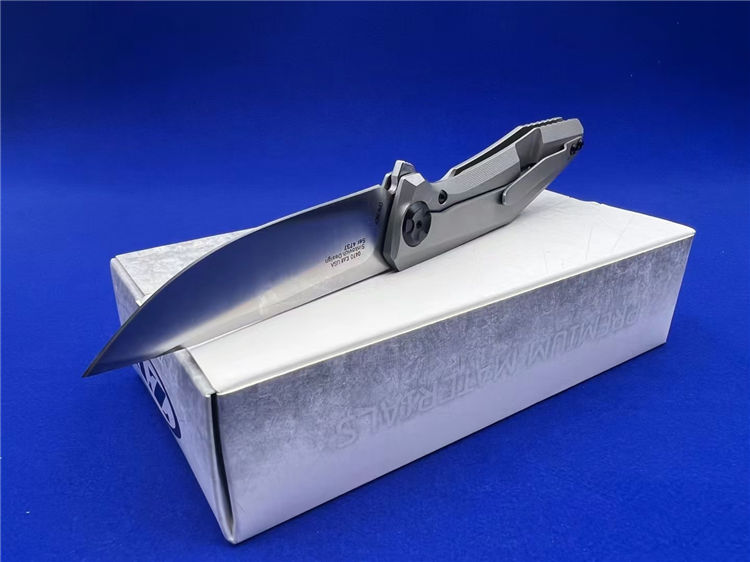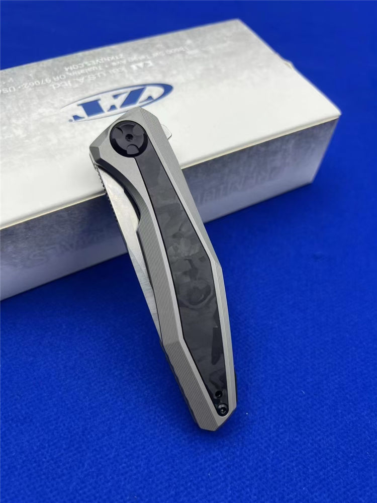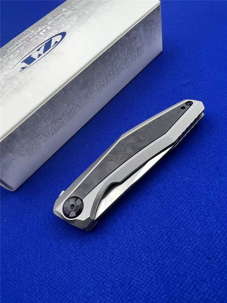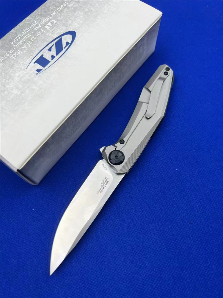 零公差ZT0470折刀 总长:19.5cm 刃长:8.8cm 柄长:10.9cm 厚度:3.6mm 材料:20CV 手柄:钛柄+碳纤维 硬度:60 净重:200g 系统:轴承系统
