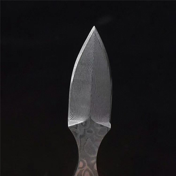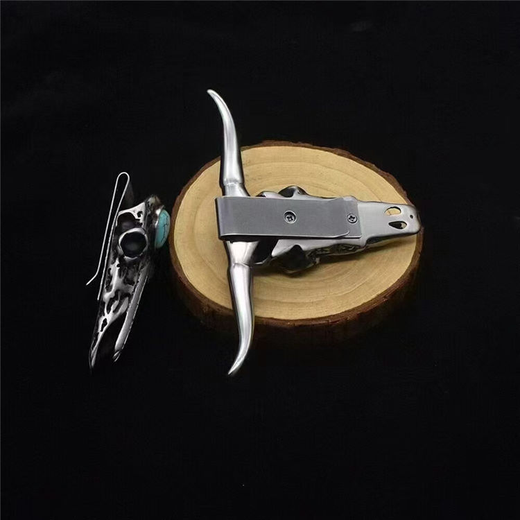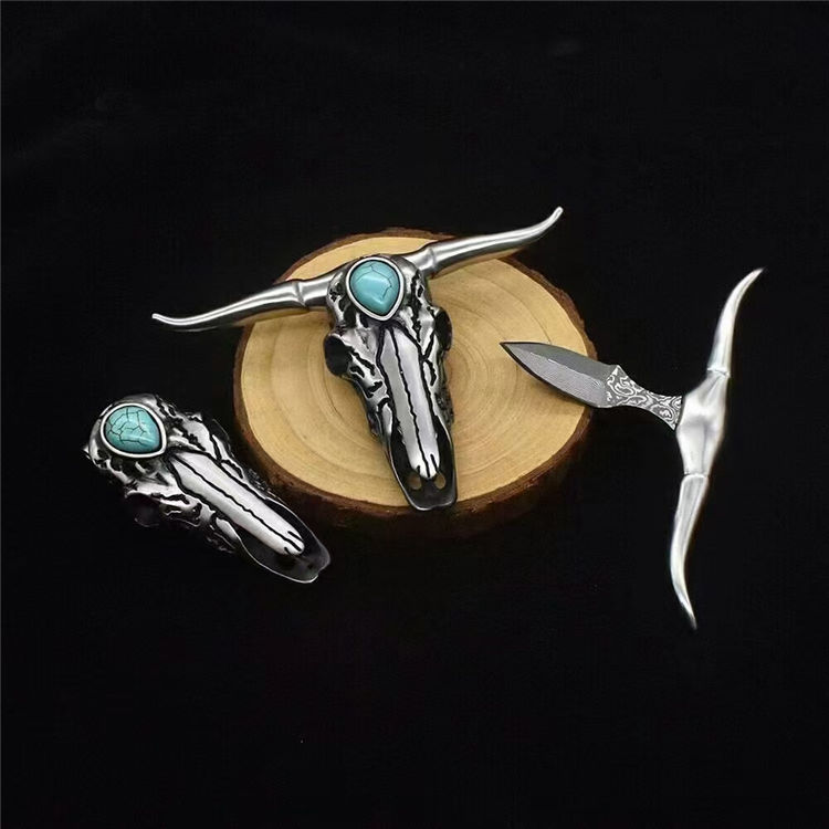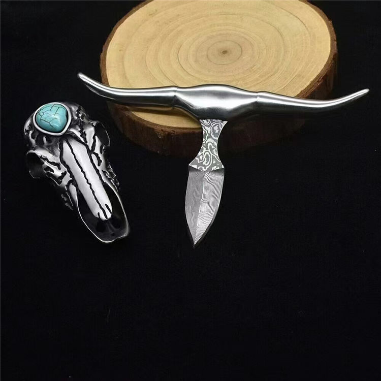 大马士革绿松石迷牛手刺 全长:7cm 柄宽:11cm 刃长:5cm 牛头:316不锈钢+绿松石(天然纹路颜色各异) 刃材:vg10大马士革 净量:111克