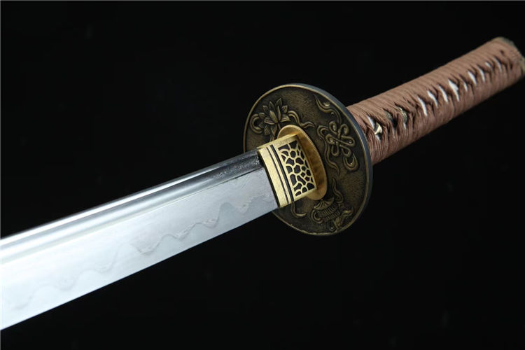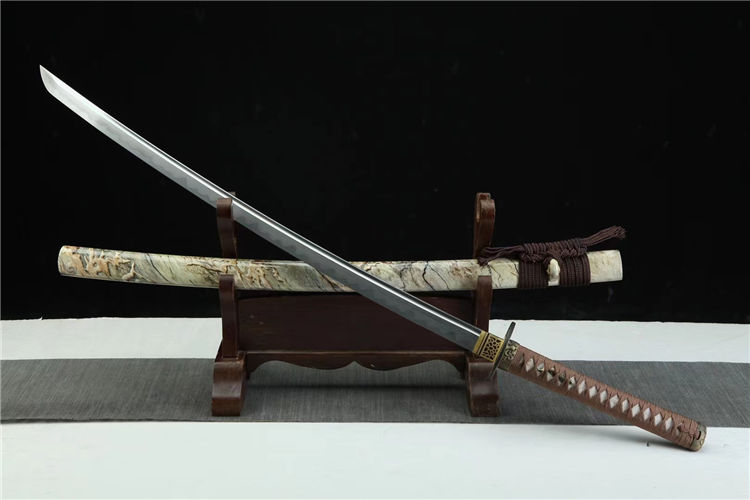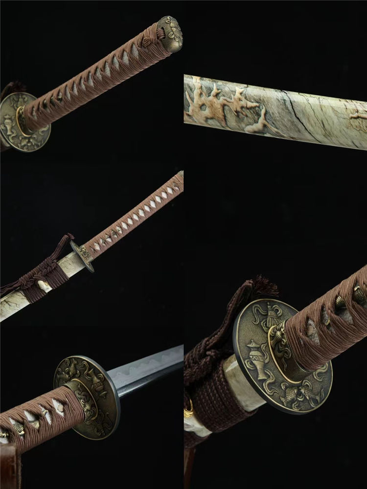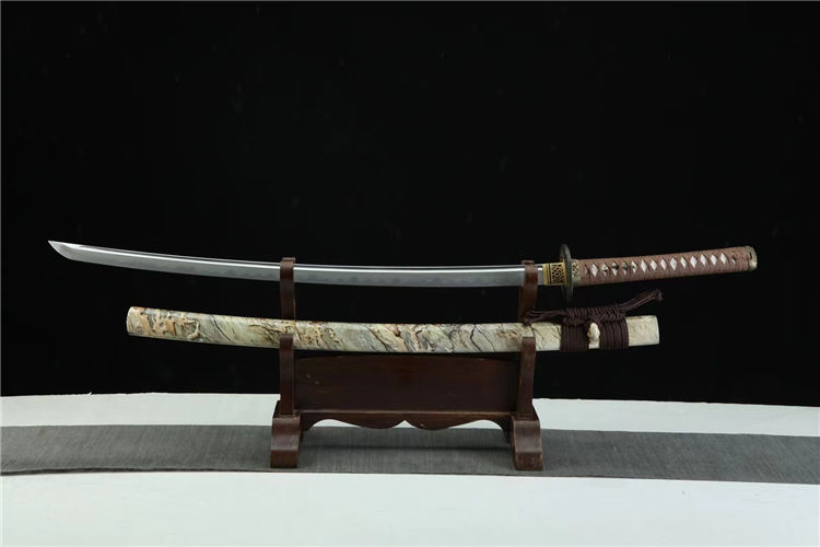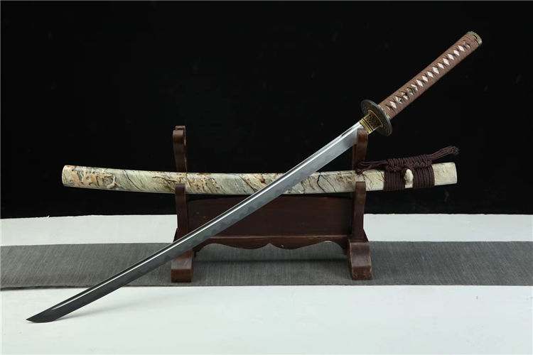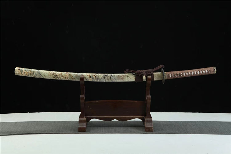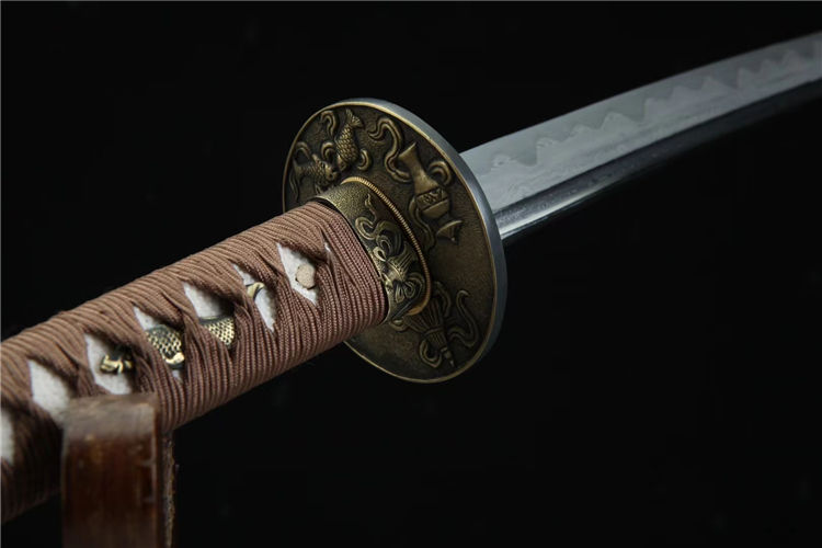 斗鱼武士刀 总长:103cm 刃长:71cm 柄长:27cm 刃宽:3.2cm 刃材:百炼钢 工艺:覆土烧刃,手工研磨 刀柄:真鱼皮,高级人绢经典正反缠法 装具:纯铜做旧 鞘材:水转印汽车烤漆鞘 配置:高端锦盒/油/布