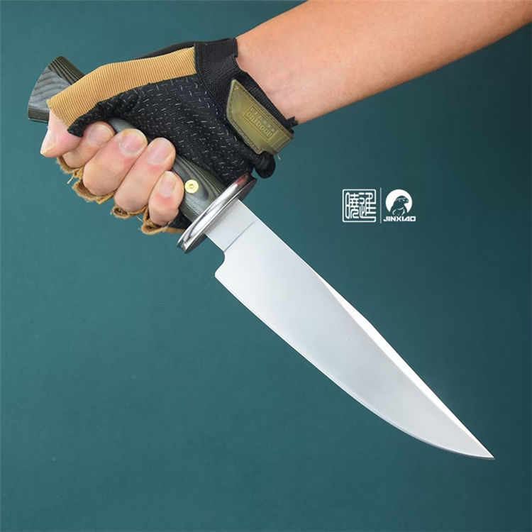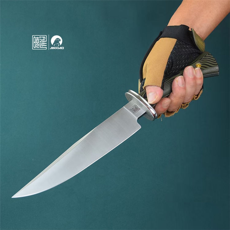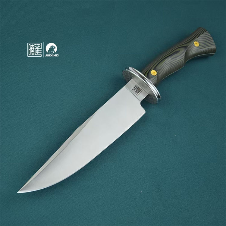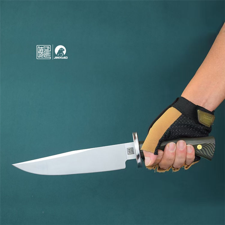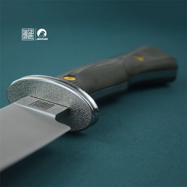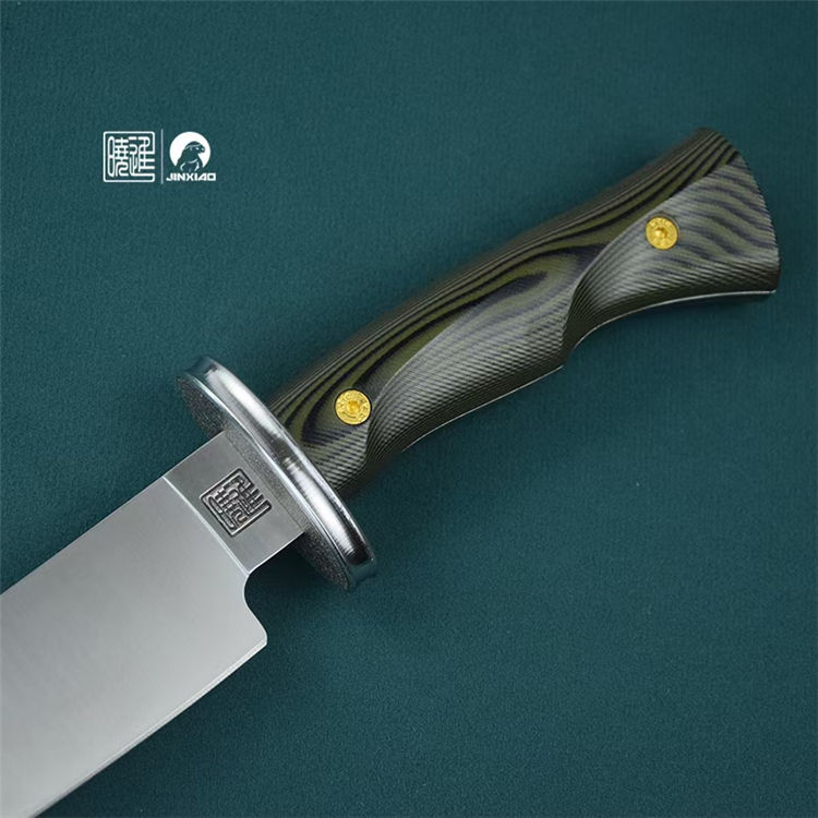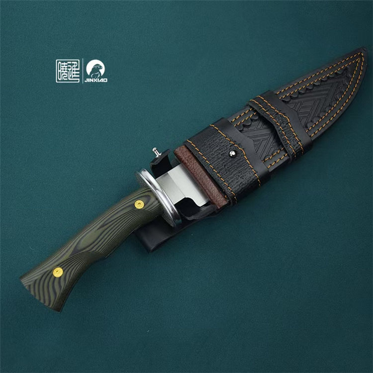 雁翎直刀 全长:340mm 刃厚:5mm 钢材:1095高碳钢 刃长:210mm 柄长:130mm 硬度:60H± 柄材:G10 刃宽:42mm 重量:435克 刀鞘:植鞣皮