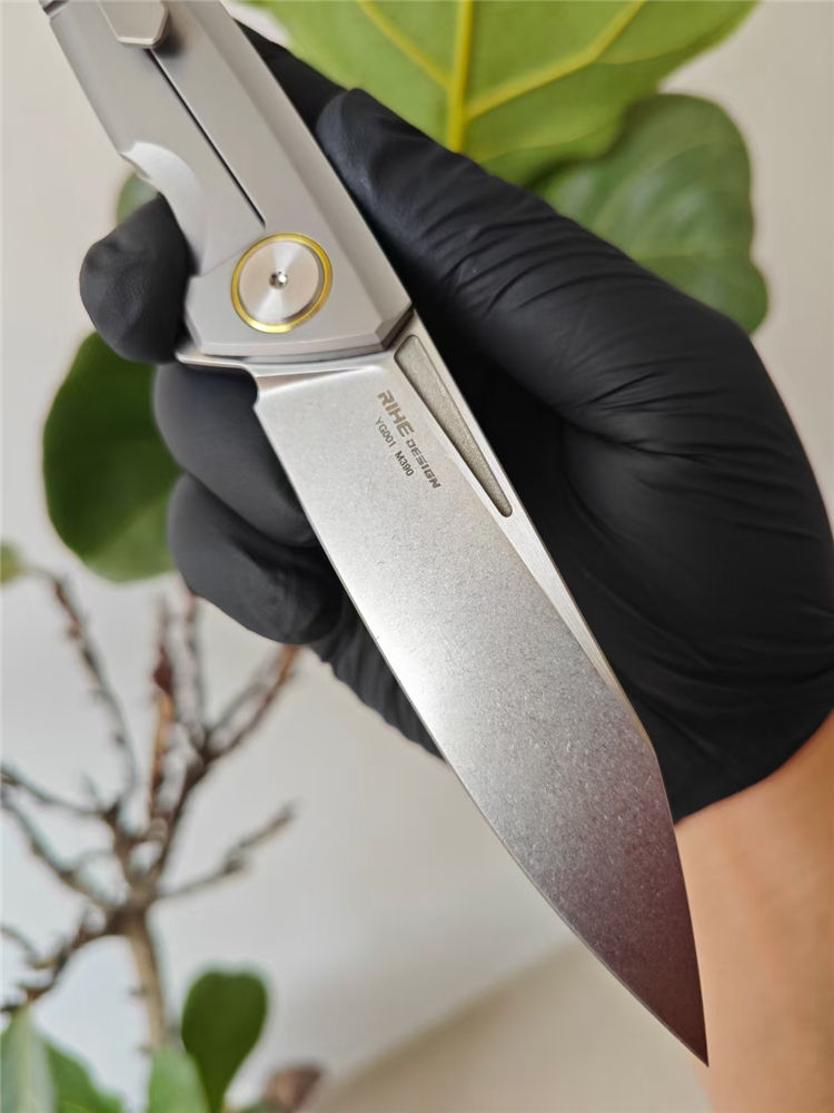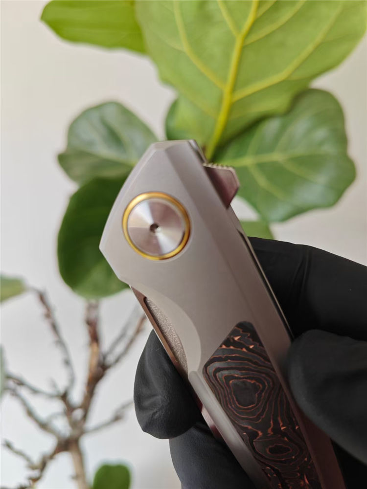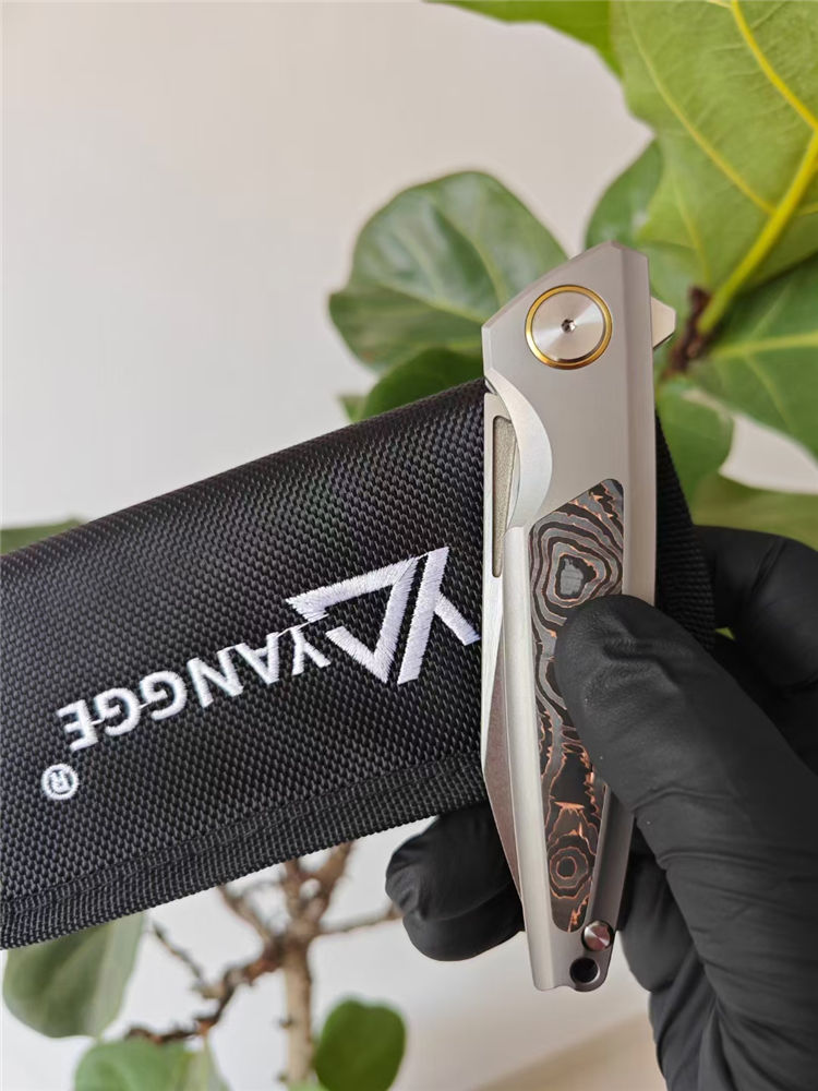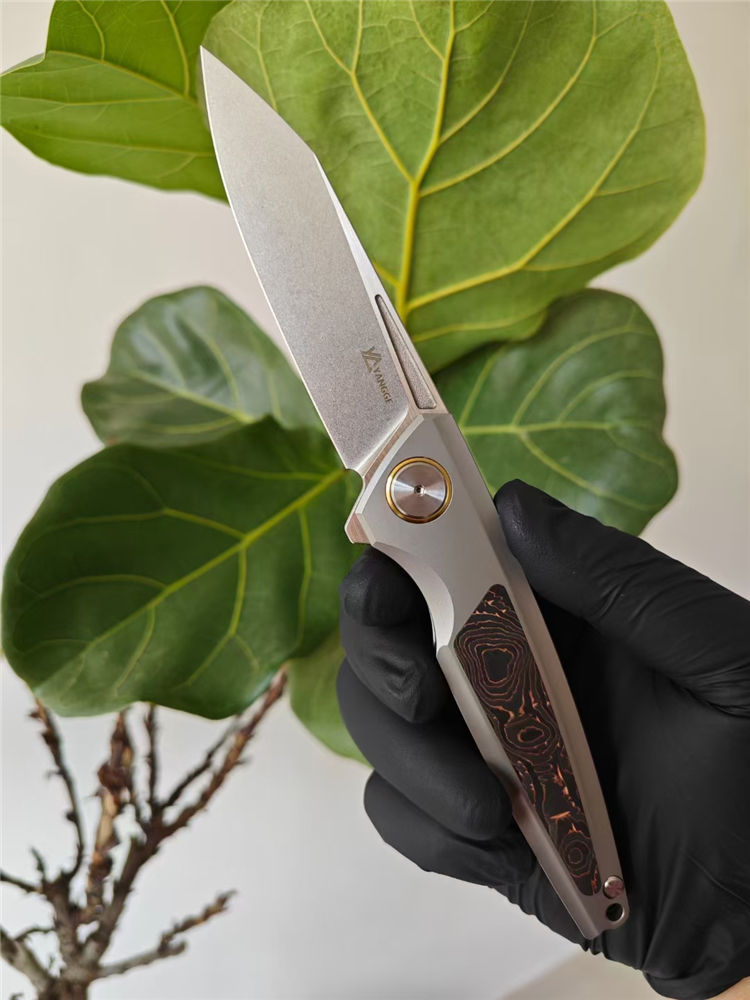YANGGE 001原创款折刀 全长:213mm 刃长:95mm 柄长:118mm 刃宽:26mm 刃厚:4mm 重量:131克 系统:滚珠轴承 刃材:进口M390钢 硬度:60-61HRC 表面:石洗+拉丝 柄材:TC4钛合金 表面:喷砂 贴片:铜粉碳纤维贴片 其他:黑色刀包