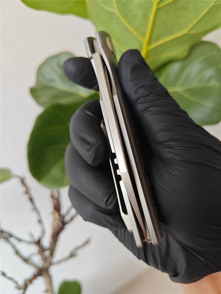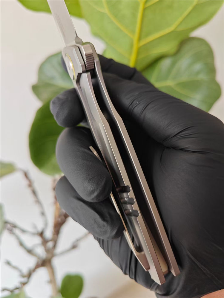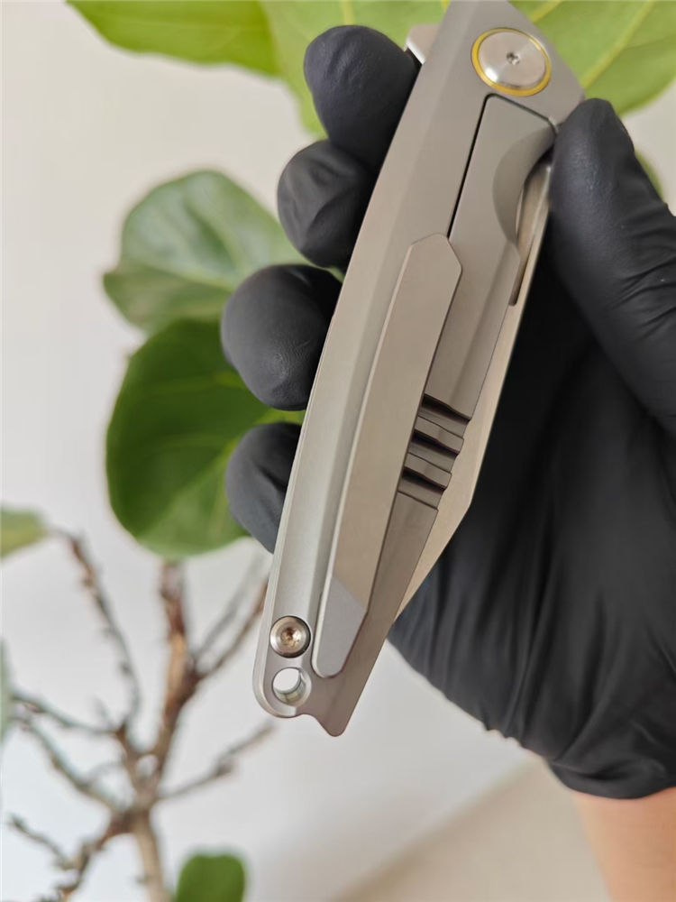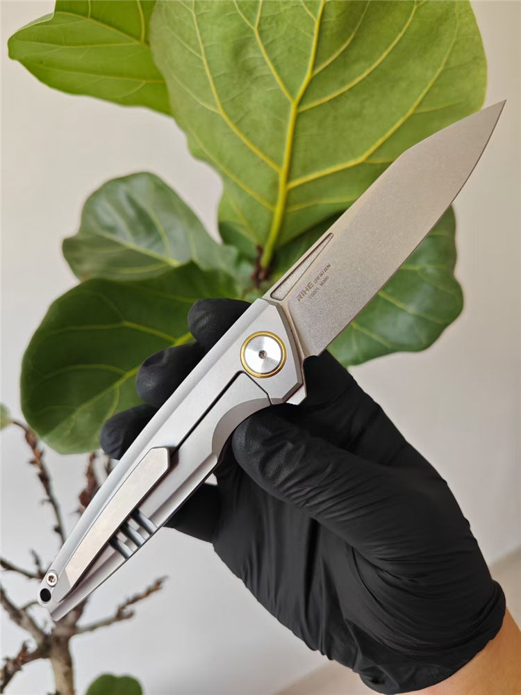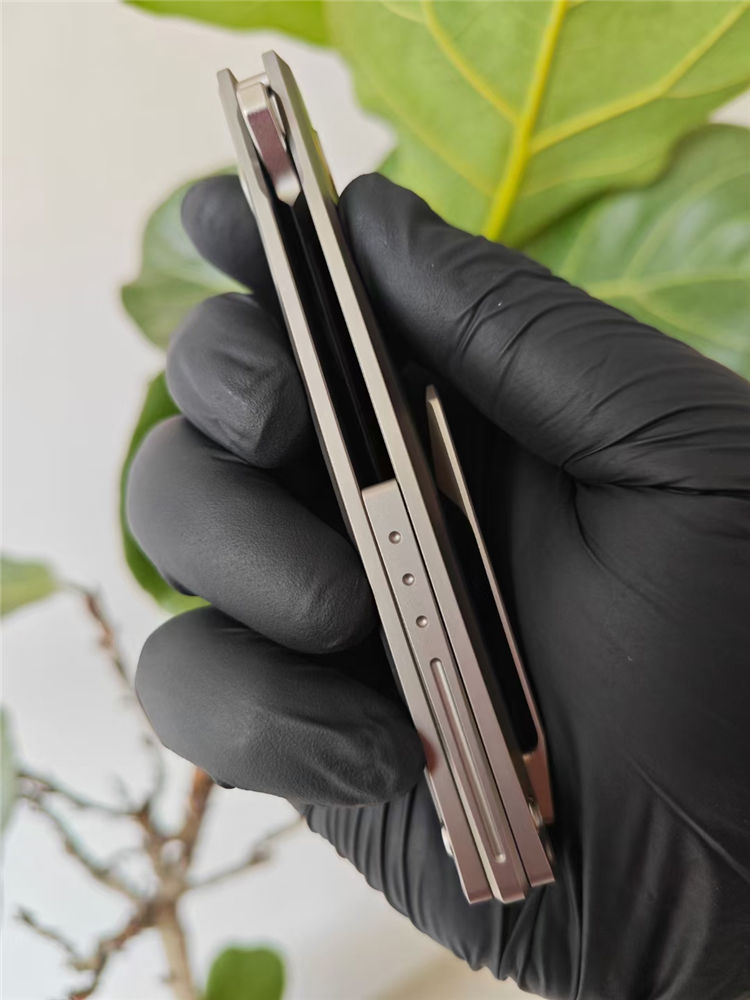 YANGGE 001原创款折刀 全长:213mm 刃长:95mm 柄长:118mm 刃宽:26mm 刃厚:4mm 重量:131克 系统:滚珠轴承 刃材:进口M390钢 硬度:60-61HRC 表面:石洗+拉丝 柄材:TC4钛合金 表面:喷砂 贴片:铜粉碳纤维贴片 其他:黑色刀包