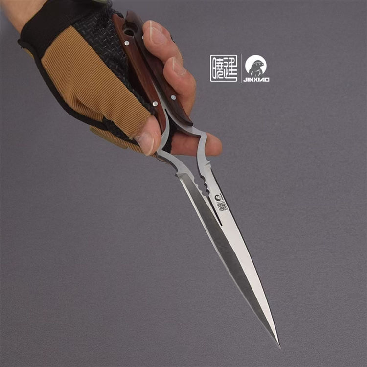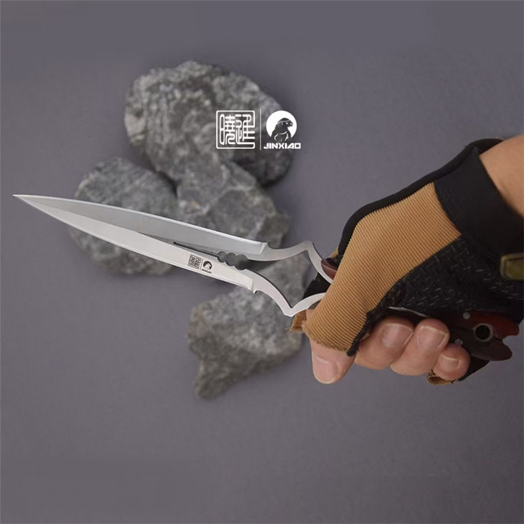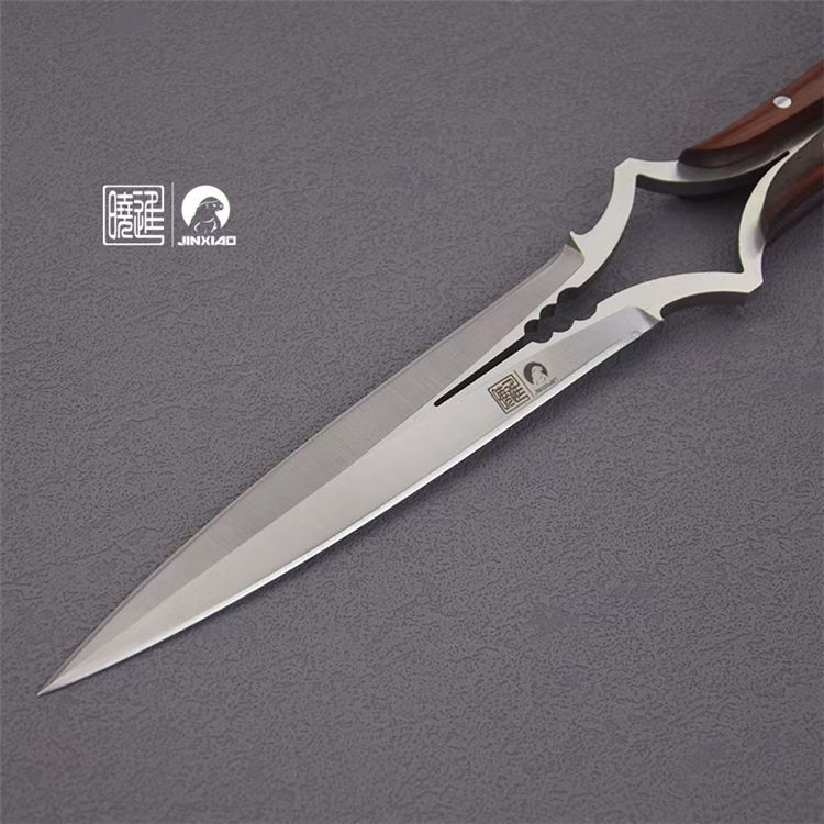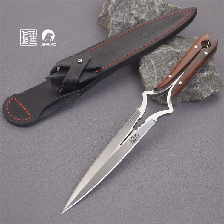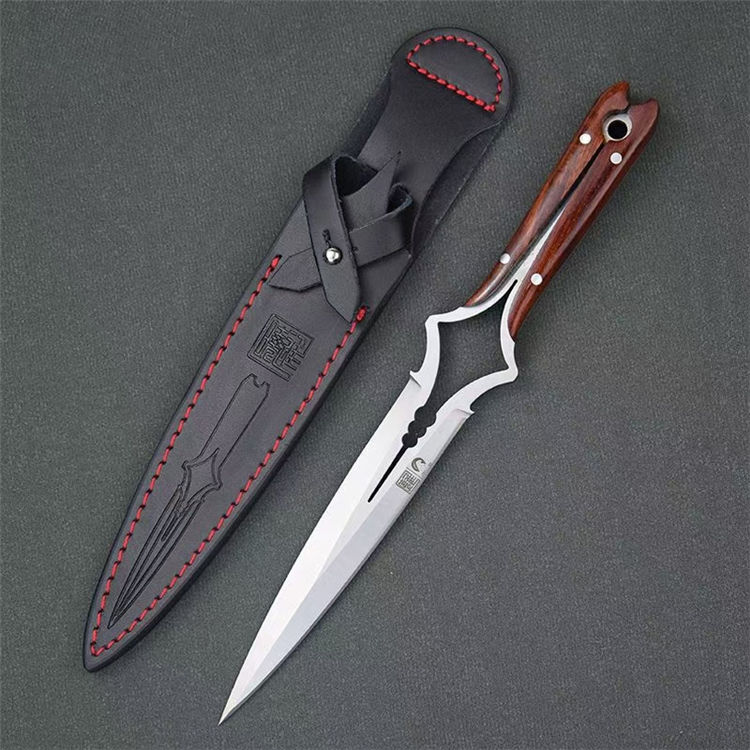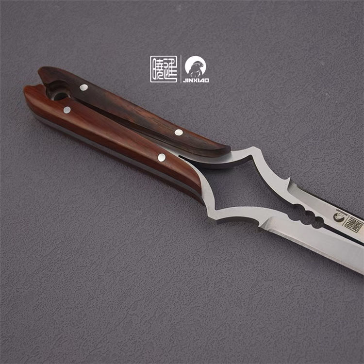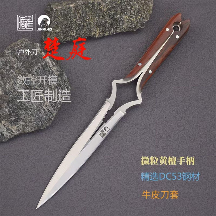 楚庭直刀 全长:280mm 刃长:145mm 柄长:350mm 刃材:碳钢 手柄:黄檀木 刀套:牛皮刀套