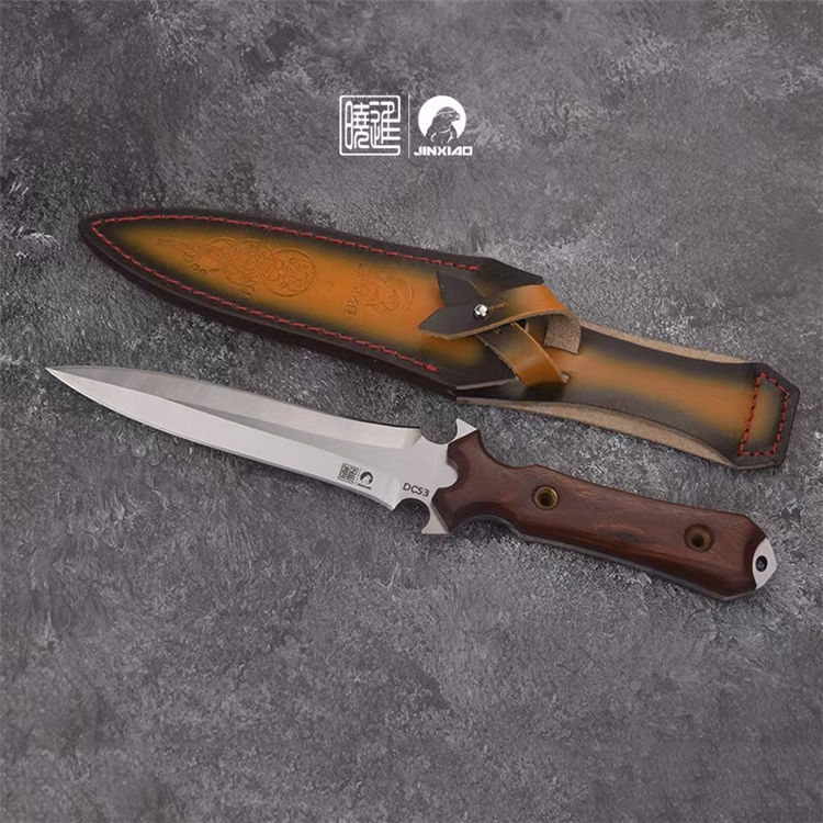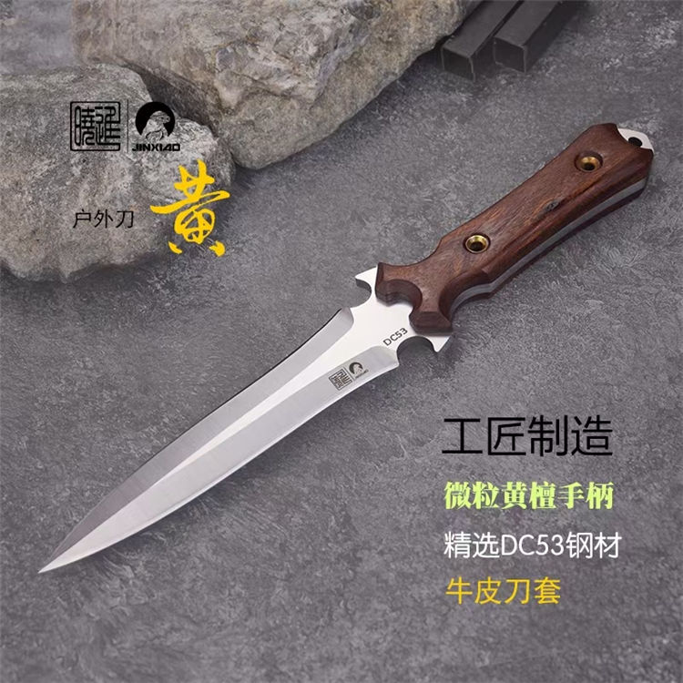 楚庭黄檀直刀 全长:280mm 刃长:145mm 柄长:350mm 刃材:碳钢 手柄:黄檀木 刀套:牛皮刀套