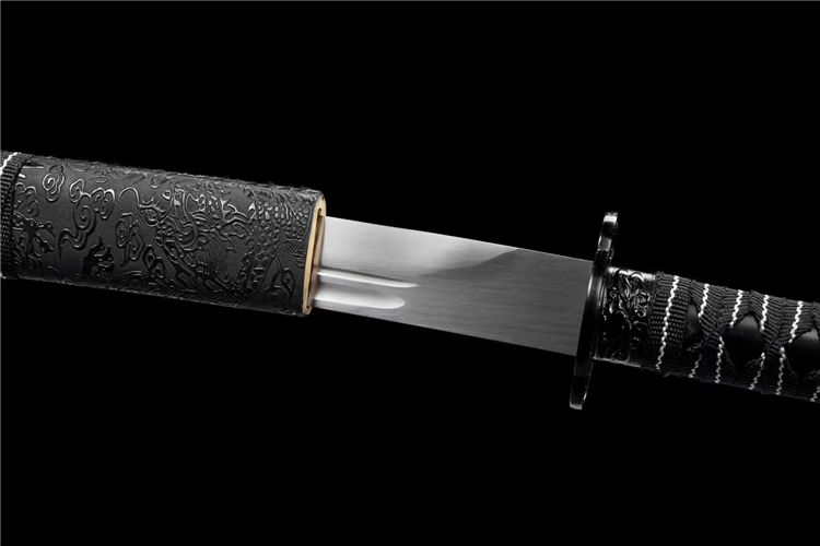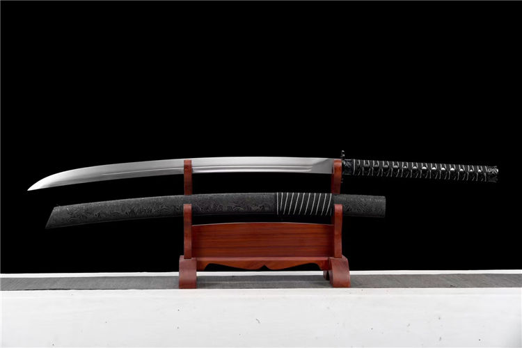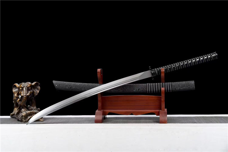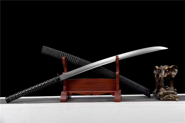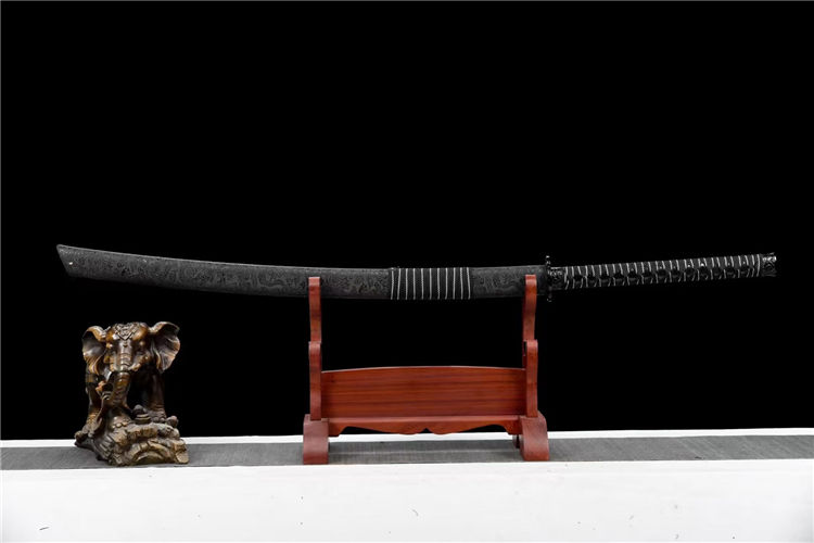 黑云斩马刀 全长:113cm 刃长:71cm 柄长:36cm 刃宽:最宽处3.7cm 刃厚:0.5厘米 材质:高锰钢 鞘材:实木包皮