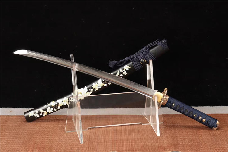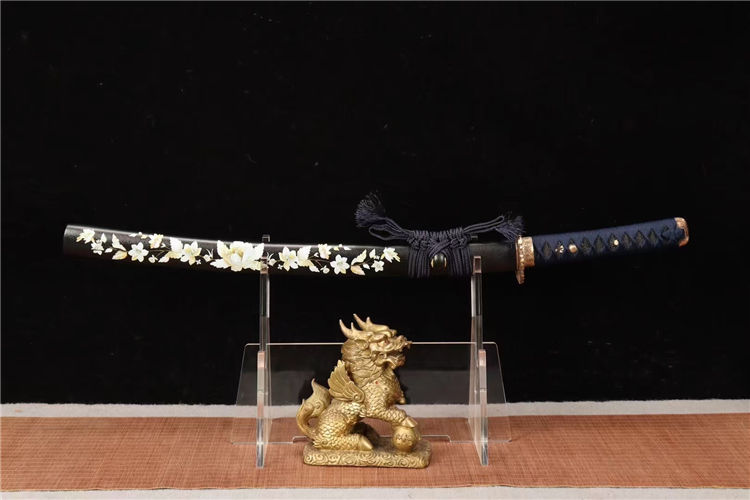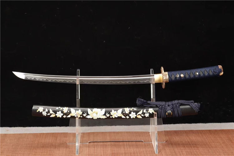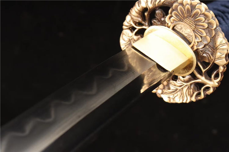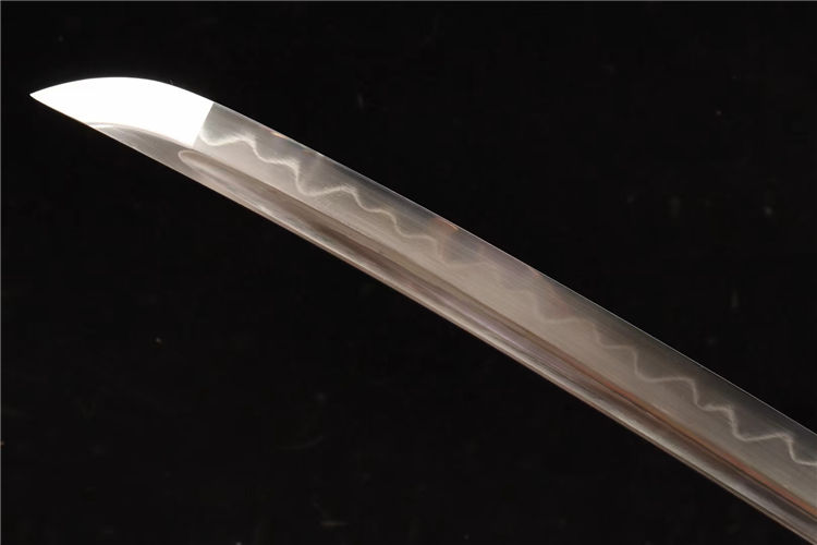 20寸T10烧刃铜装新款武士刀一此刃型为大V刃面平整锋利劈砍阻力小,整体刀型由刀簇向刀尖径向逐渐加宽,轴向渐薄锻打,特价钢覆土烧刃,16道手工研磨