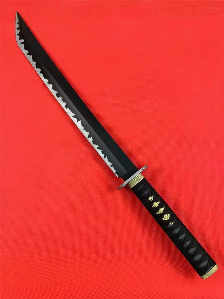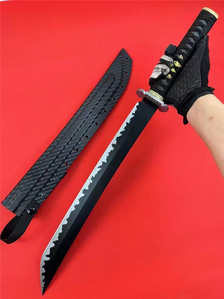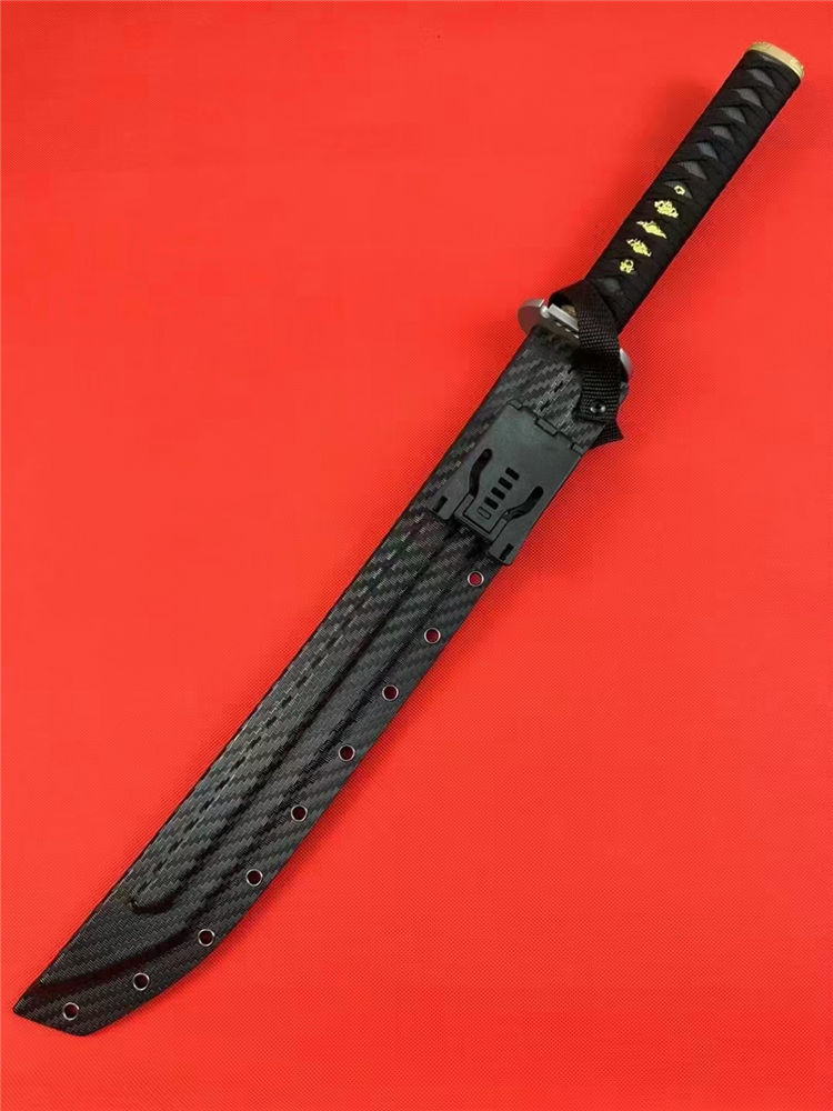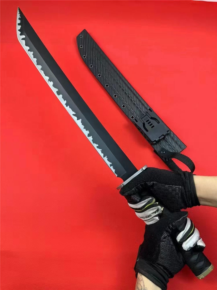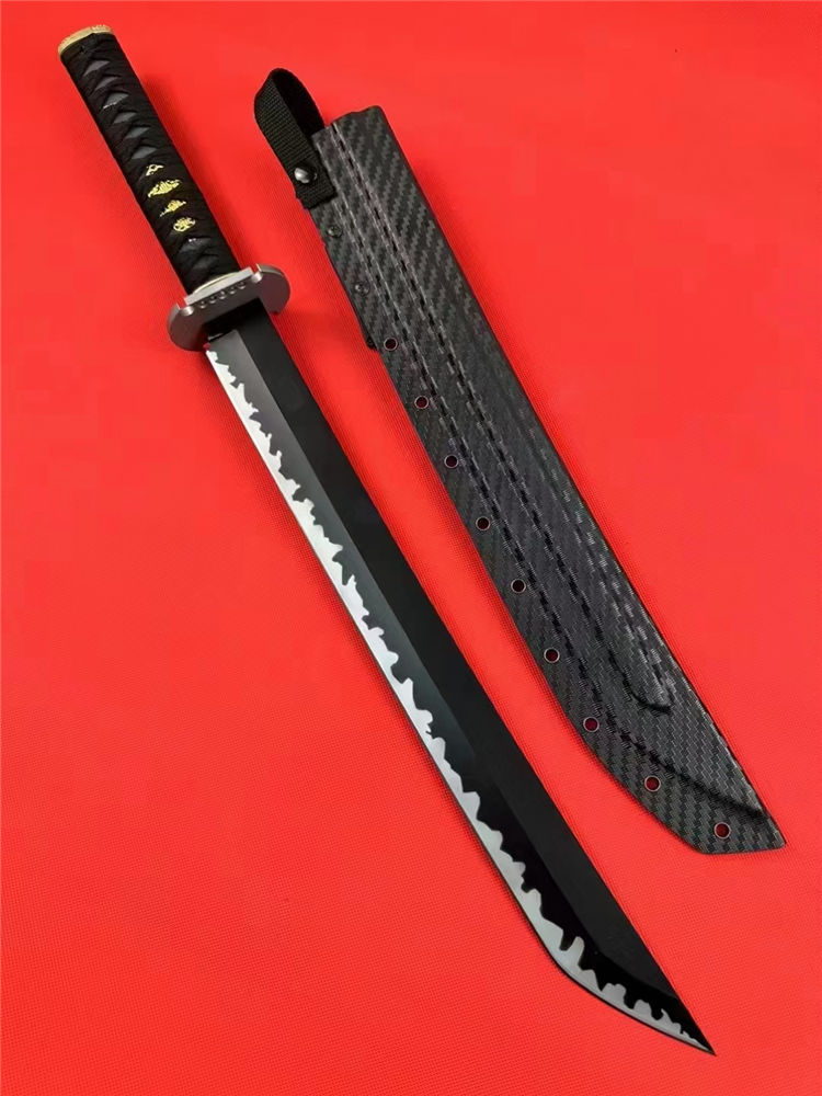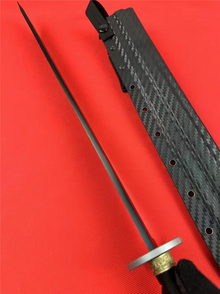 Domestic金刚开山砍刀 全长:67cm 刃长:44cm 刃宽:4.1cm 刃厚:0.53cm 刃材:60Si2CrVA 硬度:60hrc 柄材:g10柄十缠绳柄 合金装饰装具+纯钢刀谭 热处理:整淬 表面:特氟龙涂层黑钛太空灰纹 鞘材:碳纤维K鞘 净重:900克连刀鞘:1080