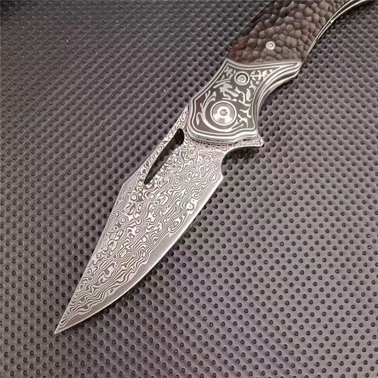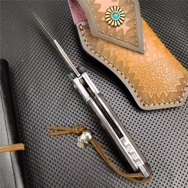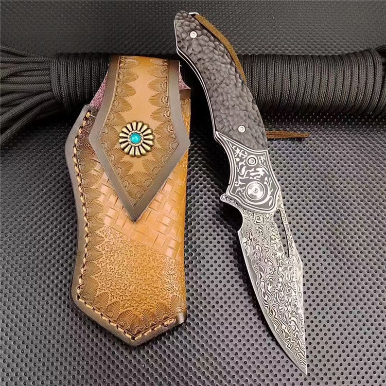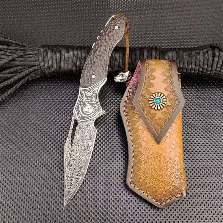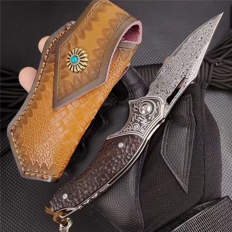 大马士革沧龙折刀 总长:19.6cm 刃长:8.3cm 柄长:11.3cm 刃厚:2.8cm 钢材:进口VG10钢芯大马士革 表面:复古黑白锻造纹理 硬度:60-62HRC真空热处理 柄材:黑檀木+钢头石洗 皮套:意大利进口手工雕花植鞣雕花牛皮套 重量:205.8g(含鞘) 毛重:292g(含包装合) 包装:精品礼品盒子包装