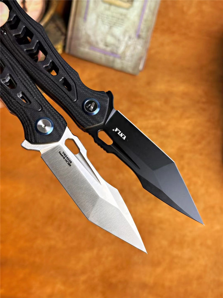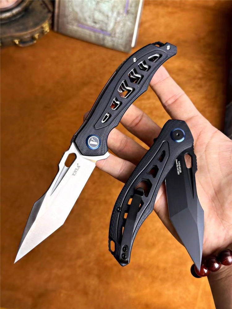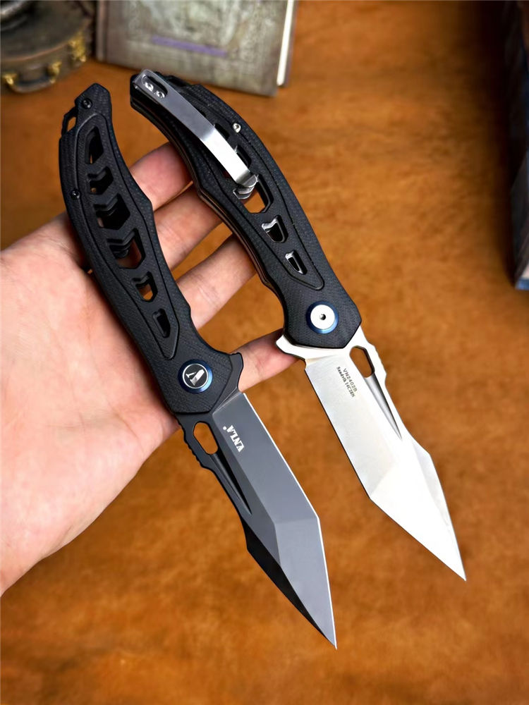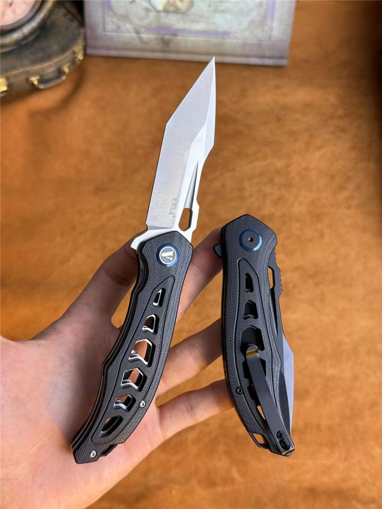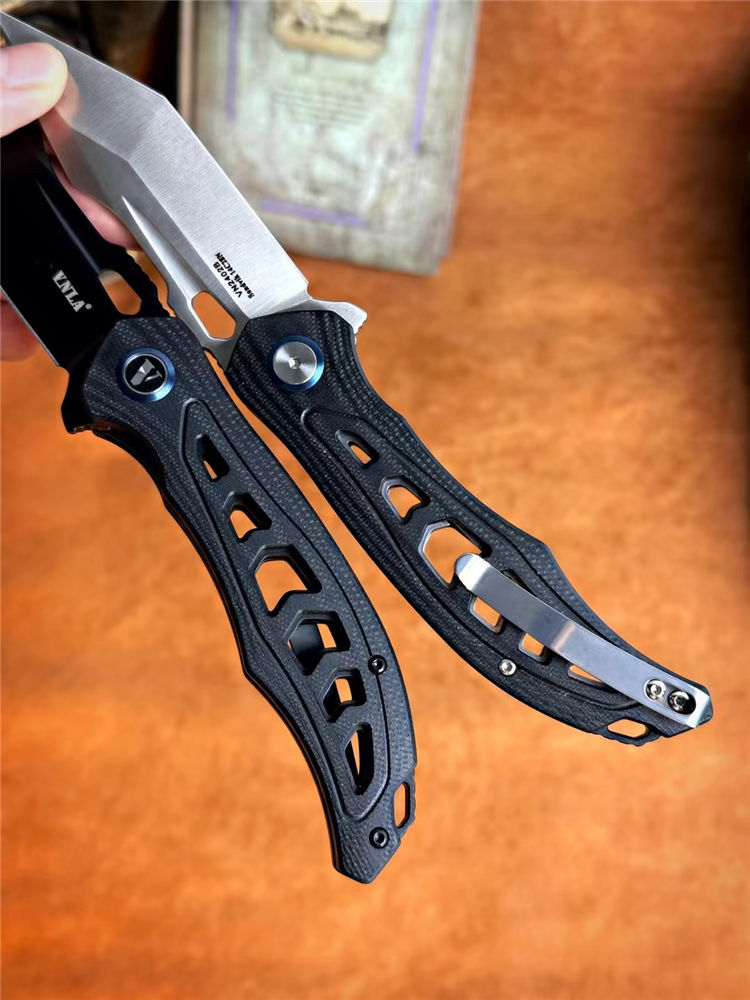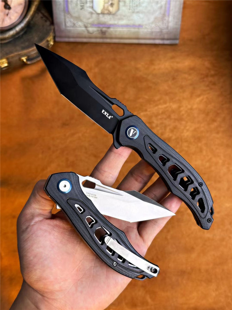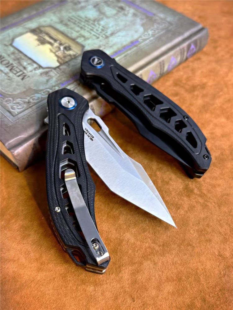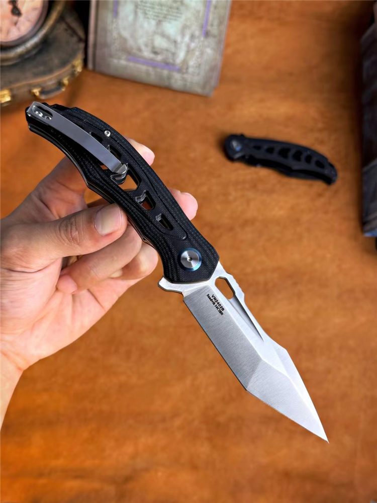 领航一号折刀 总长:21.3cm 刀片:9.3cm 手柄:12.3cm 刃厚:3.5mm 刃宽:3cm 钢材:14C28N钢 硬度:60HRC 表面:砂光和黑钛两种效果、陶瓷轴承系统 柄材:进口G-10材质镂空设计 重量:120g 包装:黑色手工硬盒