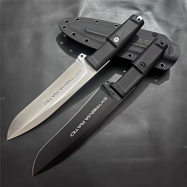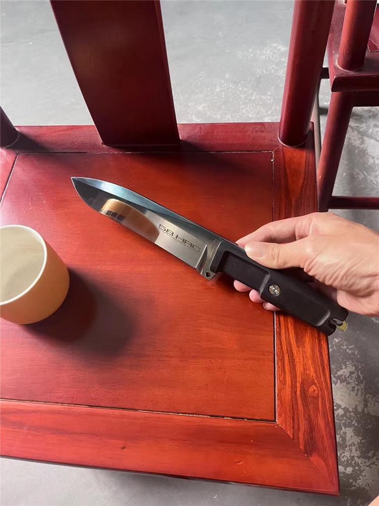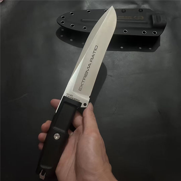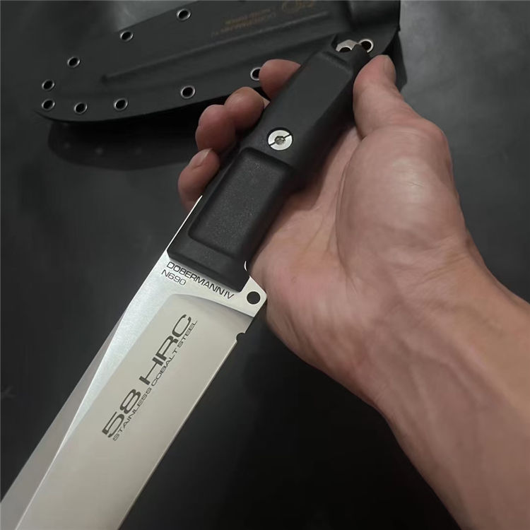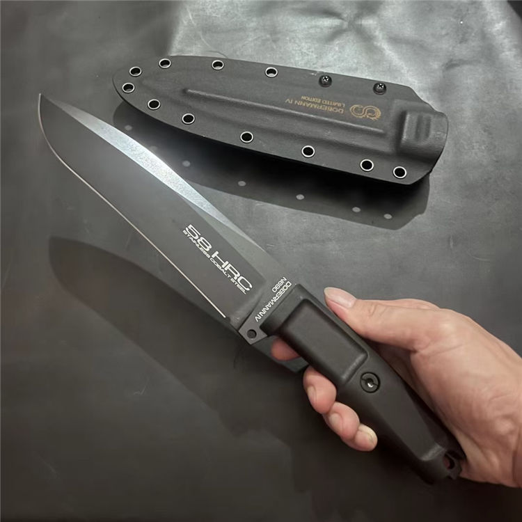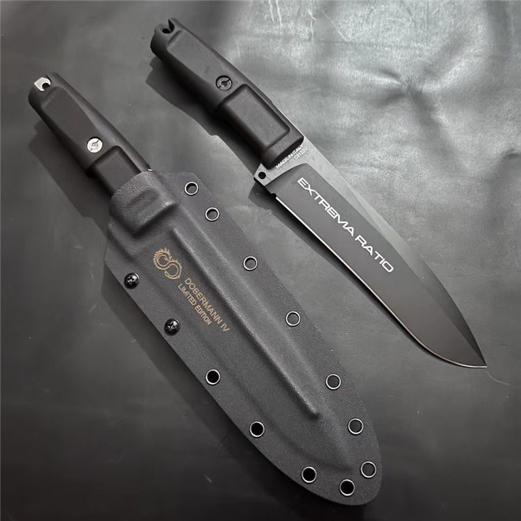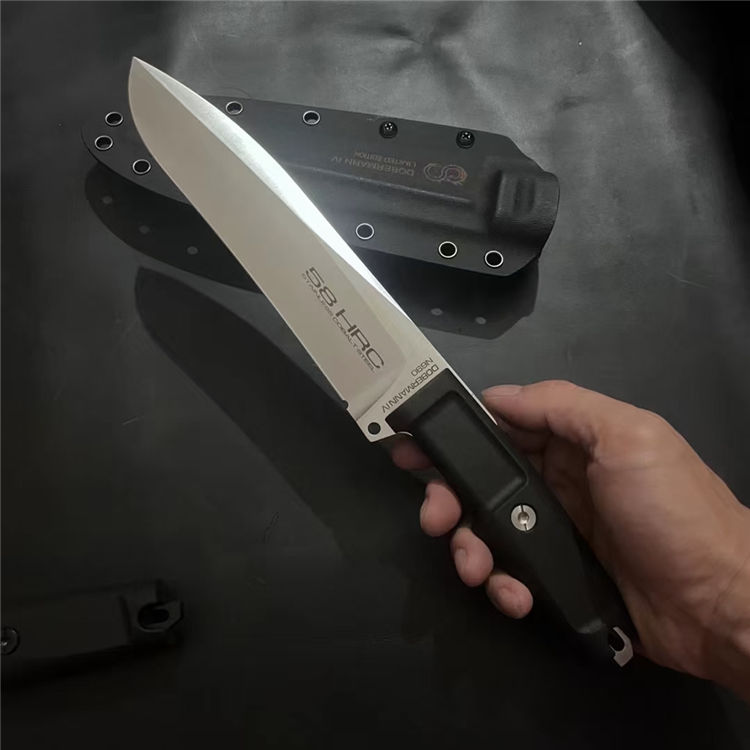 极端武力杜宾犬4代战术版直刀 全长:31.5cm 刃长:17cm 刃厚:0.6cm 刃宽:4.15cm 材质:A8 硬度:60HRC 柄材:Forprene 重量:350克 产地:中国 刀套:黑色战术K鞘 带背夹