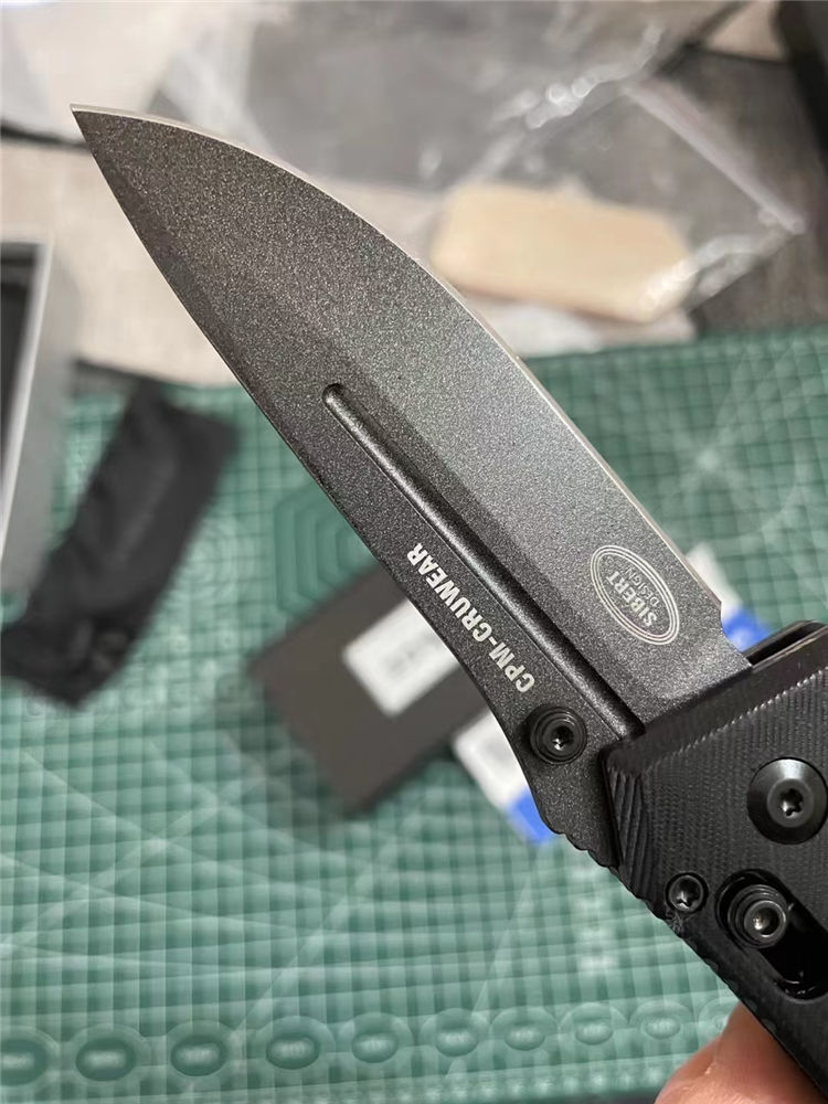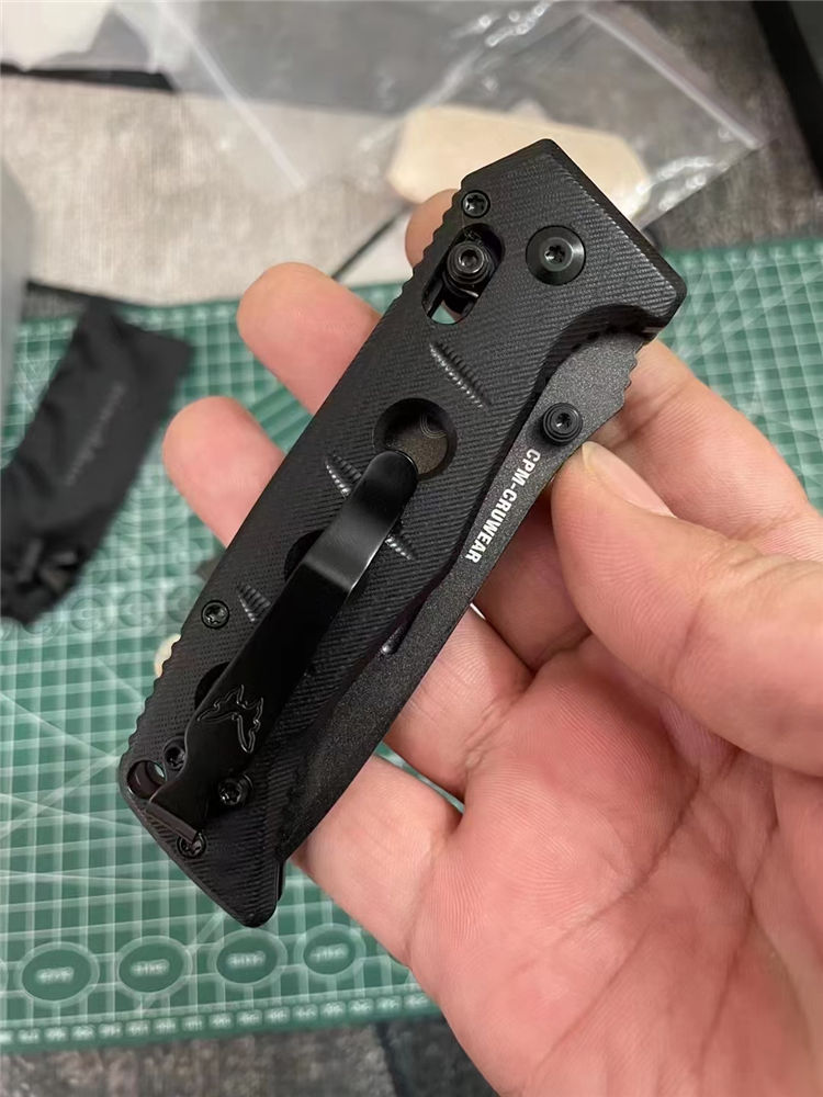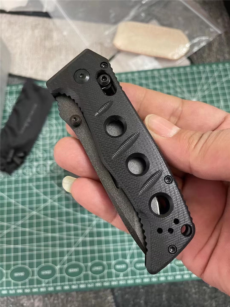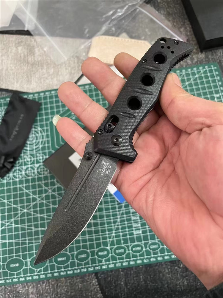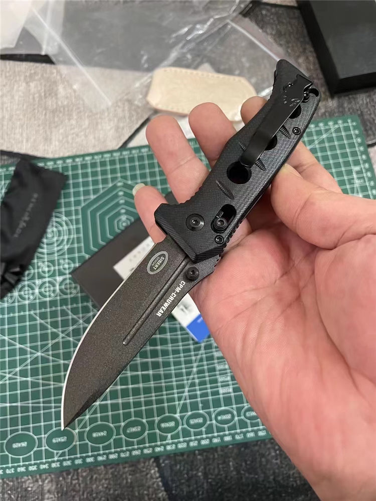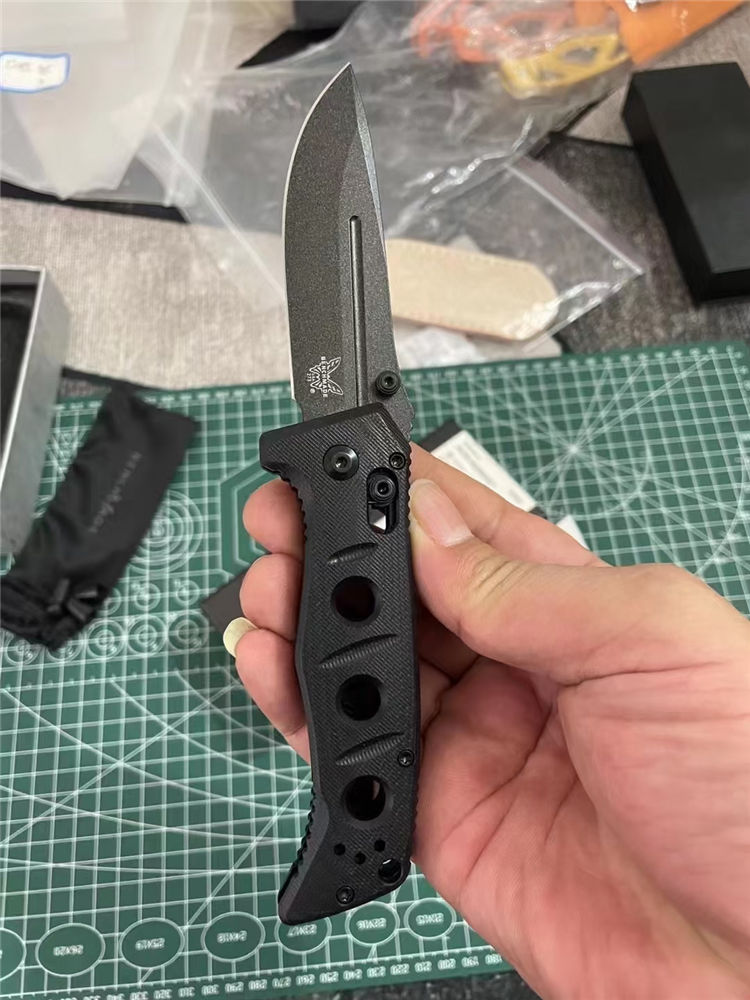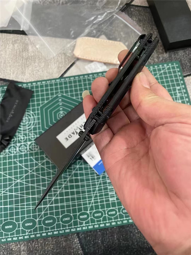 蝴蝶BM273折刀 全长:19.2CM 刃长:8.5CM 柄长:10.7CM 刃宽:28mm(最宽处) 刃厚:3mm 刃材:D2钢 刀重:113克 硬度:58HRC 表面:黑色镀钛/金色 柄材:G10 包装:原装盒子