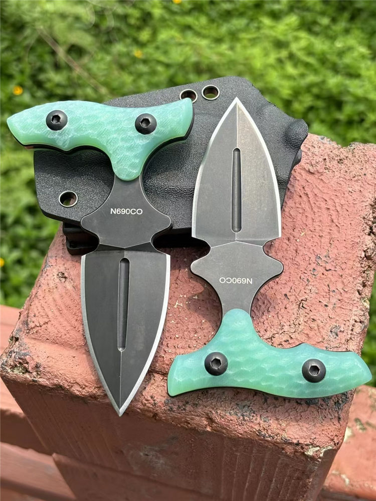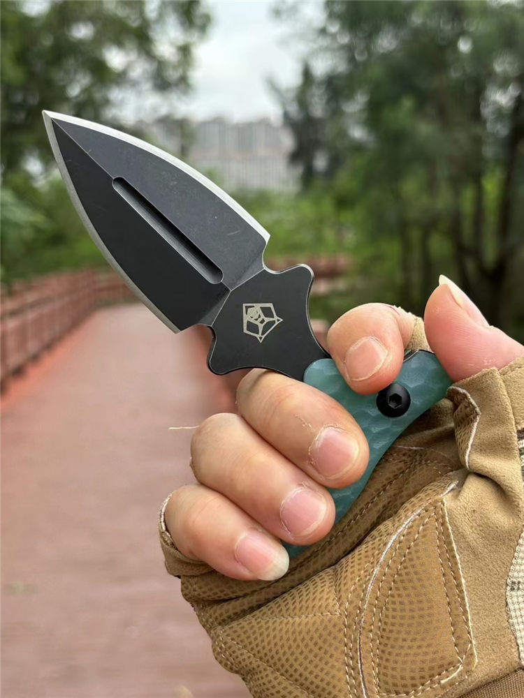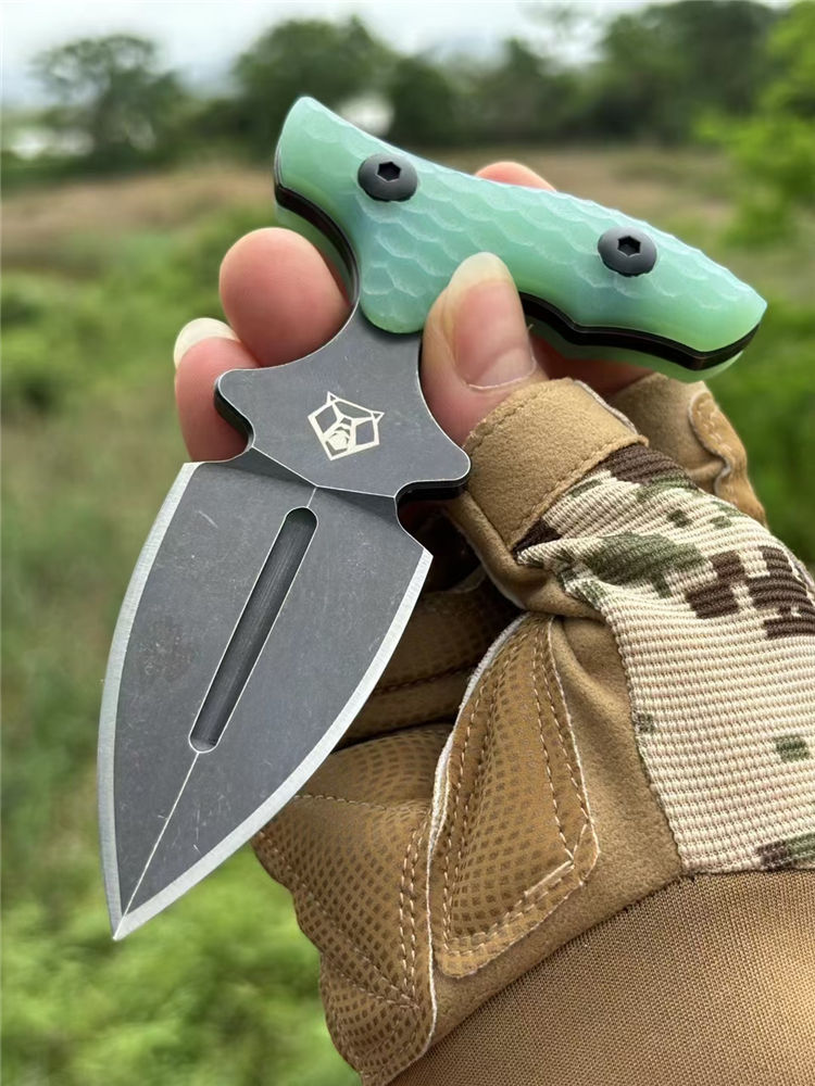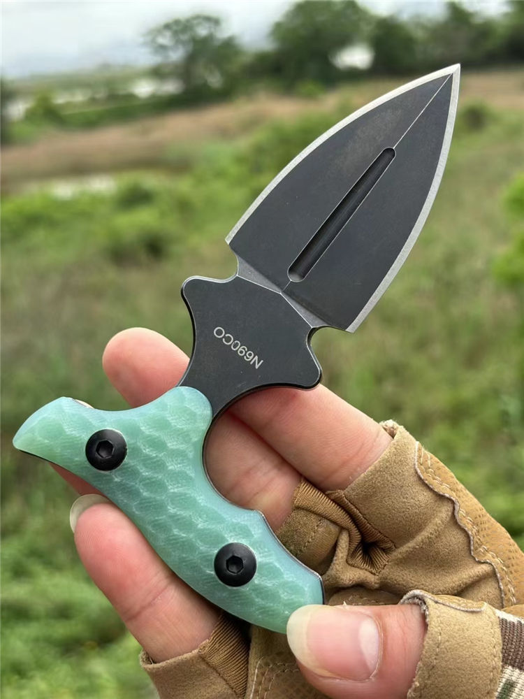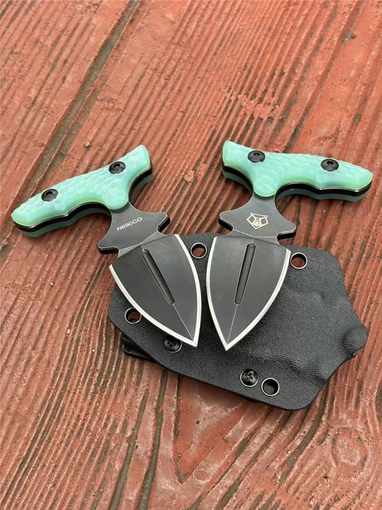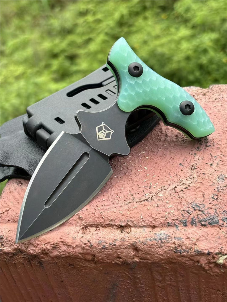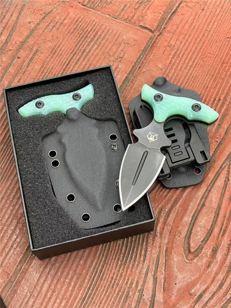 熊头手刺 全长:127mm 刃长:63mm 刃材:9cr18mov 硬度:59-60HRC 表面:镀钛 刃厚:5mm 柄长:79mm 柄材:翡翠色G10柄 重量:单手刺145g 重量:246g含K鞘,含包装365g 刀套:K鞘 包装:黑色内含海绵垫礼盒装