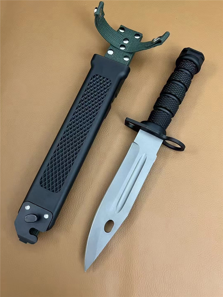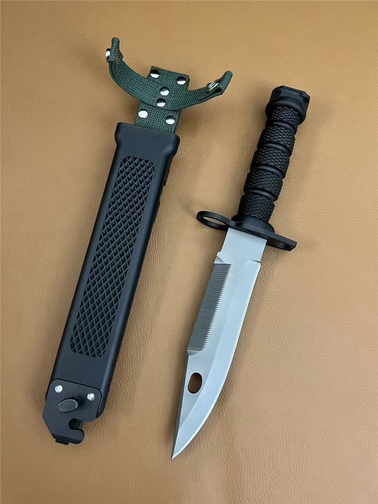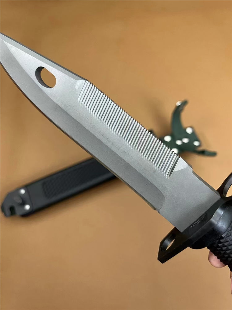 一体精装无字版95式多功能刀 全长:30.2cm 刃长:17.8cm 刃厚:0.4cm 刃宽:3.5cm 刃材:7Cr17Mo军用不锈钢 (这个不是一般的钢是军用钢) 硬度:58~60HRC 高铬合金不锈钢 95式步枪多用途刺刀具有剪、锯、锉、砍等多种功能。由于刺刀在使用时,要求耐磨、强度好、潮湿气候不生锈等